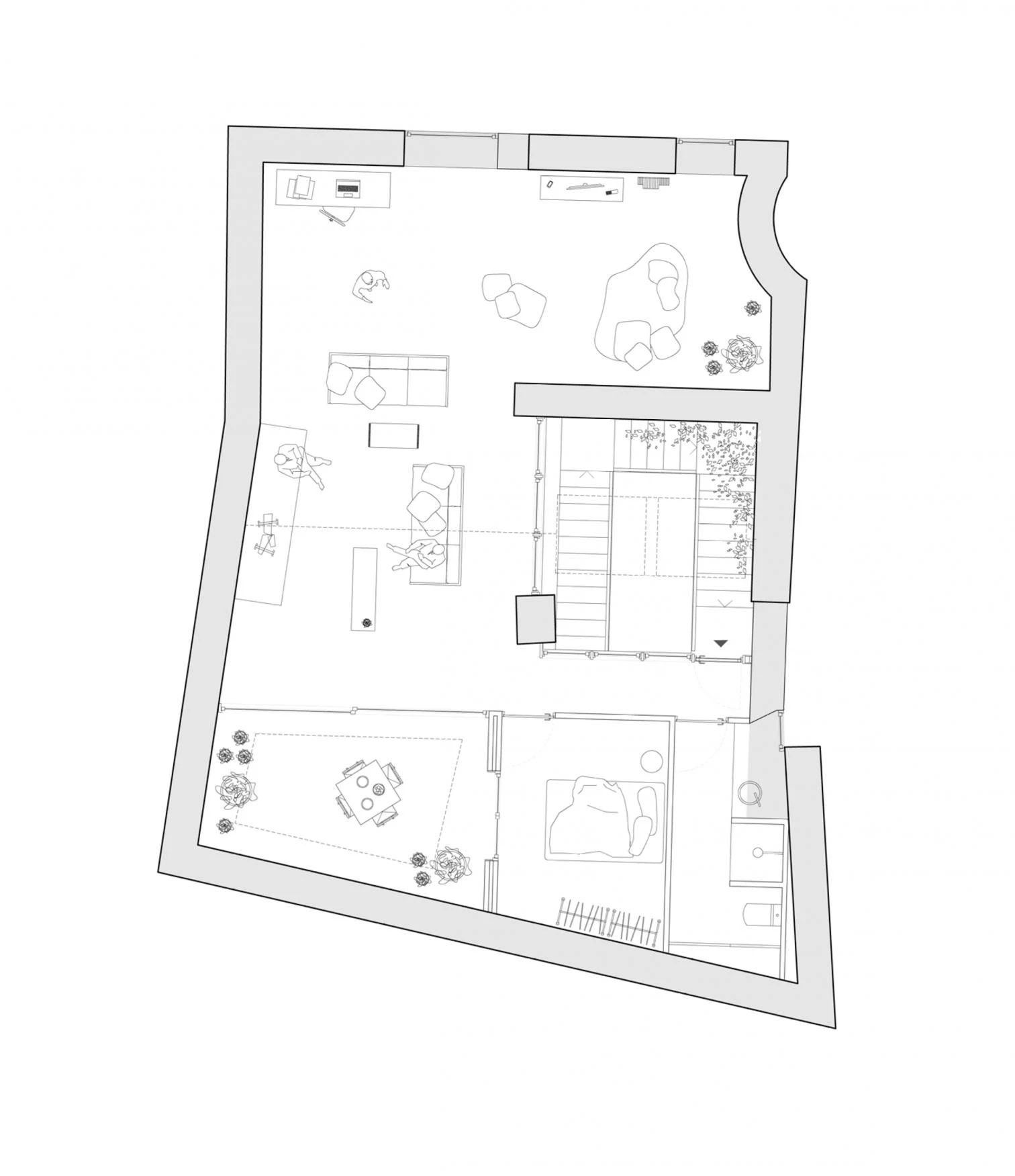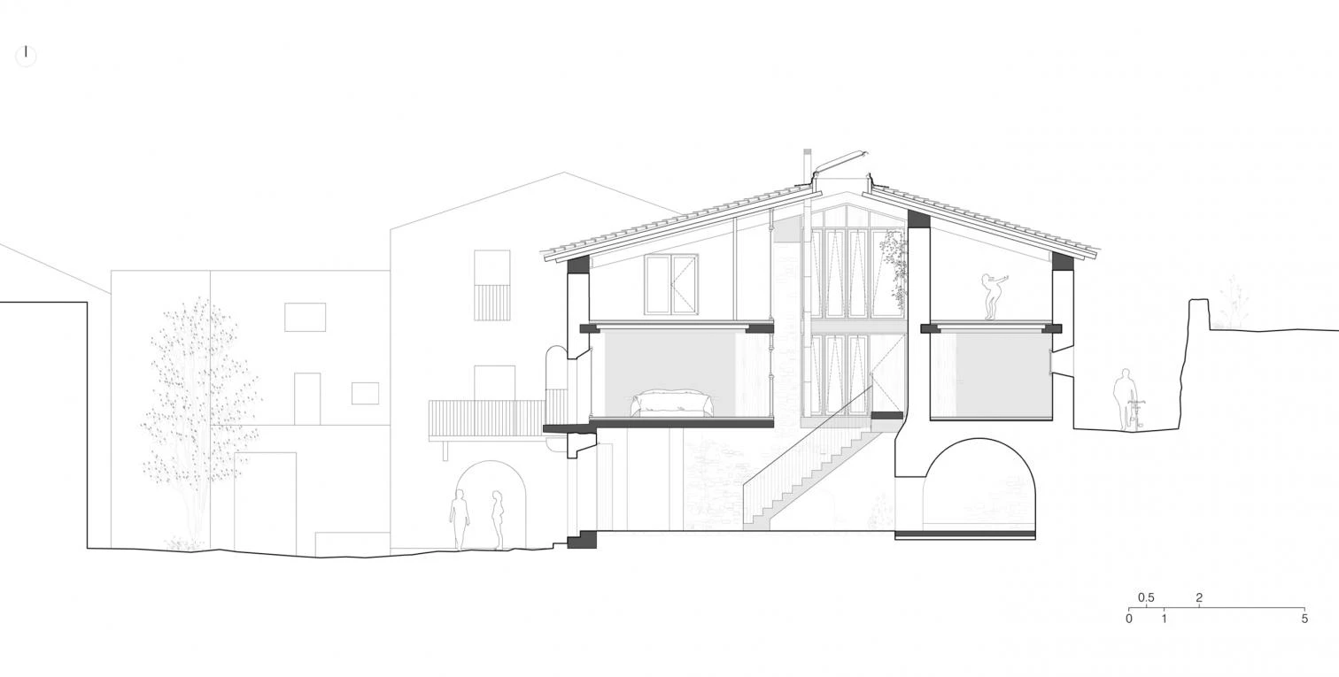 Los nervios de hormigón definen los espacios interiores, unen las cuatro fachadas y reducen el pandeo de los muros, fijándolos desde su punto medio, para que soporten el peso de la nueva cubierta de madera. Uno de los seis cuadrantes de la matriz estructural se vacía para generar un patio vertical que permite el acceso a los tres niveles de la vivienda, la iluminación de los espacios interiores, y la ventilación natural de la planta sótano.