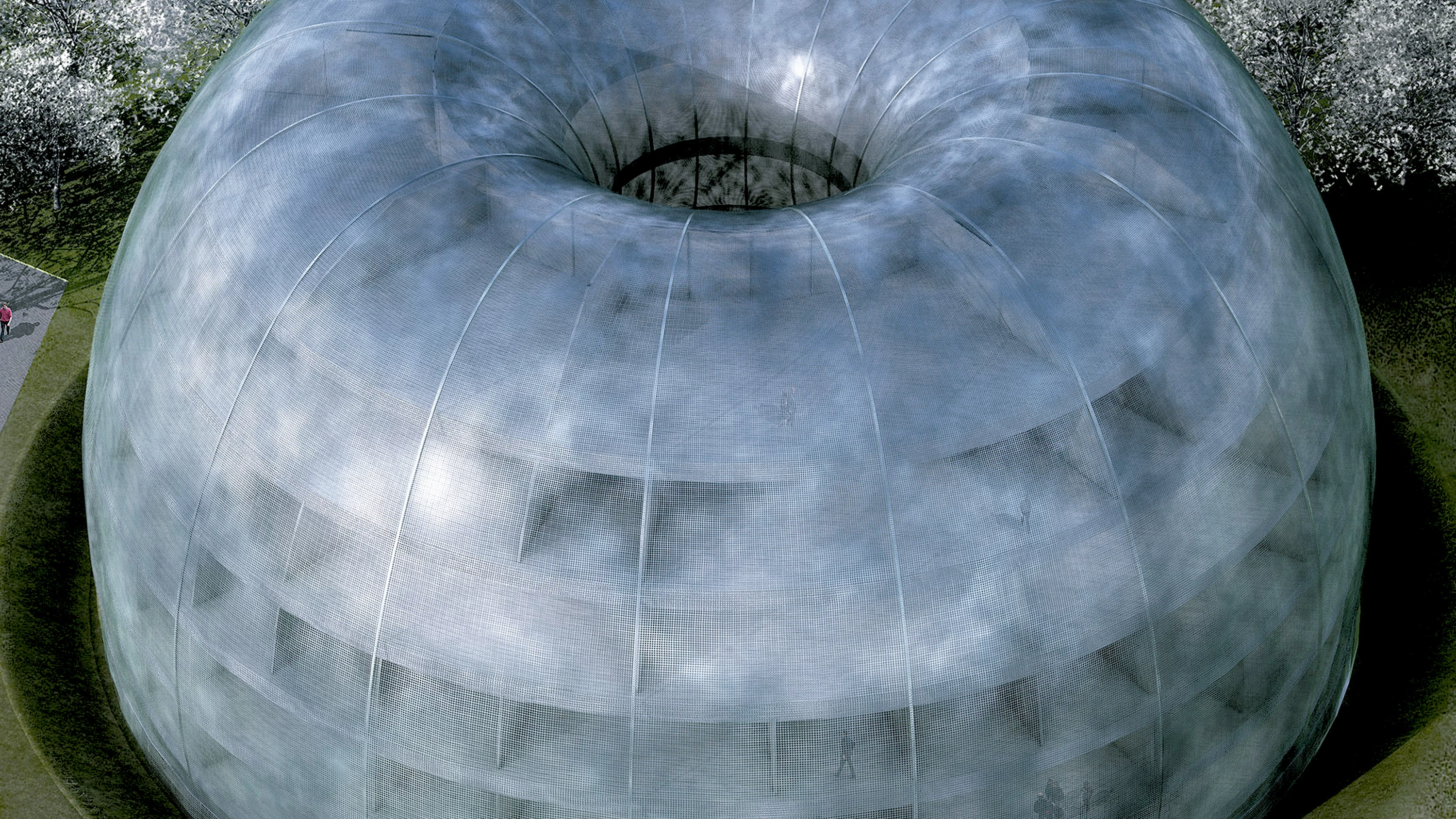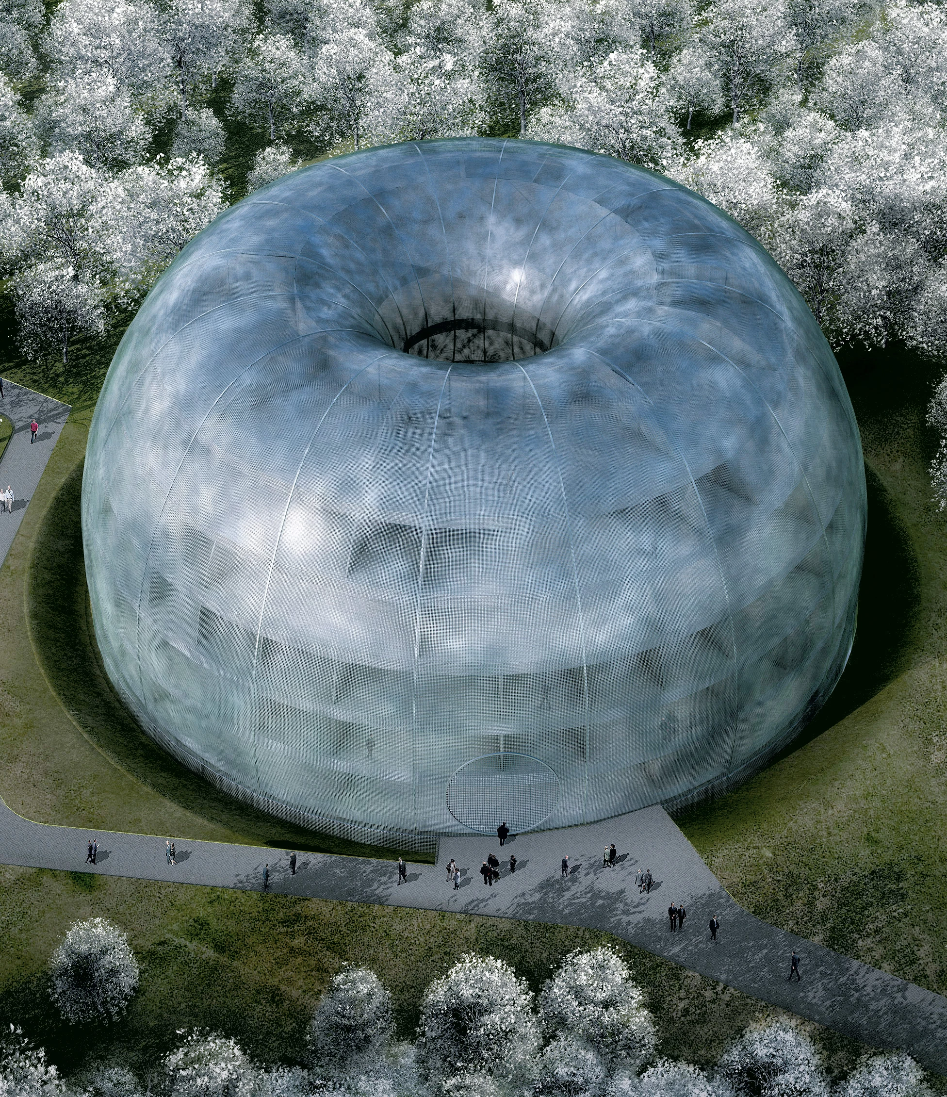 La volumetría del edificio se define a partir de dos esferas y un toro, con una envolvente continua constituida por una membrana metálica con perforaciones circulares de radio variable. El núcleo alberga un gran atrio interior de forma esférica y carácter monumental, en torno al cual se disponen los espacios de acceso... [+]