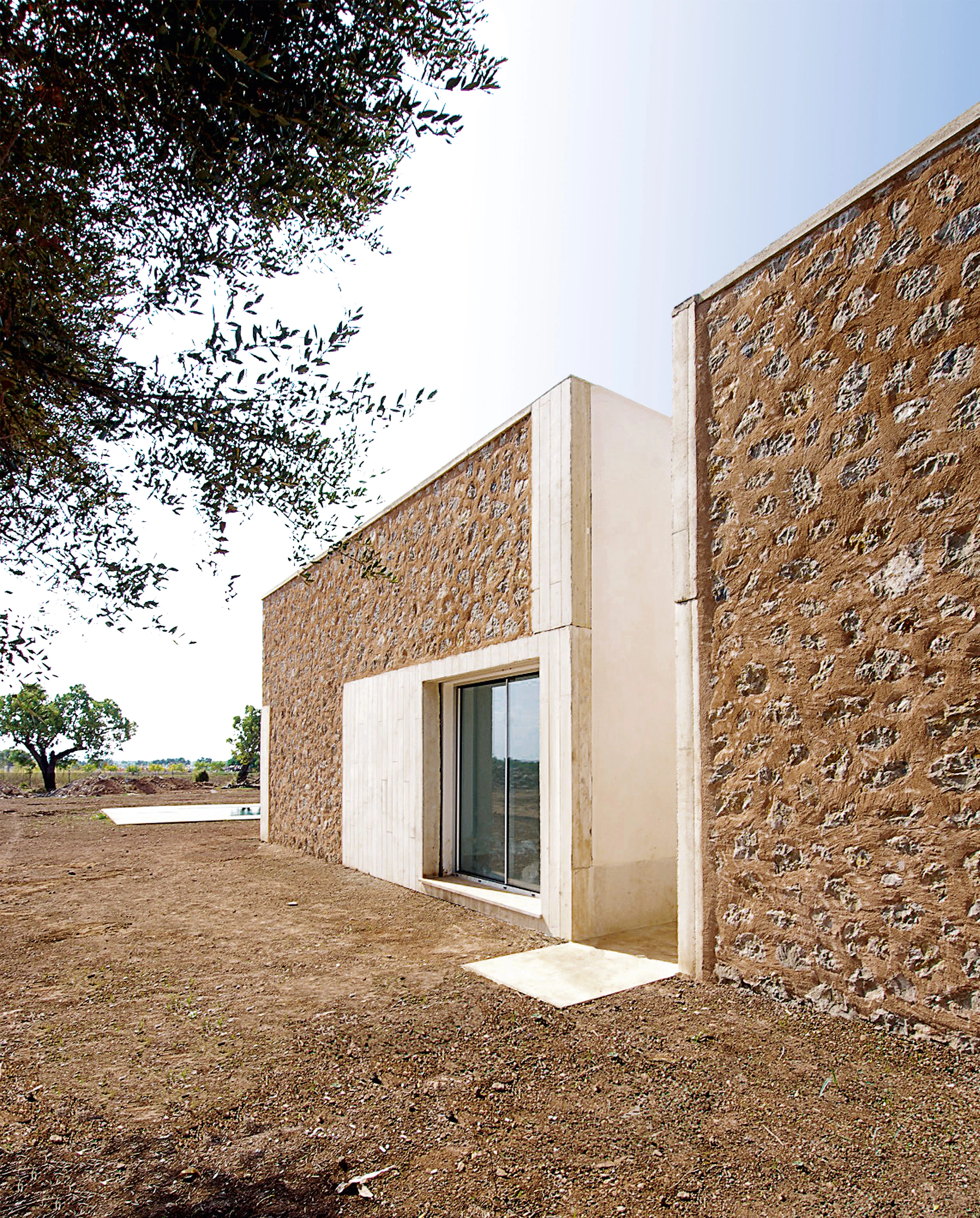 El contexto también explica el sistema constructivo de la casa, con sus muros levantados con piedras extraídas de la propia parcela y rejuntadas con la tierra rojiza del lugar. Un marco de hormigón encinta cada una de las ventanas.