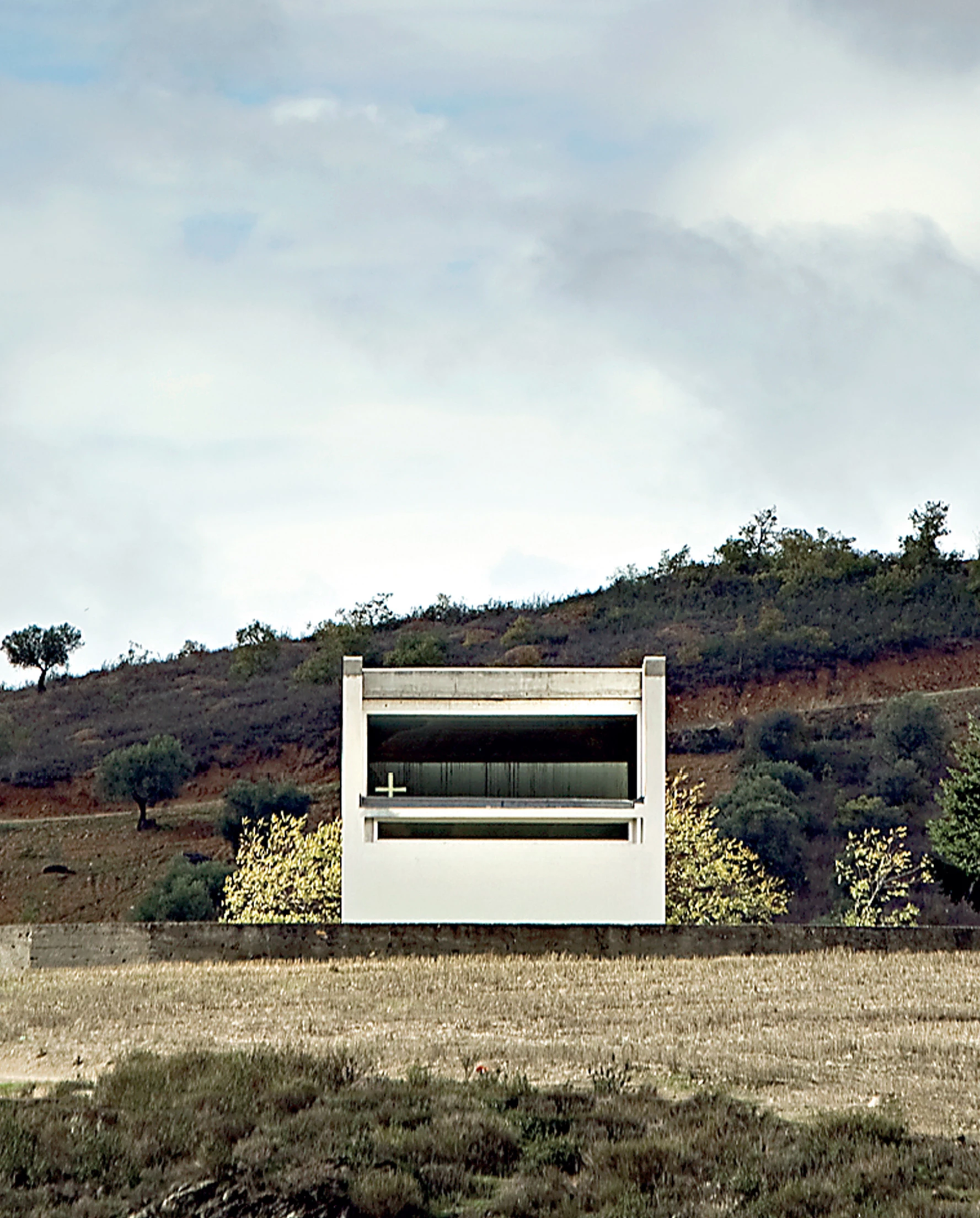 El terreno montañoso de Trás-os-Montes sirve de marco al sencillo prisma blanco de la capilla, en el que destacan la presencia de grandes ventanales abiertos al paisaje y de una puerta corredera de madera en el acceso.
