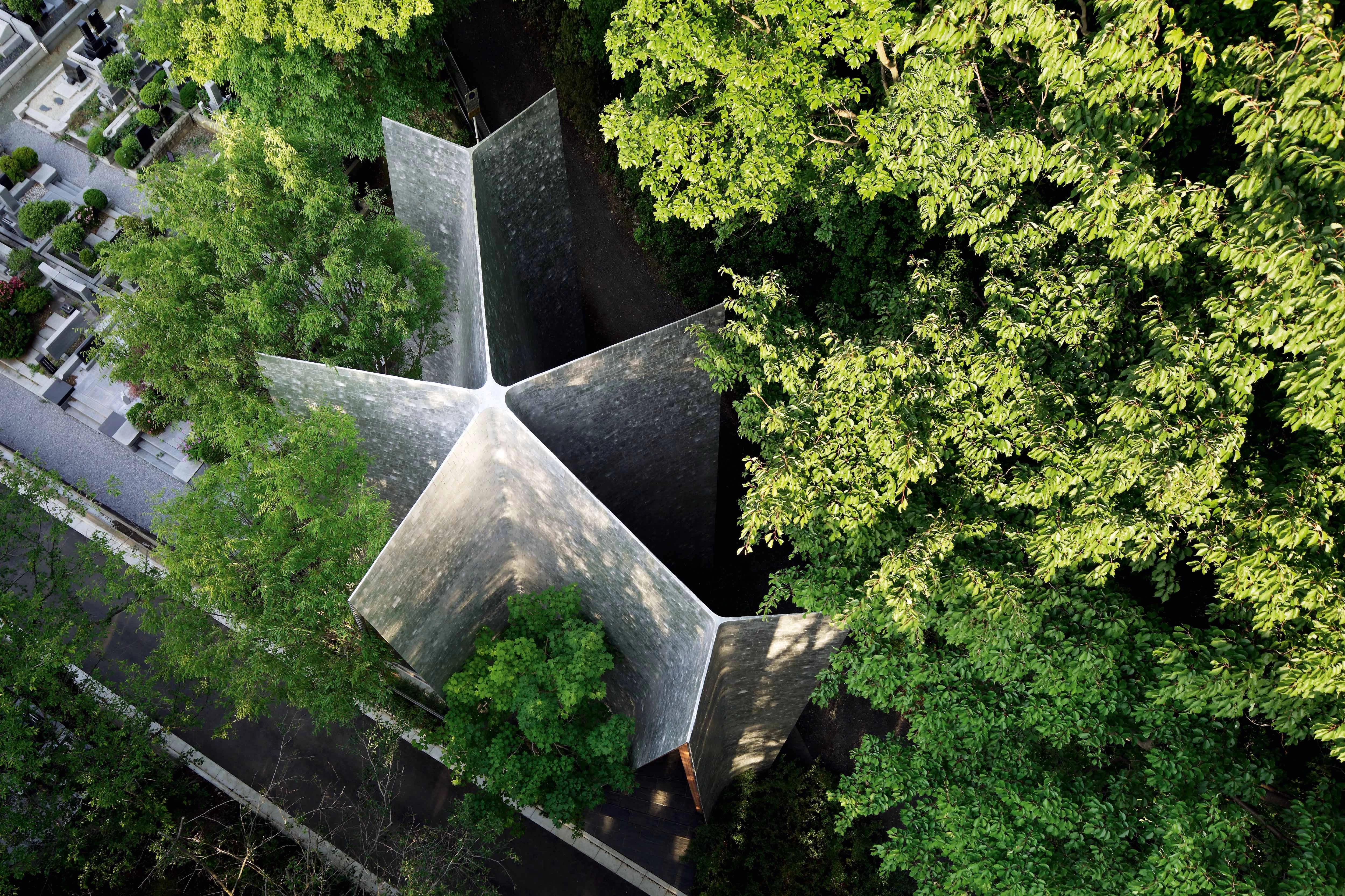 En el cementerio del lago que abastece de agua a Tokio, el Sayama, la Capilla del bosque crece entre los árboles de un denso bosque, resonando con su contexto tanto por su geometría como por sus materiales. Sin adscribirse a ningún culto en particular, sino intentanto crear una atmósfera que sugiera los rasgos comunes de la espiritualidad humana, el espacio de la capilla surge de la combinación de una serie de faldones alabeados que conforman una cubierta papirofléxica, abierta al exterior mediante siete grandes huecos triangulares y acristalados. El origami resultante está construido con 251 vigas de madera de alerce laminada, de distintos tamaños, fabricadas en taller con un cortadora por control numérico. Tanto la geometría como el sistema constructivo hacen posible que el edificio tenga un excelente comportamiento frente al sismo y, en este sentido, la capilla continúa la tradición de soluciones empleadas en la arquitectura tradicional, en particular el Estilo Gassho típico de la ciudad de Shirakawa-go, así como los sofisticados nudos de la carpintería japonesa. Trabajada por artesanos locales, la madera asume todo el protagonismo en los cálidos tonos y texturas del interior, pero hacia el bosque adopta un tono más neutro y frío, con su revestimiento de tejas artesanales de aluminio de 4 milímetros de espesor y elegante y silencioso acabado mate...