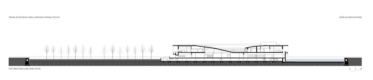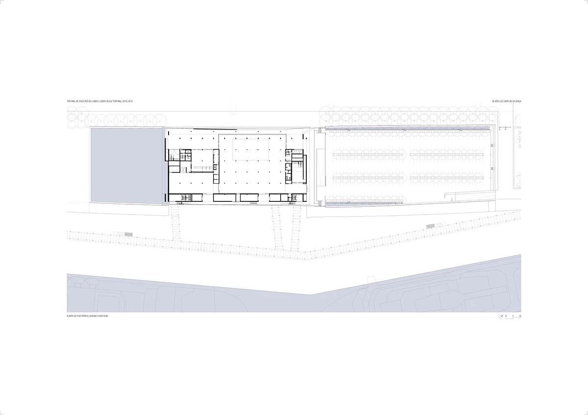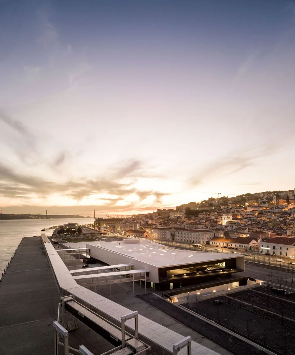 Respetando las vistas sobre la Alfama y los viejos muelles de la ciudad, la terminal toma la forma de un volumen sencillo y compacto de dos plantas de altura, conectado a la red elevada del ferrocarril mediante dos pasarelas peatonales, y cuya escala y color resuenan tanto con el característico perfil de la ciudad como con los no menos característicos colores de Lisboa. Carrilho da Graça Fernando Guerra fg+sg Rita Burmester