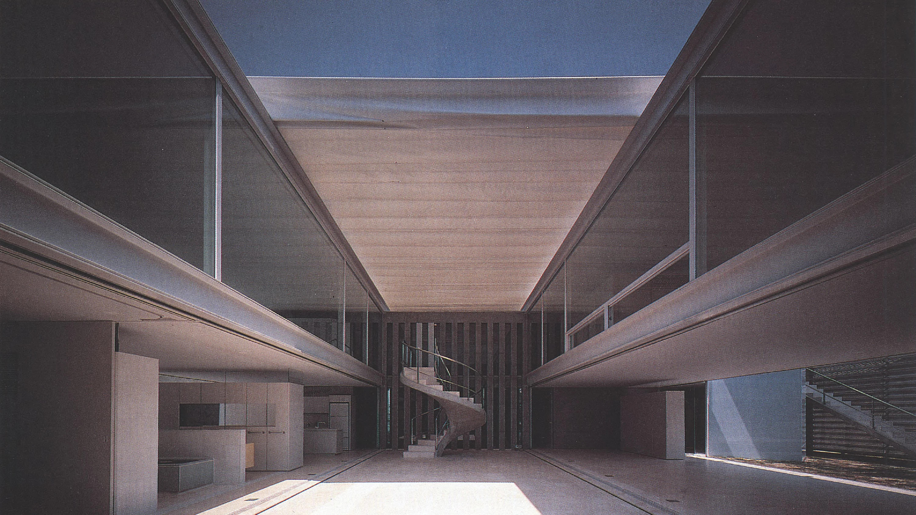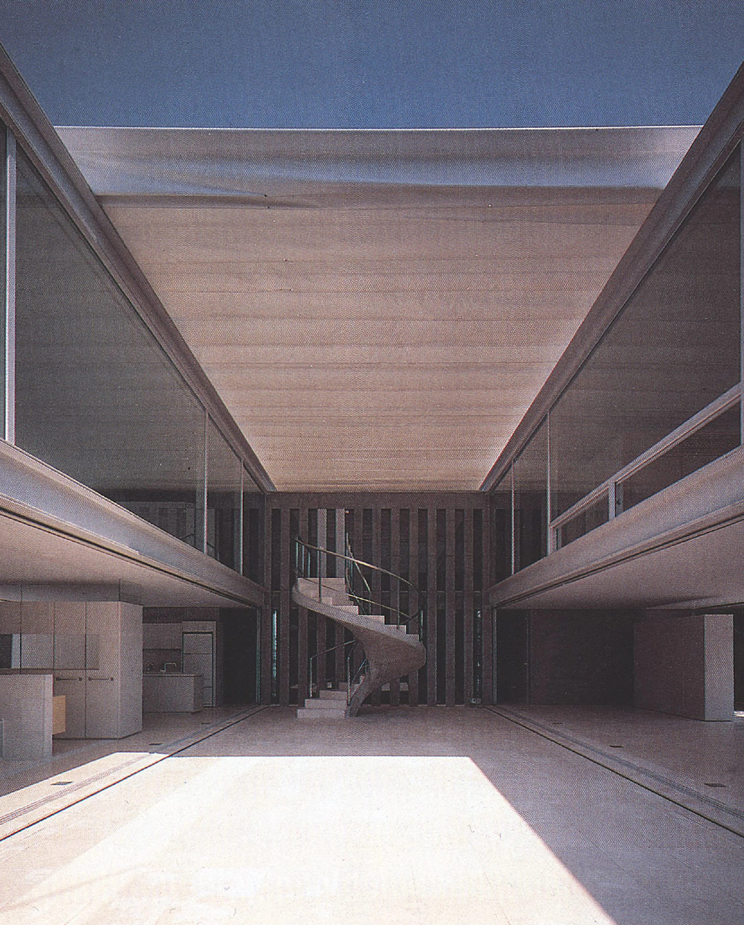 Compacta y distendida al mismo tiempo quiere ser esta casa en Osaka, cuyo proyecto se conoce como 2/5; espacialmente trabada y a la vez porosa en el juego que establece de perspectivas y transparencias. Su lógica es muy sencilla: un zócalo rectangular, de 25 x 15 metros, para albergar dependencias tales como el garaje o un gran almacén, la biblioteca y el cuarto destinado al servicio; y en los dos niveles superiores, el rectángulo se divide en cinco bandas consecutivas de 5 x 15 metros que alternan las funciones: tres de ellas son espacios exteriores, patios o jardines que iluminan las plantas inferiores, y en las dos restantes se reparten las estancias a cubierto. En el patio central puede tenderse un toldo liviano cuando aprieta el sol o en los días lluviosos.