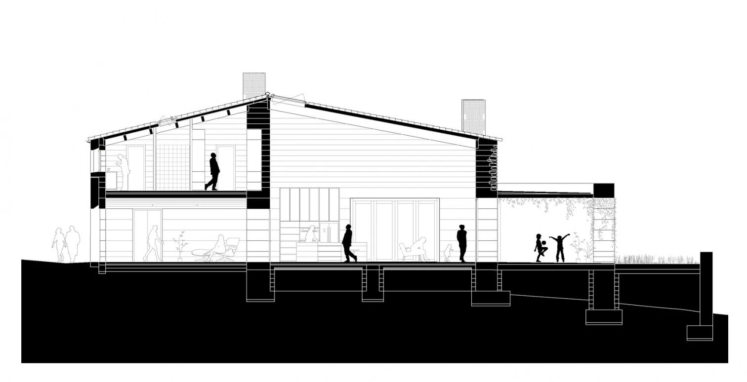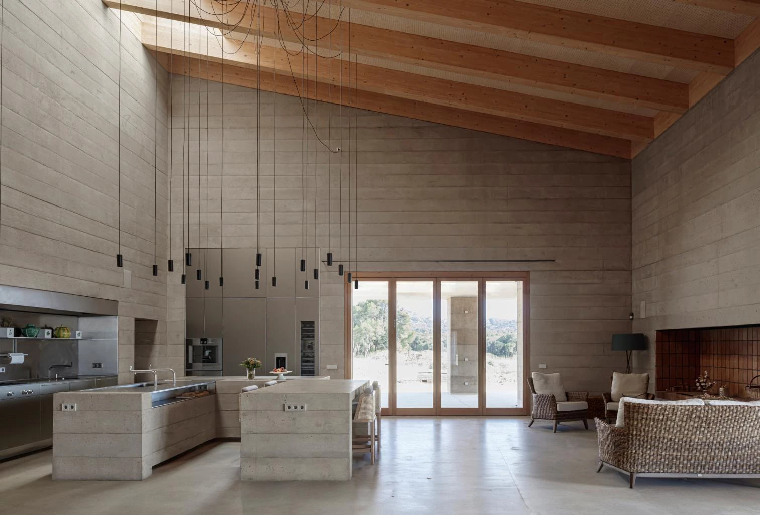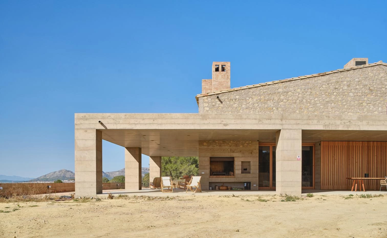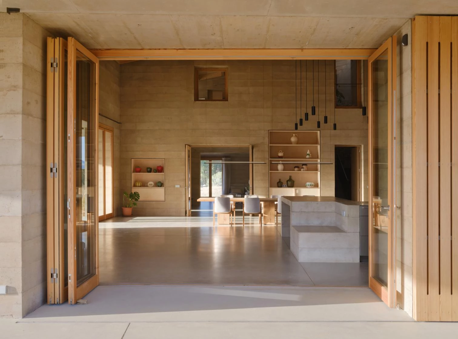 Los muros de hormigón, vertidos en capas de 25 cm y aligerados con arlita (que les confiere capacidad aislante), aportan atributos estructurales, estéticos e inercia térmica a la casa. Además, junto a las aberturas minimizadas y el predominio de la masividad se configura una herramienta climática casi autosuficiente, heredera de la tradición de las masías ancestrales.