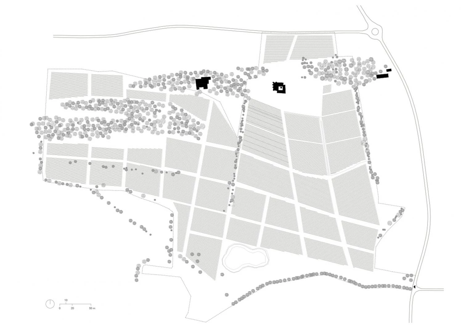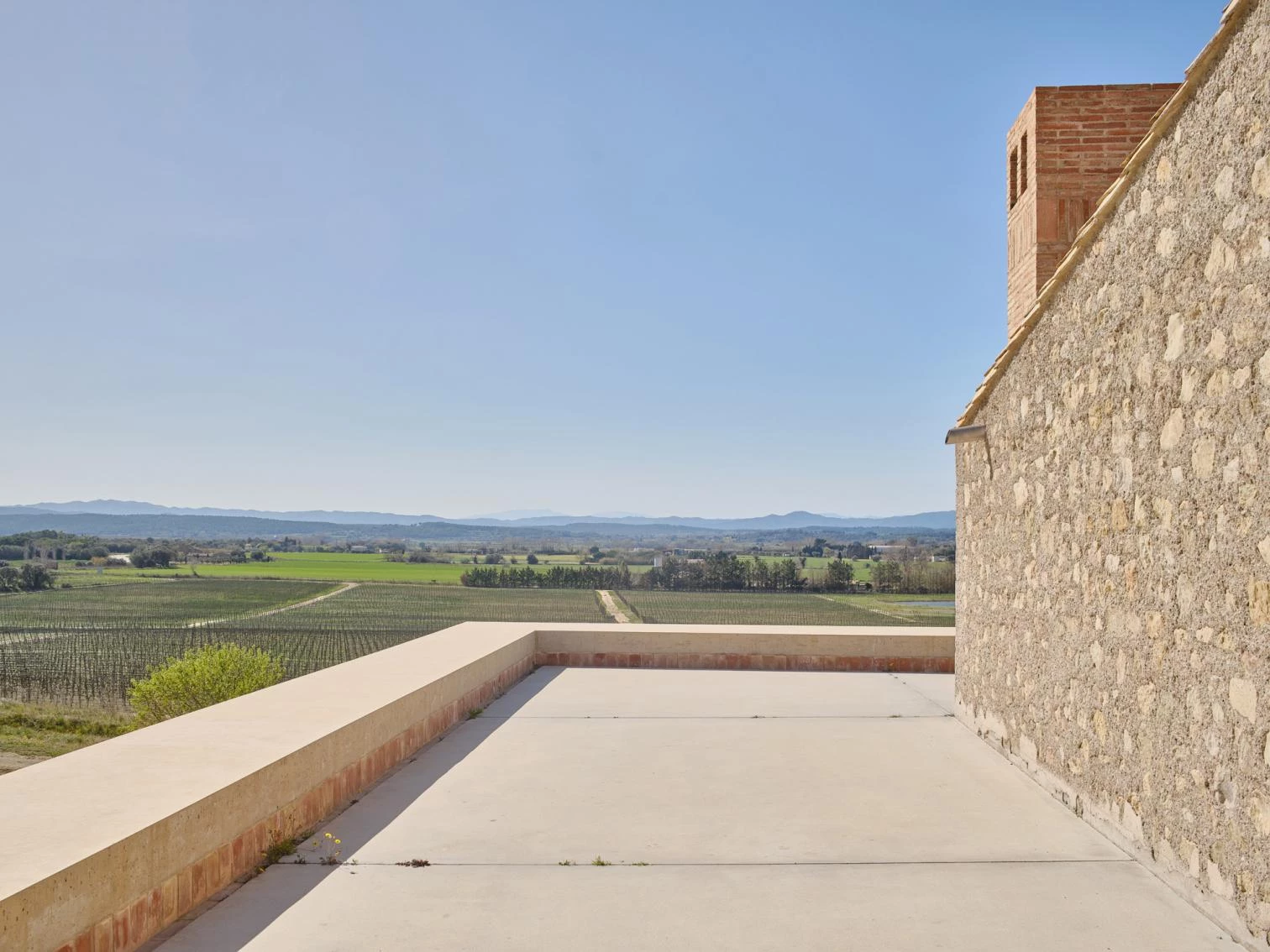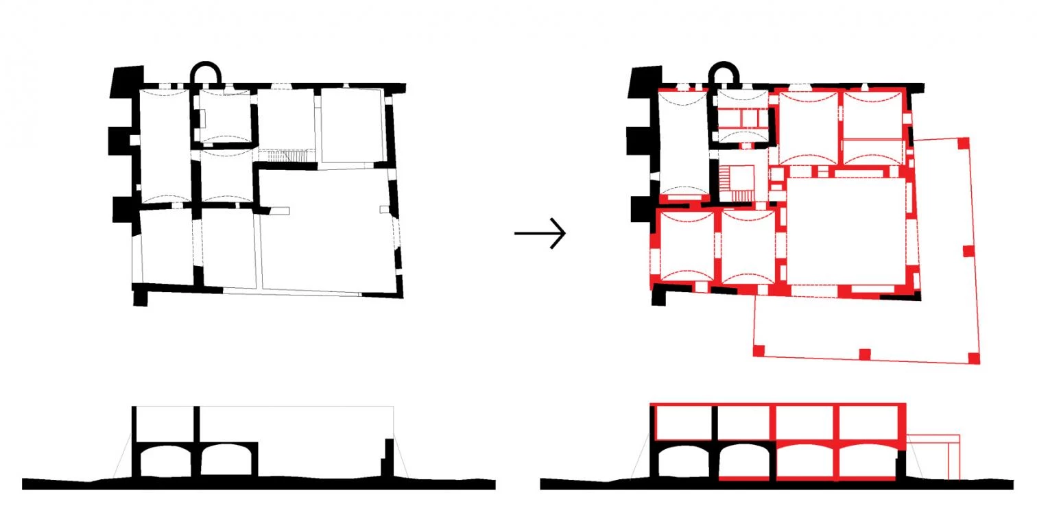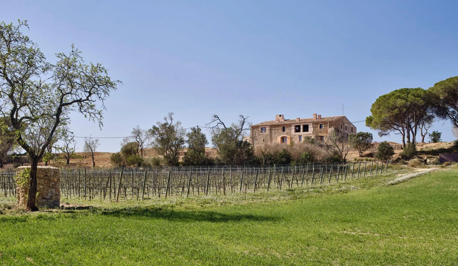 La morfología de la masía original determina la tipología estructural (muros y techos macizos) y la organización espacial de la nueva vivienda, obra de Harquitectes. La distribución adopta una retícula ortogonal de salas sucesivas, configuradas por paredes muy gruesas de carga y hormigón ciclópeo, así como por bóvedas estructurales preexistentes de piedra o nuevas de hormigón. Dos secuencias espaciales se cruzan en la cocina —de sur a norte y de este a oeste—, que es la estancia principal con 100 metros cuadrados, doble altura y vistas hacia la viña. Adosado a la cocina, un gran porche en forma de L se incorpora a la casa.