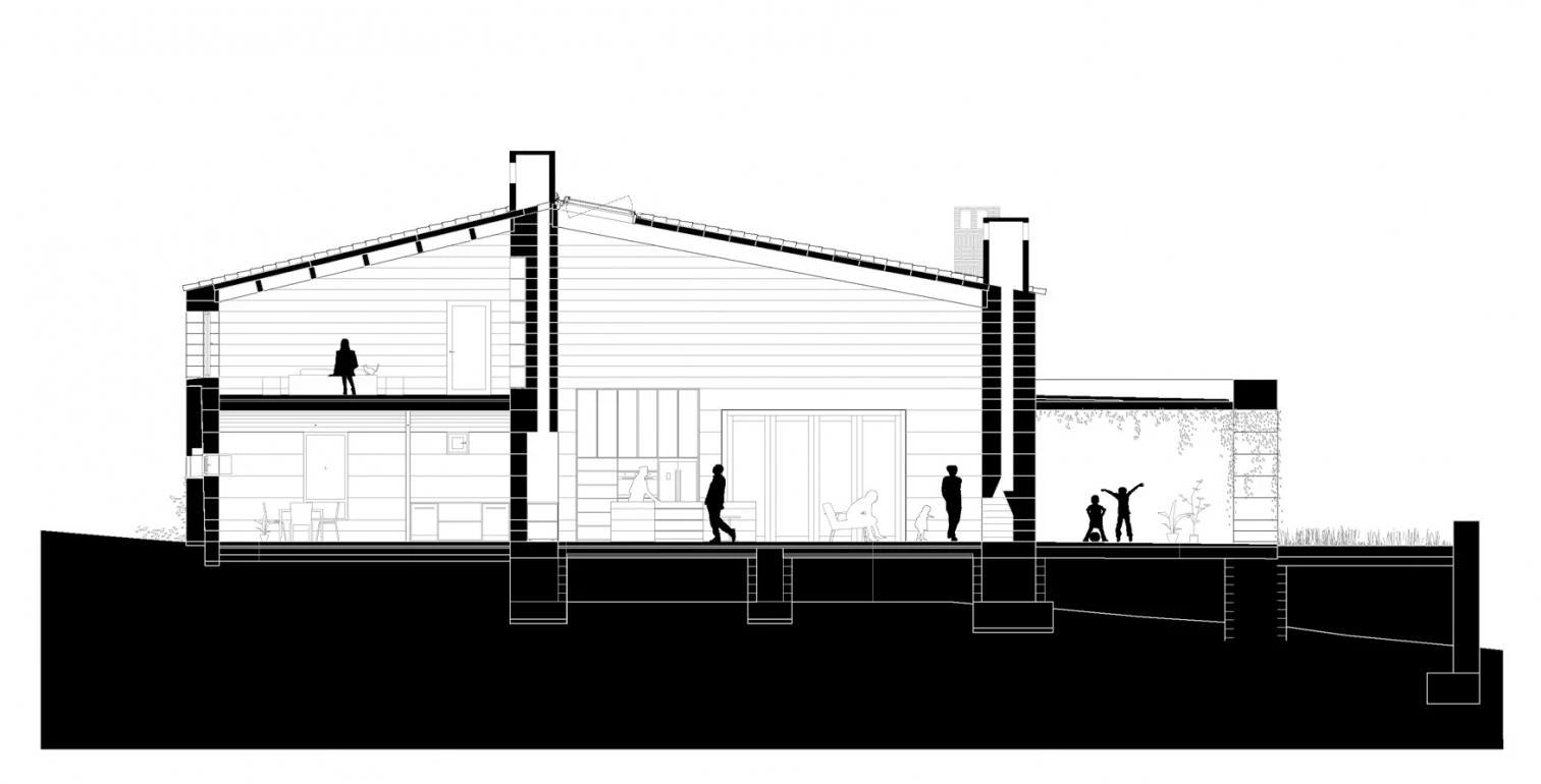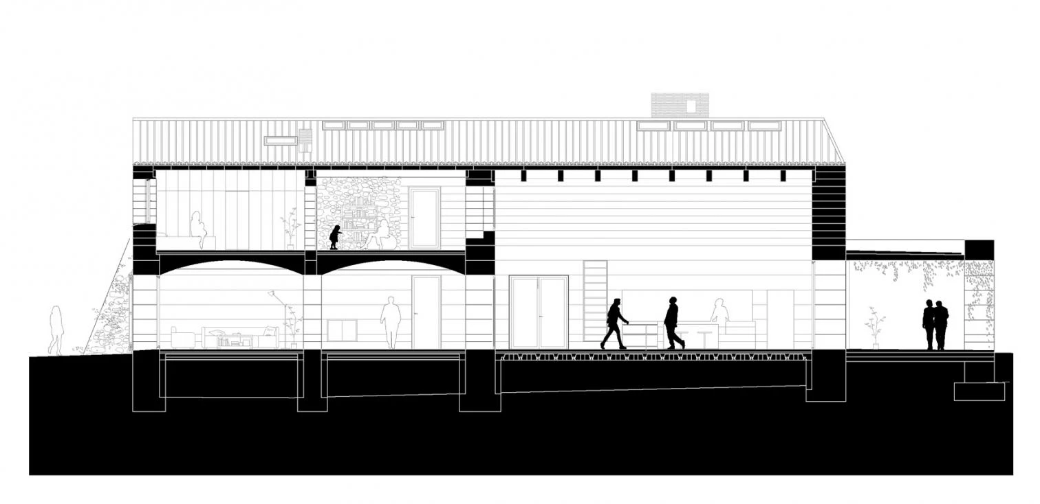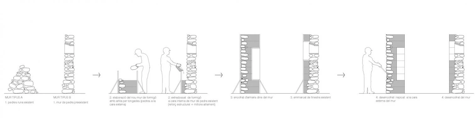 La nueva cubierta de teja, soportada por una estructura de madera vista en el interior, recupera la altura original de la edificación y las dos vertientes que dibujan un volumen sencillo a dos aguas. En el exterior, las dos fachadas de piedra situadas al norte y al este se rehabilitan. Al sur y al oeste, la preexistencia es menor y la construcción se completa con nuevas paredes de hormigón ciclópeo repicado.