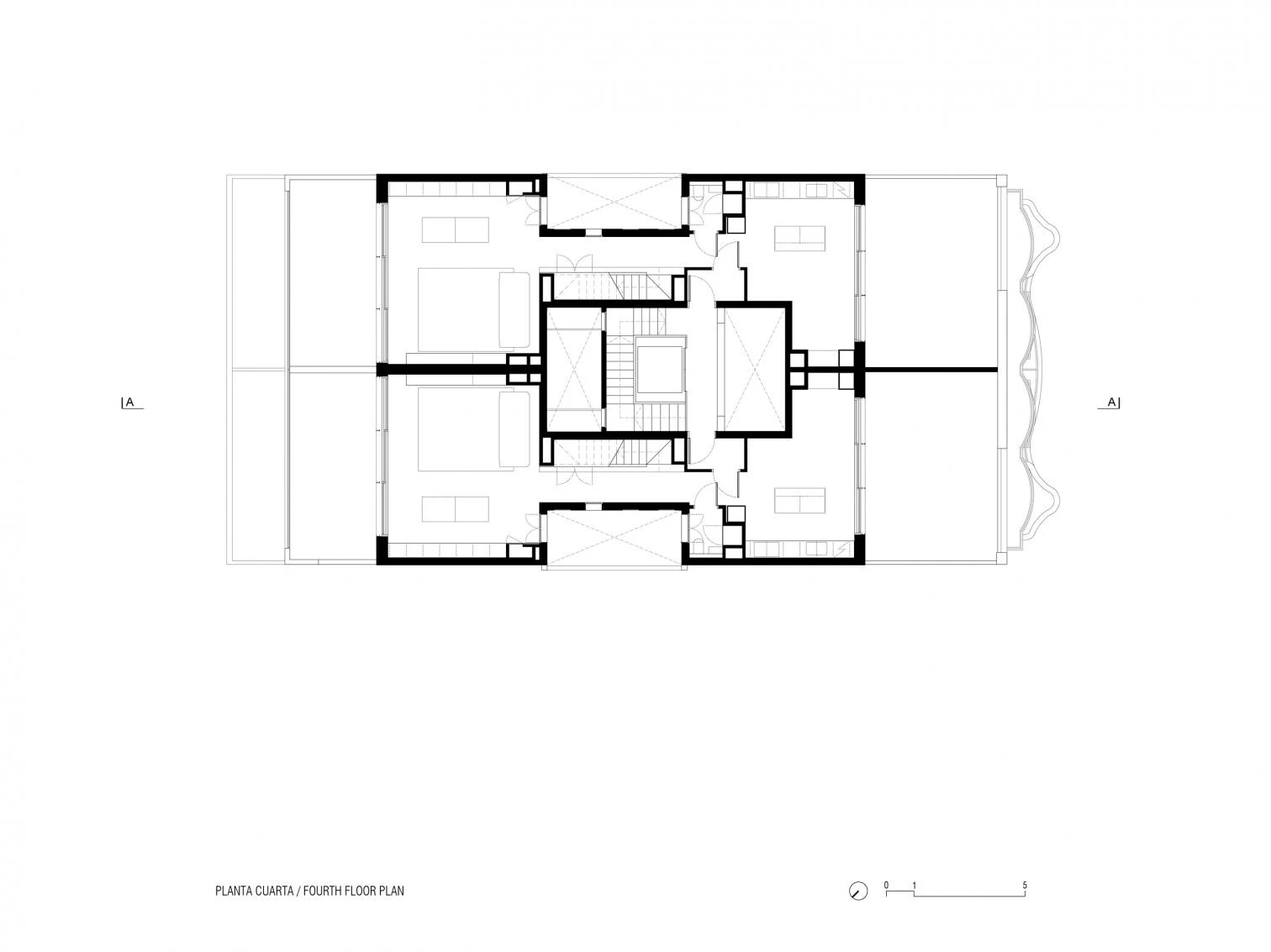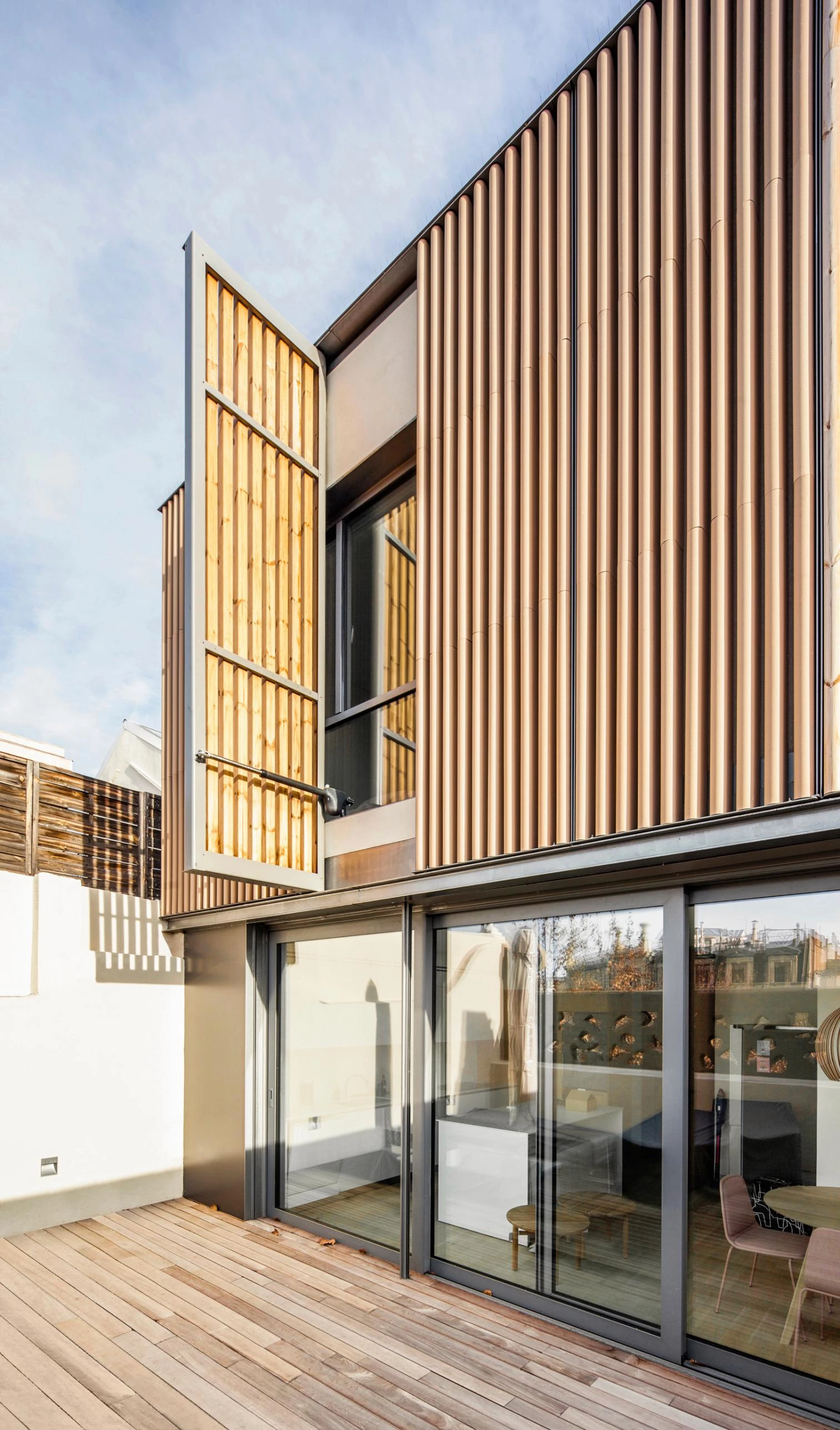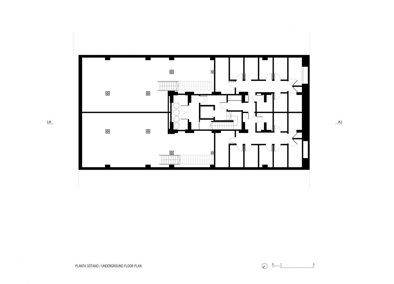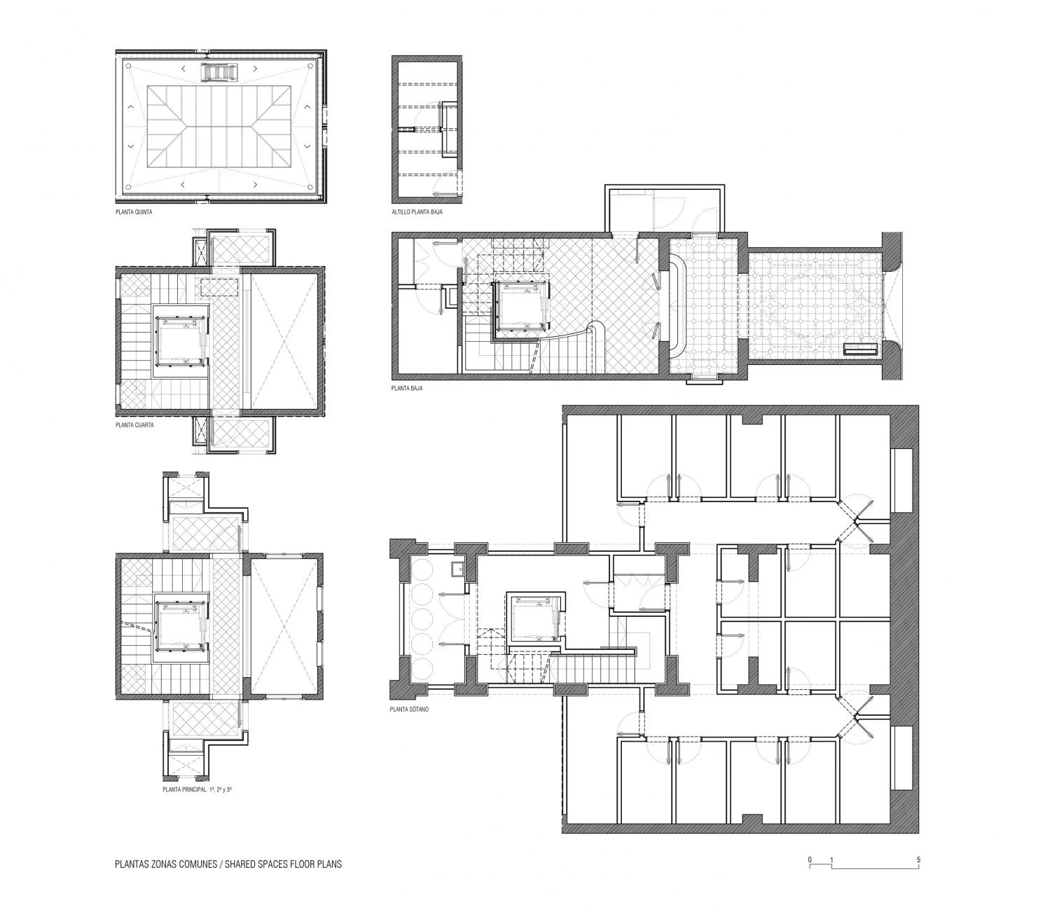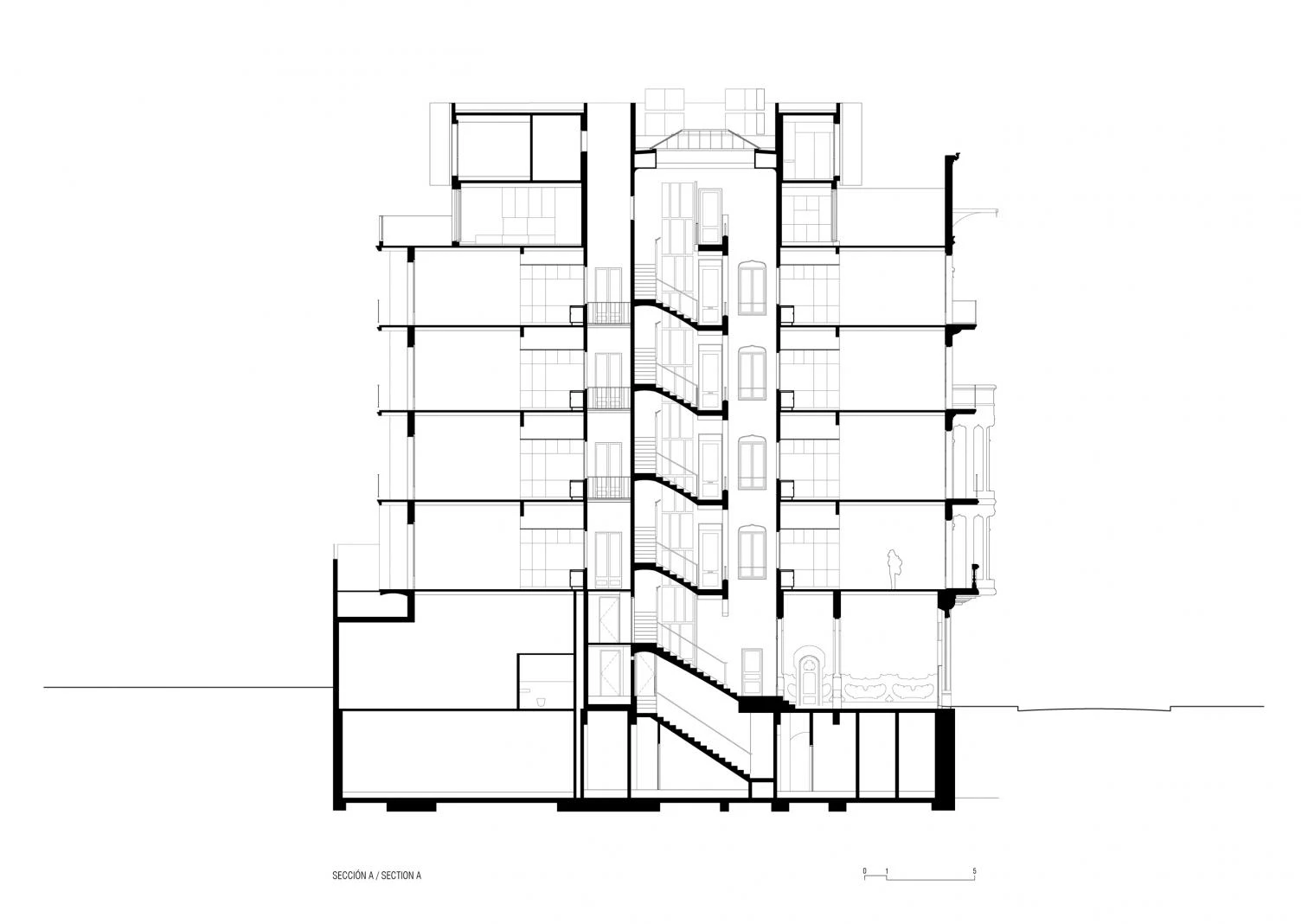El mayor reto de la intervención consistía en cómo pasar de 8 a 18 viviendas sin desvirtuar los espacios originales, así como aumentar en dos plantas el edificio con un nuevo volumen en diálogo con el existente. Para ello, se realiza una rigurosa catalogación de todos los elementos. En el interior de las viviendas, la nueva distribución conserva el perímetro de suelos y techos, trabajando con volúmenes que no agotan la altura. El cuerpo que alberga los dúplex está envuelto con lamas verticales de gres, de media sección circular, que establecen una relación cromática con lo existente.