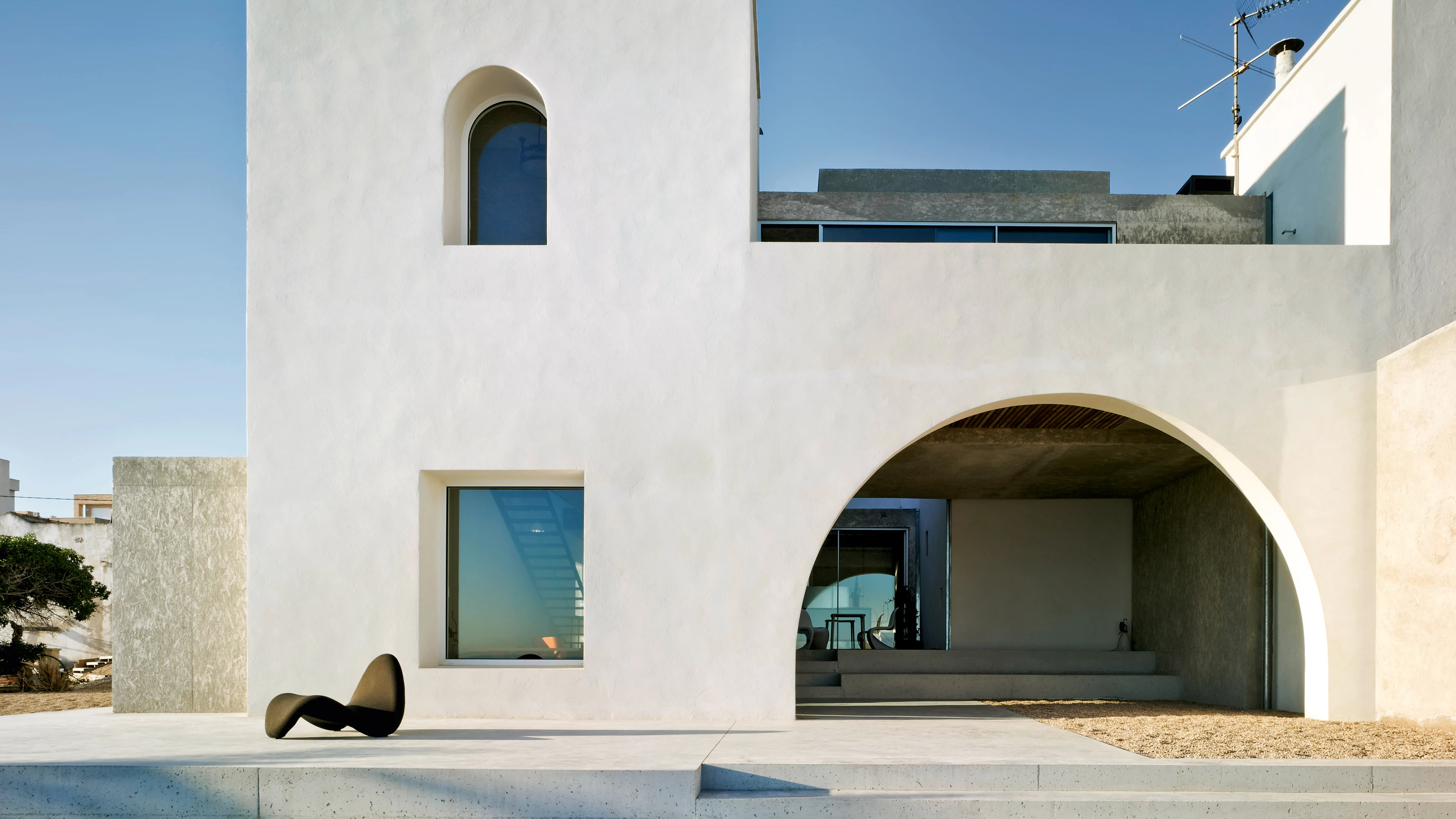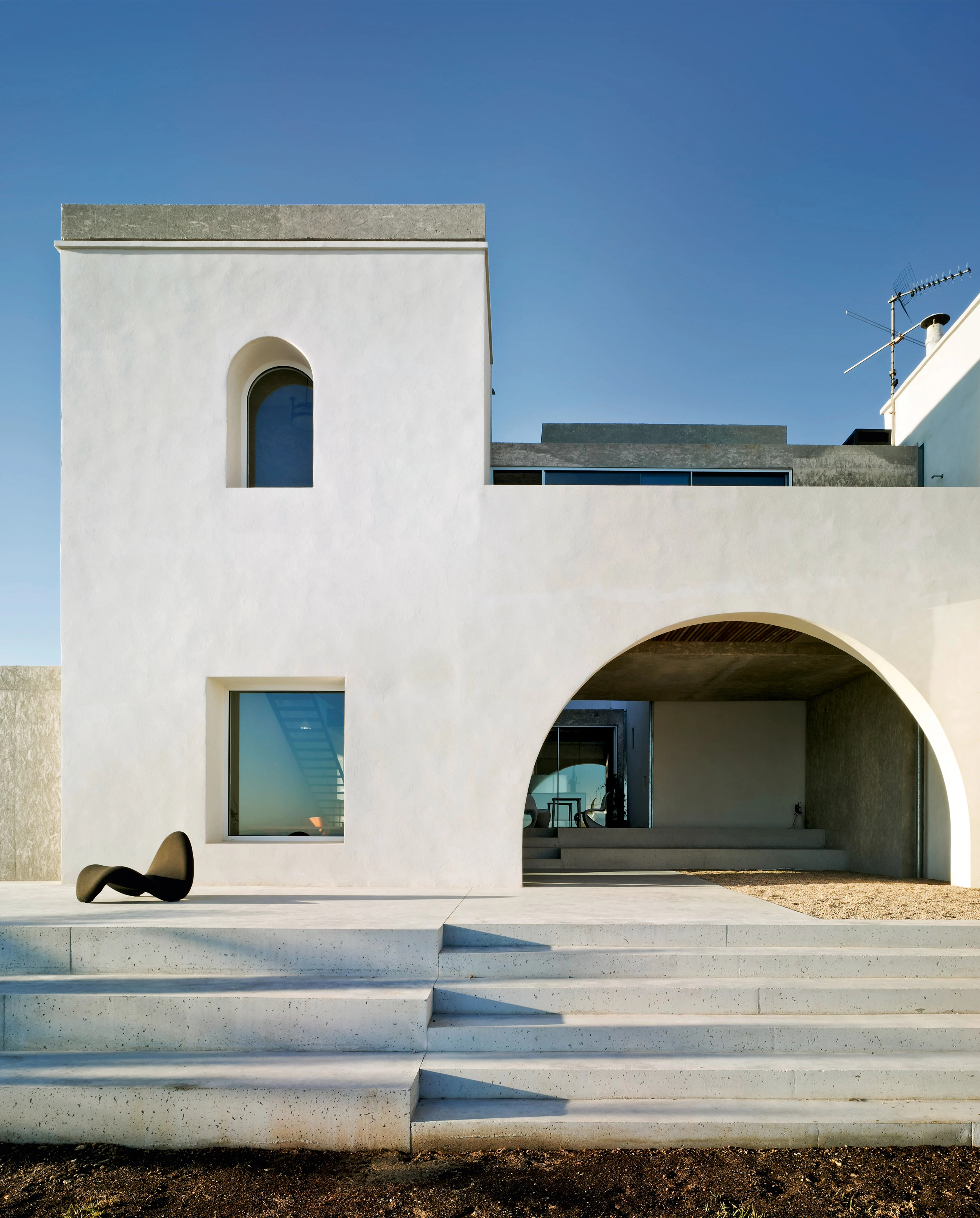 Alien es una estructura que surge del interior de la casa tal y como lo hacía aquel octavo pasajero de mítica película de Ridley Scott. Esta estructura parasitaria se muestra en diferentes momentos del espacio de una construcción precedente, de la cual sólo se han conservado sus muros de mampostería y también su volumetría rotunda y blanca situada sobre una colina en un paisaje de matorral bajo. La introducción de la nueva estructura ha permitido transformar el espacio de la casa, que ha dejado de estar compartimentado, para abrirse con franqueza al mar. En ella las actividades diurnas se disponen en la planta baja, destinándose la superior a las habitaciones y a una biblioteca. Esta organización se produce a través de una secuencia espacial que desde el interior conduce gradualmente al exterior a través de una serie de ámbitos con diferente carácter: un jardín frente al mar, un graderío y una plataforma abierta, un espacio cubierto tras un gran arco, un patio, una terraza elevada y, finalmente, un porche trasero ajardinado.