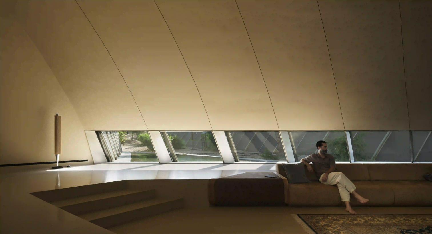 En el interior, la vivienda presenta una secuencia de espacios arqueados y verticales que se alejan de la ortogonalidad. Los huecos rasgados filtran la luz y permiten el paso de la brisa del desierto. Los materiales, como el hormigón proyectado revestido con estuco color arena en los muros y las losas curvas, refuerzan la continuidad entre arquitectura y paisaje. Así, Casa Alwah es un refugio contemporáneo que reinterpreta la sabiduría constructiva del desierto.
