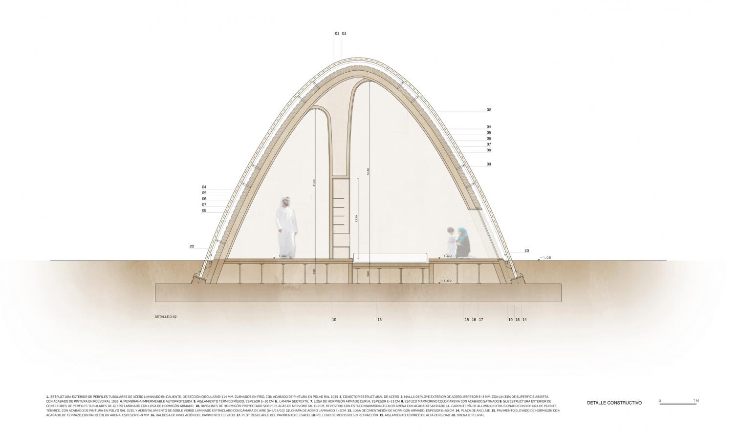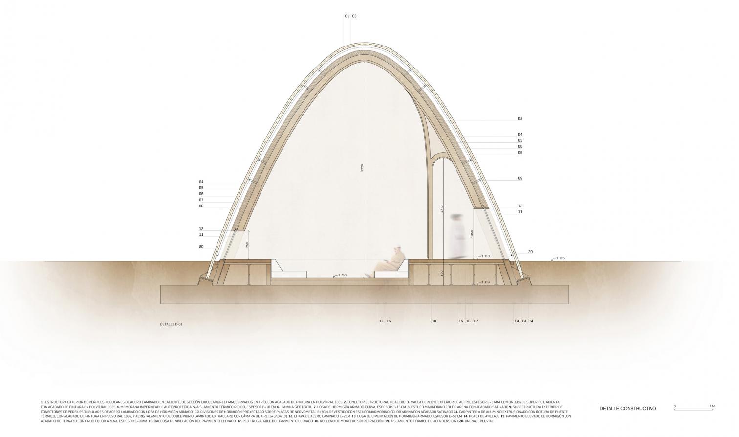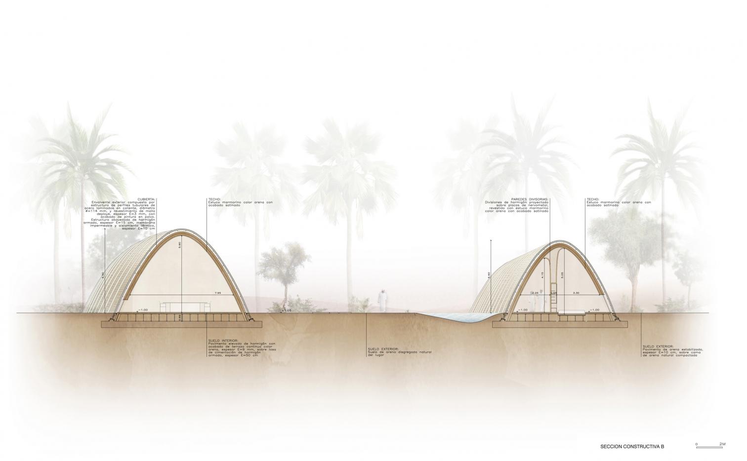 Inspirada en la arquitectura vernácula del desierto, la envolvente exterior actúa con gran inercia térmica. Las piezas de hormigón armado, al cruzarse, permiten que la estructura trabaje por su propia geometría, concentrando los esfuerzos en la superficie y logrando una síntesis entre solidez y ligereza.