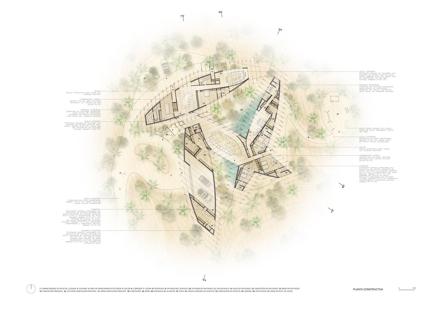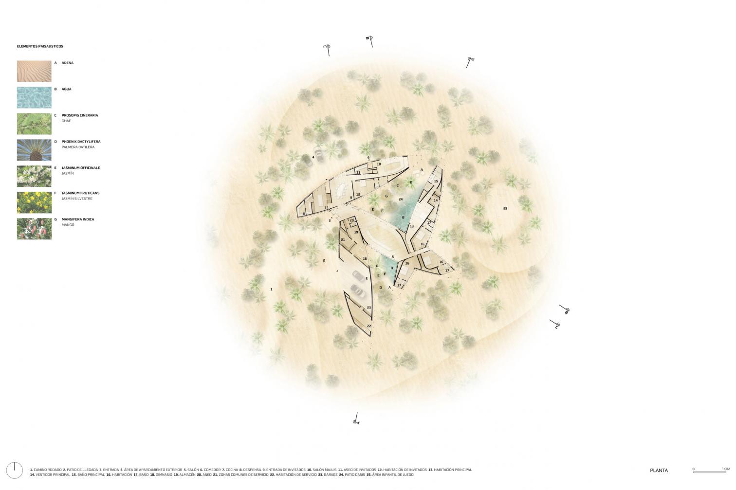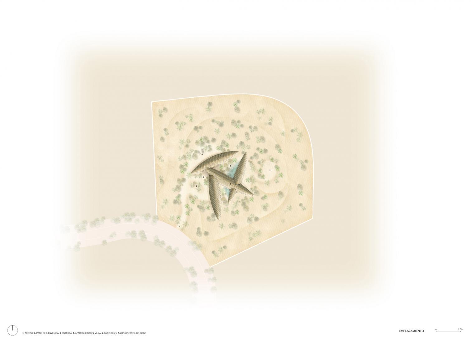 Casa Alwah emerge en el desierto de Dubái como un refugio, similar a un oasis, concebido a partir de la lógica natural de una flor. Incrustada parcialmente en el terreno, la vivienda está organizada a través de patios y recorridos que conducen de manera gradual a espacios que se revelan poco a poco, respetando distintos anillos de privacidad y ofreciendo miradas simultáneas hacia el interior y el exterior.