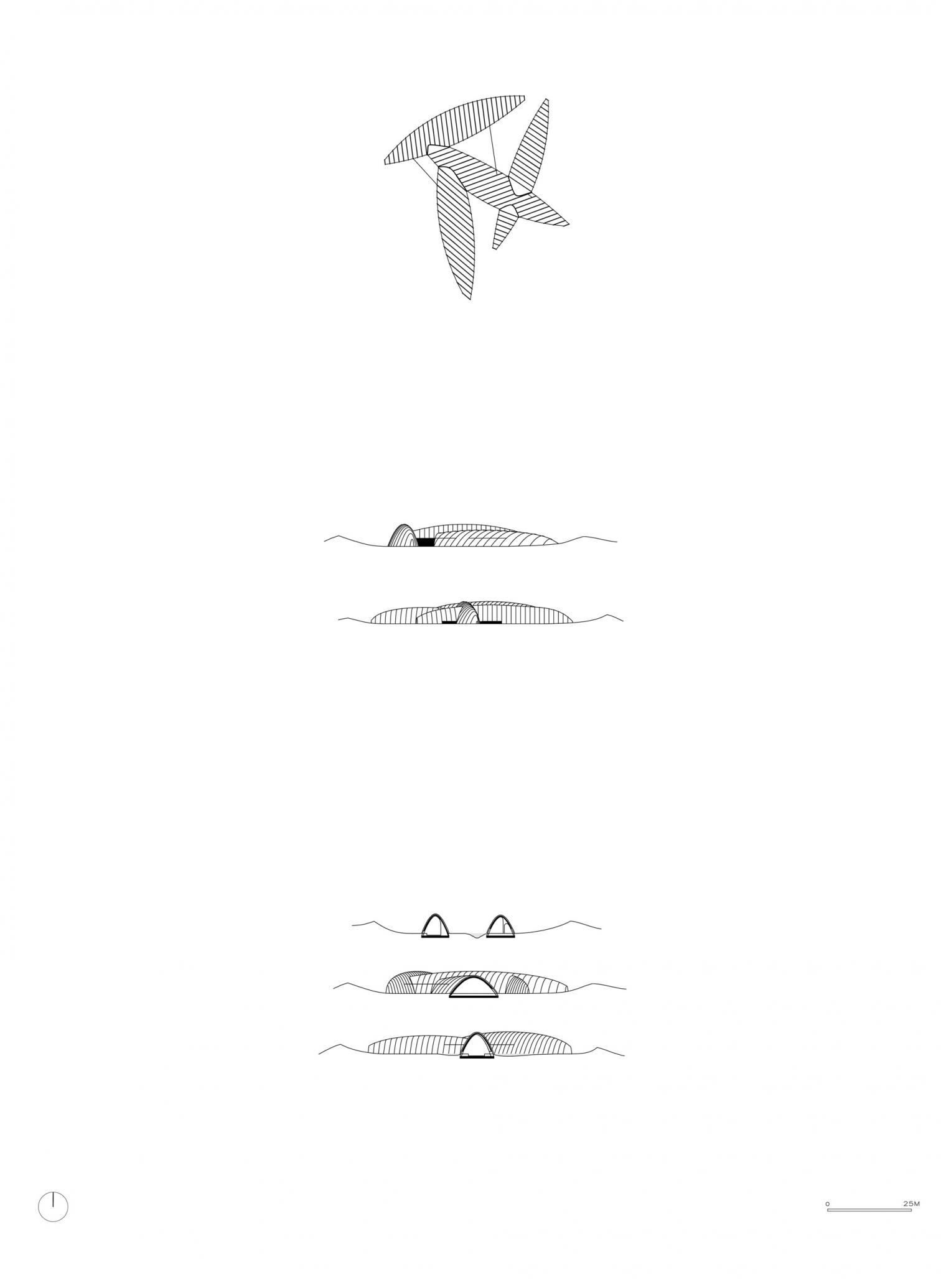 La casa se estructura en torno a dos grandes espacios exteriores. Cuatro volúmenes curvos se entrecruzan en distintas direcciones, generando conexiones visuales que invitan a la exploración. Esta superposición crea una sensación de resguardo sin renunciar a la apertura, definiendo una experiencia espacial dinámica y cambiante.