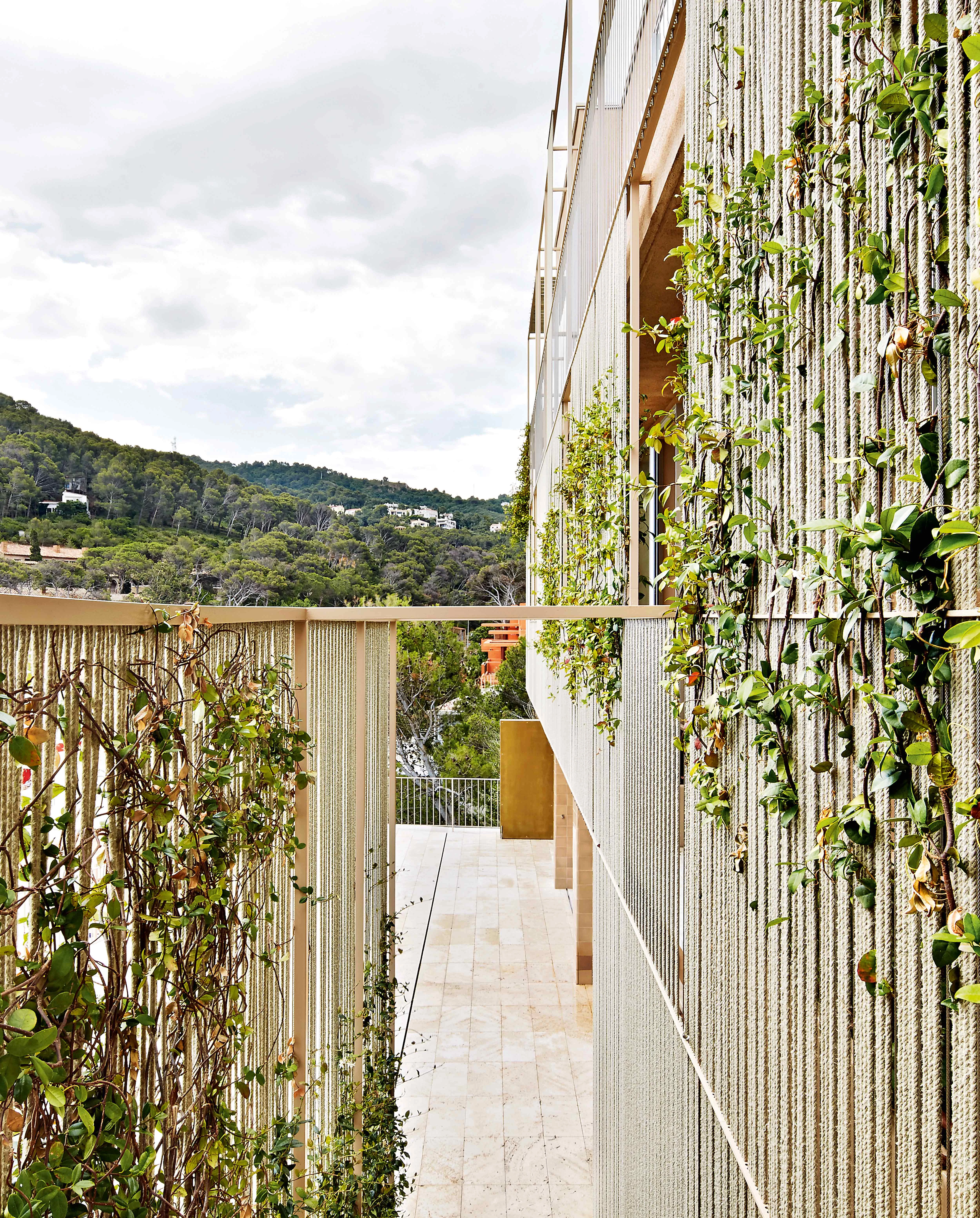 Taking this existing circumstance as point of departure, the intervention consists, in the first place, in opening up the boundaries of the house: the walls have been perforated transversally to create a structure of ribs that the winds can now go through gently, in search of the new rear courtyard. The consequence is that the house enjoys cross ventilation and can be cooled naturally, aside from opening up to the broad views of the landscape. Once perforated, the facade is wrapped in a second skin of ropes that stretch over metallic frames fixed to the slab edges, creating a latticework of different densities that address the demands for privacy on each facade, aside from letting climbing plants make their way up so that over the course of the years they end up camouflaging the house among pine trees and oleanders, which are local plant species.