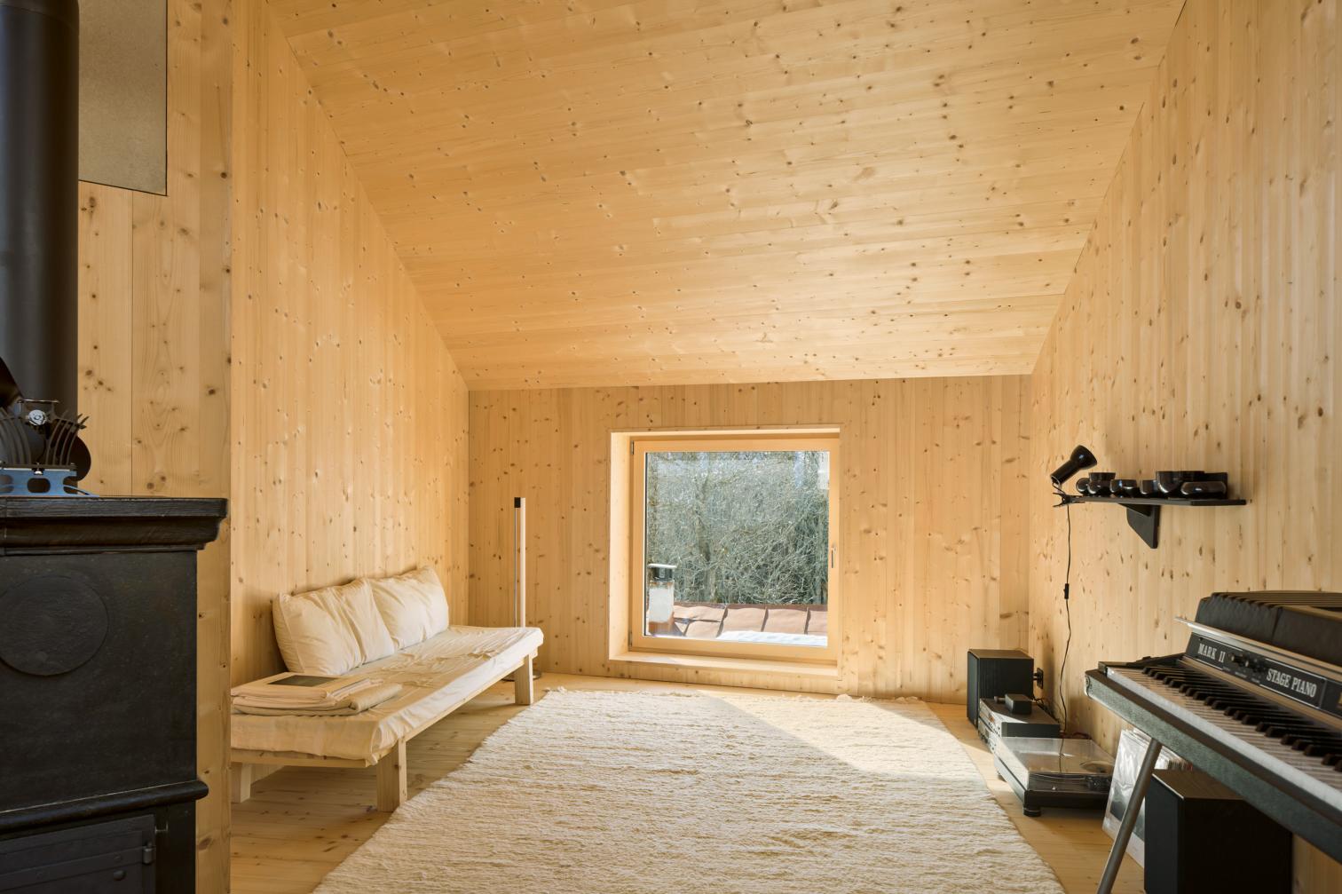 El primer paso es dividir el programa en habitaciones ‘caras’ y ‘baratas’. Las que requieren buen aislamiento en invierno se reducen al mínimo en número y superficie, y el espacio sobrante se añade a la zona común. De ahí surge el concepto de ‘casa de invierno + casa de verano’: la de invierno es un sencillo y cálido refugio; la de verano dispone de amplias terrazas y patios que invitan a pasar tiempo al aire libre. El método de construcción en madera combina a la perfección ambos requisitos: la casa de invierno requiere un buen aislamiento en los elementos de fachada, cubierta y en las ventanas de madera-metal, y una capa aislante de 28cm. La de verano, en cambio, tiene sencillos muros de entramado de madera abiertos por dentro y con revestimiento exterior de abeto rojo.