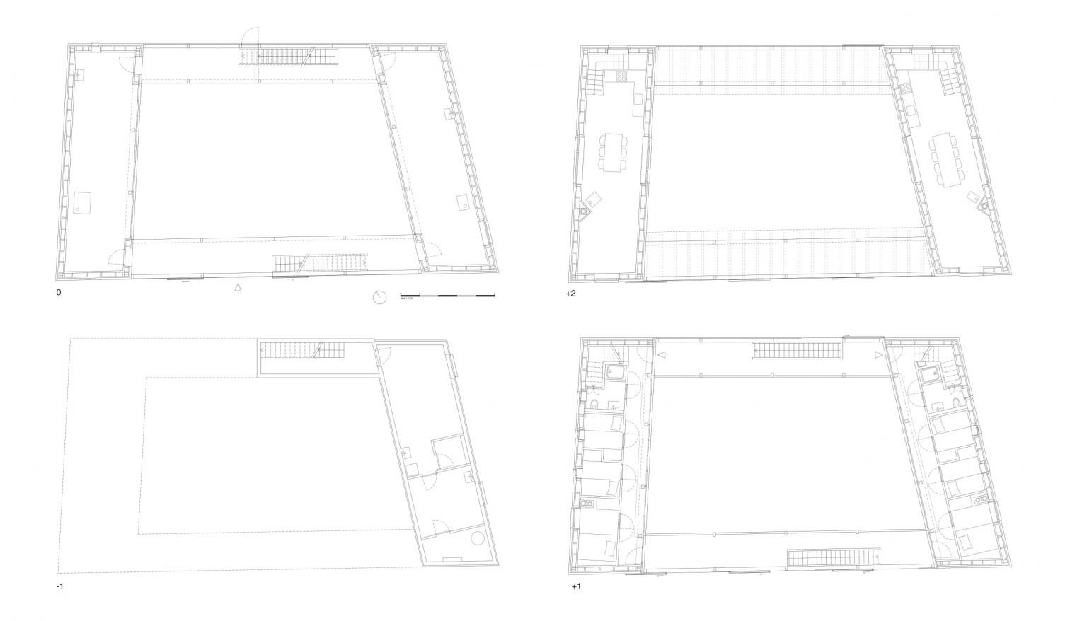 En cada casa el estudio se sitúa en la primera planta con acceso directo desde el patio. A la vivienda, en la planta superior, se accede a través de una escalera en la galería del patio. Entre ambas plantas hay un piso ciego de dos metros de altura, donde se sitúan los dormitorios, de sólo 4,00 m² y alineados como en un coche cama.