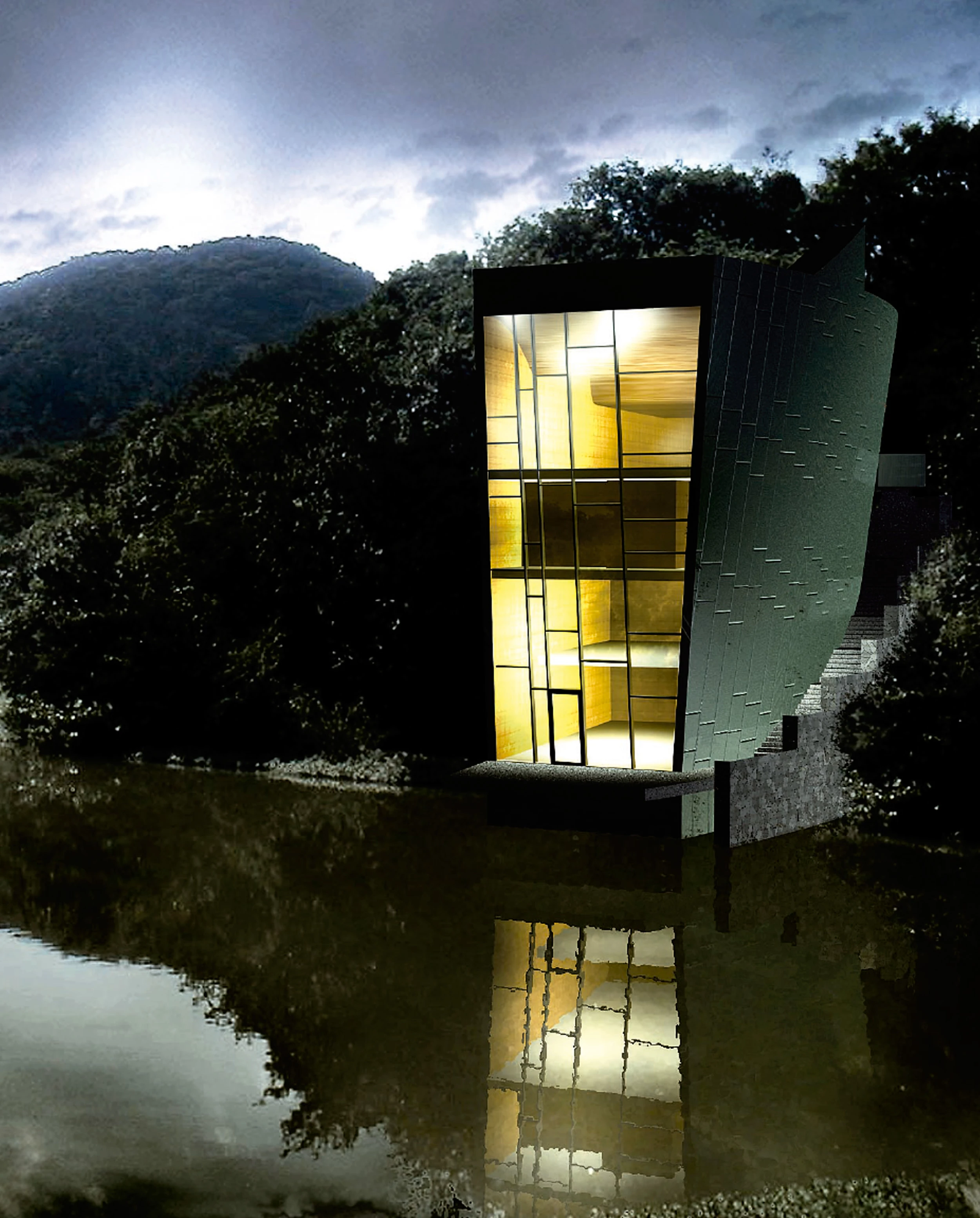 Como un barco olvidado en la orilla del mar, la casa se levanta —con sus cinco alturas— en el borde del lago, con el objetivo de llamar la atención sobre el entorno natural, plagado de colinas, riachuelos y vegetación abundante.