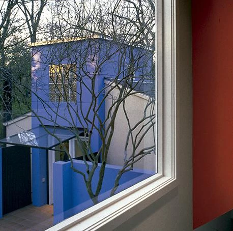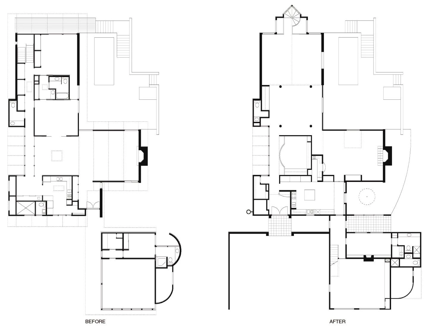 Rodeada por el exuberante paisaje que se extiende a lo largo del Buffalo Bayou —el canal que conecta Houston con el Golfo de México—, la casa, de 460 metros cuadrados, es el resultado de rehabilitar y ampliar otra casa anterior de una sola planta. La nueva construcción aprovecha tanto los cimientos como los muros de la antigua para configurar a partir de ellos una secuencia de espacios abiertos que fluyen en libertad, conectándose entre sí. La distribución en planta permite aprovechar al máximo las vistas hacia el paisaje, pero al mismo tiempo consigue que los propietarios puedan disponer de amplios paramentos en el interior, para colgar en ellos las piezas de su colección de arte. Desde el punto de vista compositivo, la casa consiste en una serie de ejes paralelos que, orientándose al bayou, penetran en un conjunto de volúmenes singulares, de los cuales algunos son el resultado de esculpir la casa original, mientras que otros se añaden a esta para crear un conjunto unitario. El más importante de estos volúmenes comienza en una especie de torre de acceso y termina en una amplia sala de estar dotada de luz del norte y el este. Una escalera con forma de tajamar sobresale de uno de los testeros de la casa, insertándose en el húmedo paisaje para abrirse al barranco que se extiende debajo.