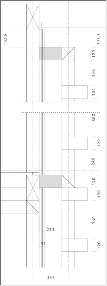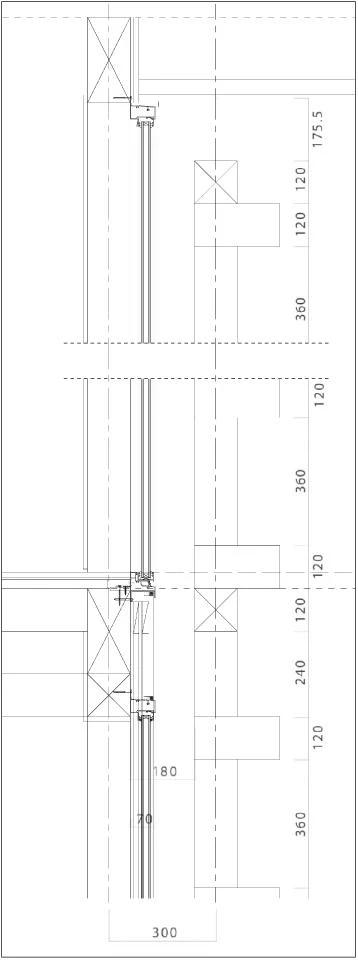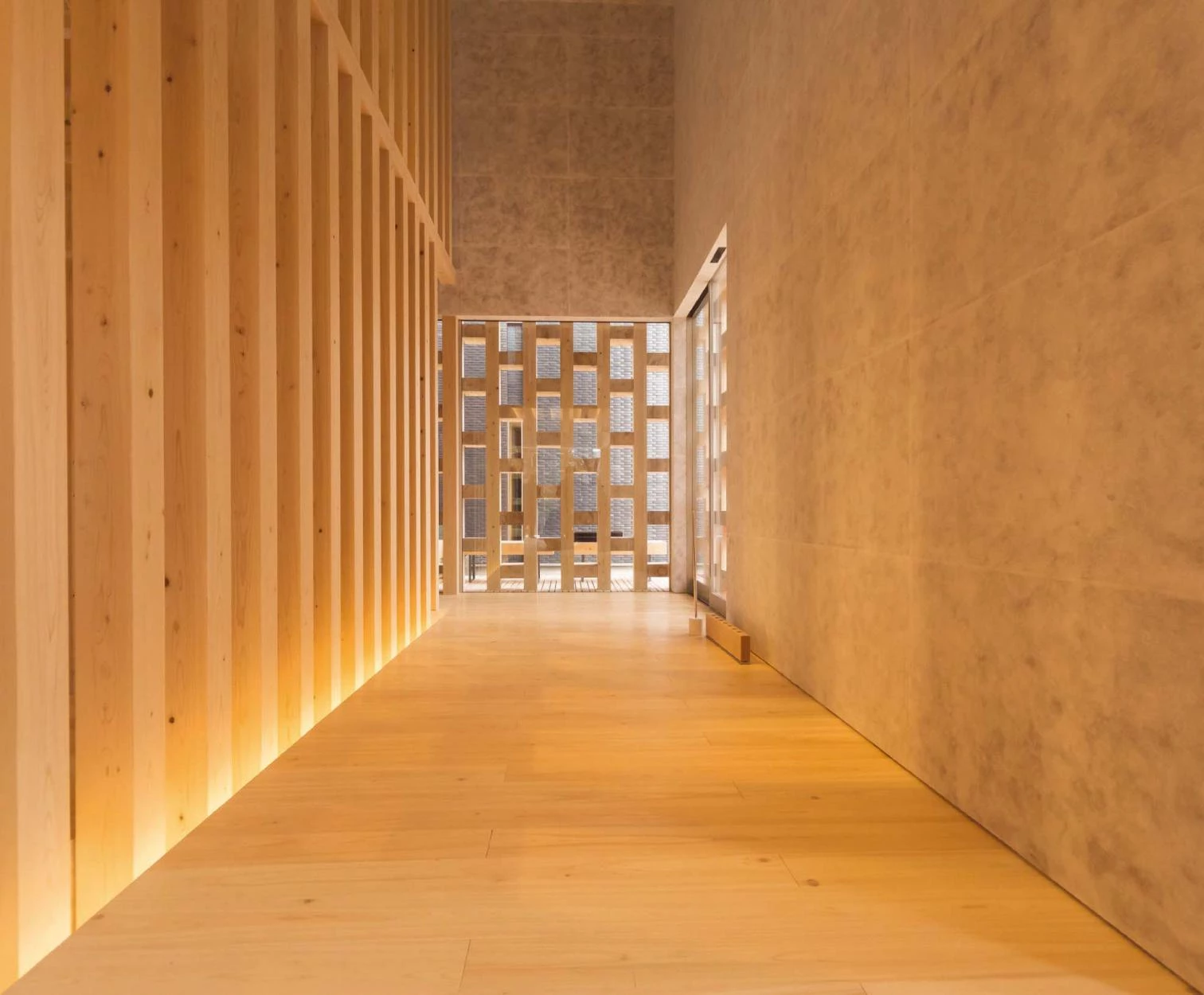 Como si se tratara de un bosque geometrizado, la estructura deja pasar la luz entre los perfiles de madera, generando un patrón de luces y sombras que aporta una atmósfera natural al espacio doméstico. Los límites superior e inferior formados por la cubierta y el basamento se conciben como elementos mínimos que ceden el protagonismo al cuerpo principal de dos alturas. Tras la retícula ajedrezada, la fachada alterna zonas opacas y transparentes, en función del uso interior. Así, espacios como el salón, las habitaciones o la sala japonesa cuentan con paneles de vidrio de suelo a techo que permiten la iluminación natural y las vistas hacia el exterior.