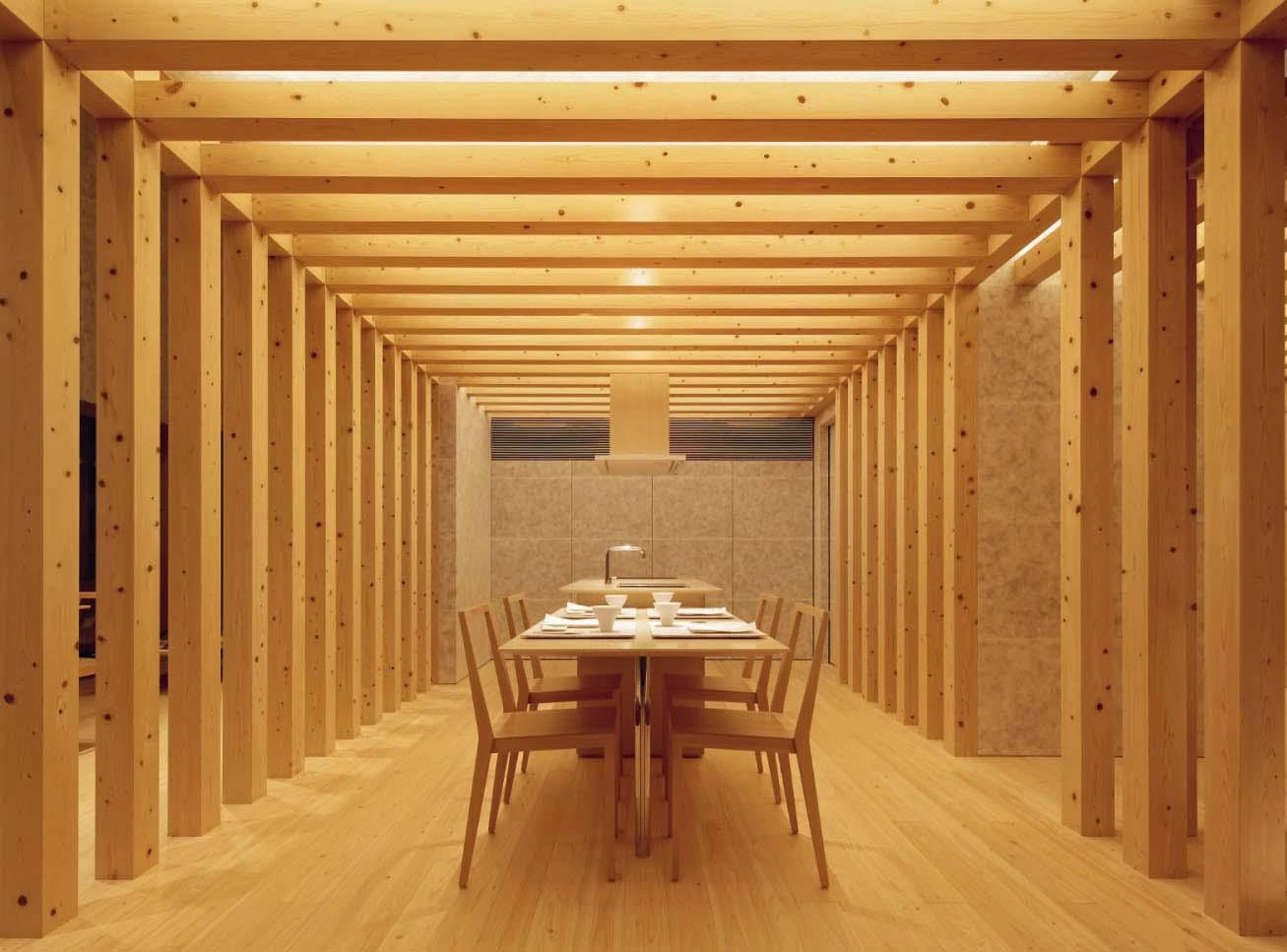 Construida a partir de listones de madera de 120x120 milímetros, esta casa destaca en el entorno suburbano de Tokio por su uniformidad. Tanto las vigas como los pilares o el cerramiento están formados por prismas del mismo tamaño en sección y diferente longitud según su función. El diseño se inspira en el sistema Chidori, un juguete japonés de siglos de antigüedad que consta de piezas de madera de 12 milímetros que se ensamblan entre sí para crear estructuras tridimensionales abstractas. En esta versión ampliada, la repetición sistemática de elementos modulares crea un ambiente sosegado y armónico acorde con la filosofía oriental.