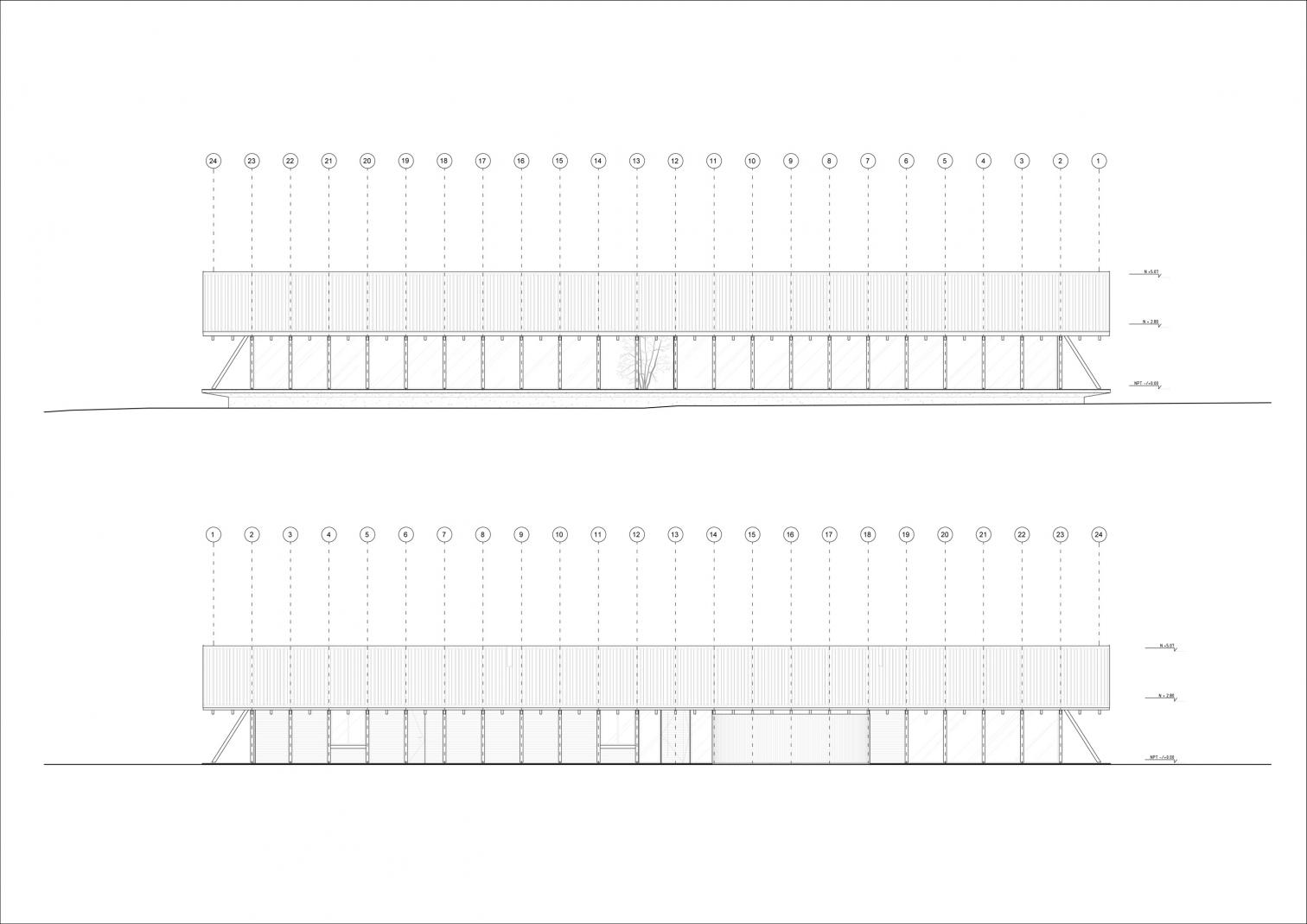 La arquitectura pone en primer plano su sistema estructural, que también cumple función de acabado final. Dos líneas de columnas y vigas forman la estructura base, reforzada por diagonales que actúan como caballetes para sostener una gran cubierta inclinada.