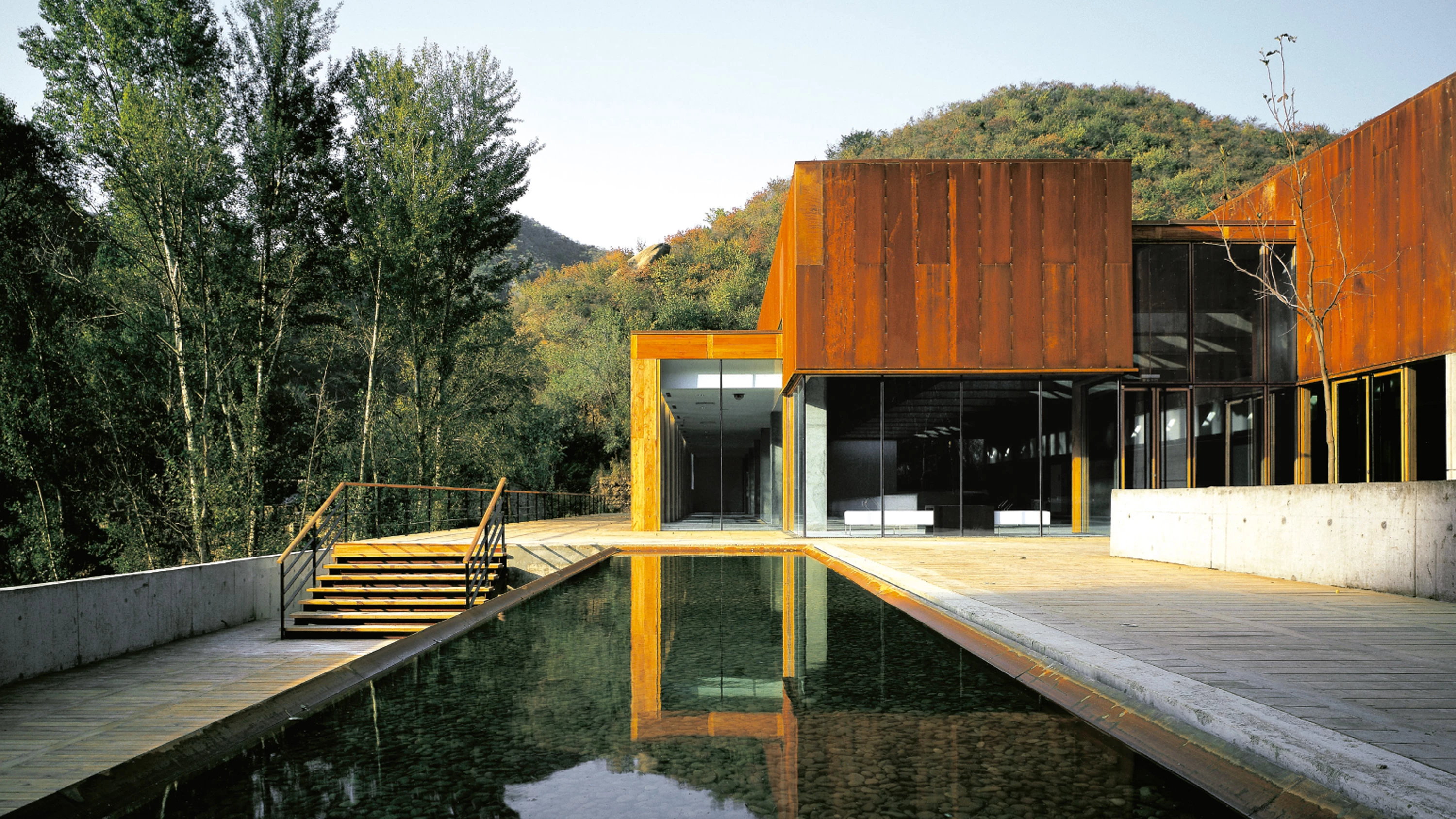 El amplio programa, que incorpora dos restaurantes, una piscina interior, tiendas, oficinas y hasta un museo, se acomoda en volúmenes menores situados en los distintos niveles que posee la parcela (cuya pendiente varía entre 0 y 10 %), vinculados por medio de un corredor. Con el fin de anclar el edificio a la memoria del lugar, se ha empleado madera, revestimiento de acero cortén —que variará de color con el paso del tiempo como el paisaje con el transcurso de las estaciones— y un compuesto de piedra y hormigón realizado con piedras de las inmediaciones, queriendo dar al conjunto la impronta de un edificio que lleva años construido... [+]