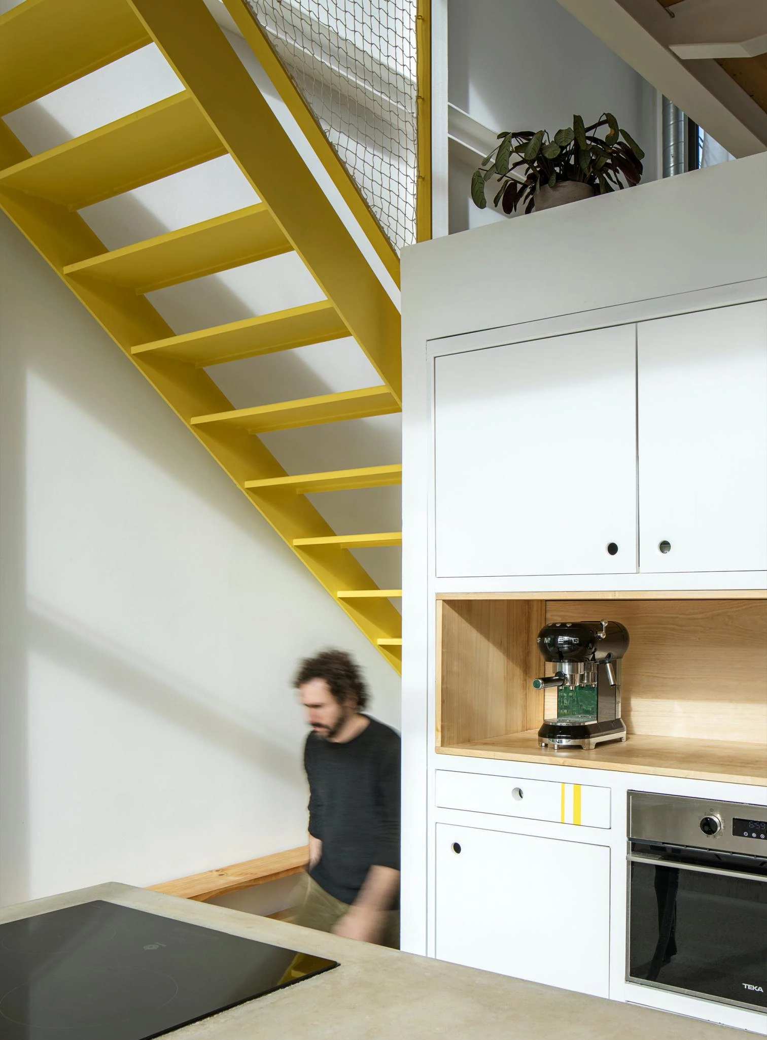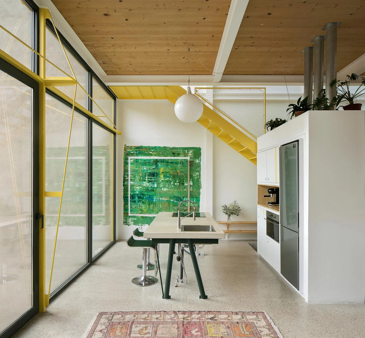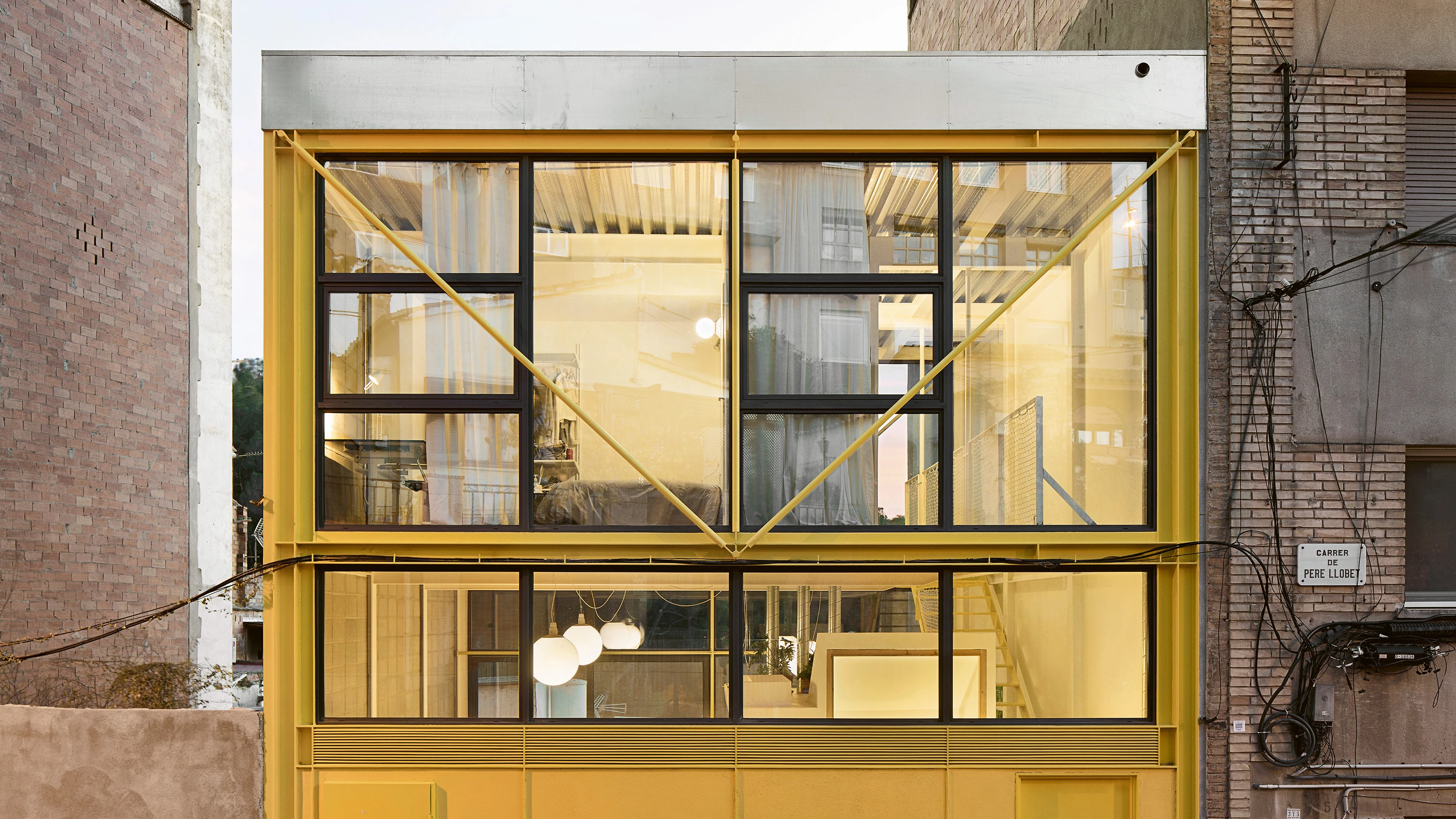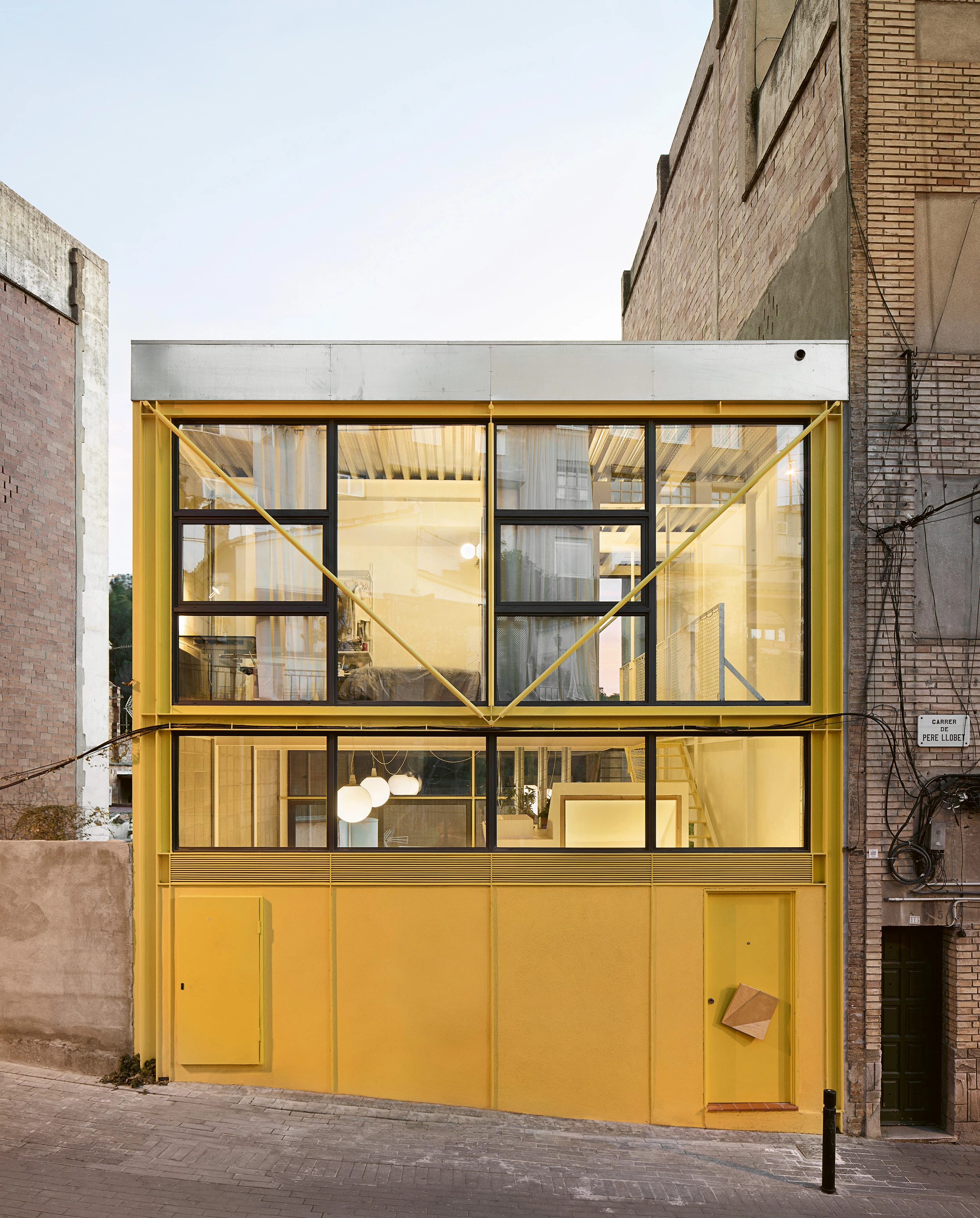 El proyecto aprovecha el desnivel de la parcela para alojar bajo rasante un basamento de hormigón armado que da soporte a la estructura metálica de las dos plantas superiores, vinculando la construcción húmeda a lo telúrico y el jardín, y la seca a lo aéreo y las vistas. Resulta así una casa adosada entre medianeras, a cuyos aires high-tech resta seriedad la improvisada decisión final de pintar el armazón de un llamativo color amarillo. El uso de este color sirve para enfatizar el carácter industrial, las líneas sencillas y los ángulos rectos, tanto en el exterior como en los interiores —donde contrasta con los elementos de hormigón y metal, que se mantienen crudos—.