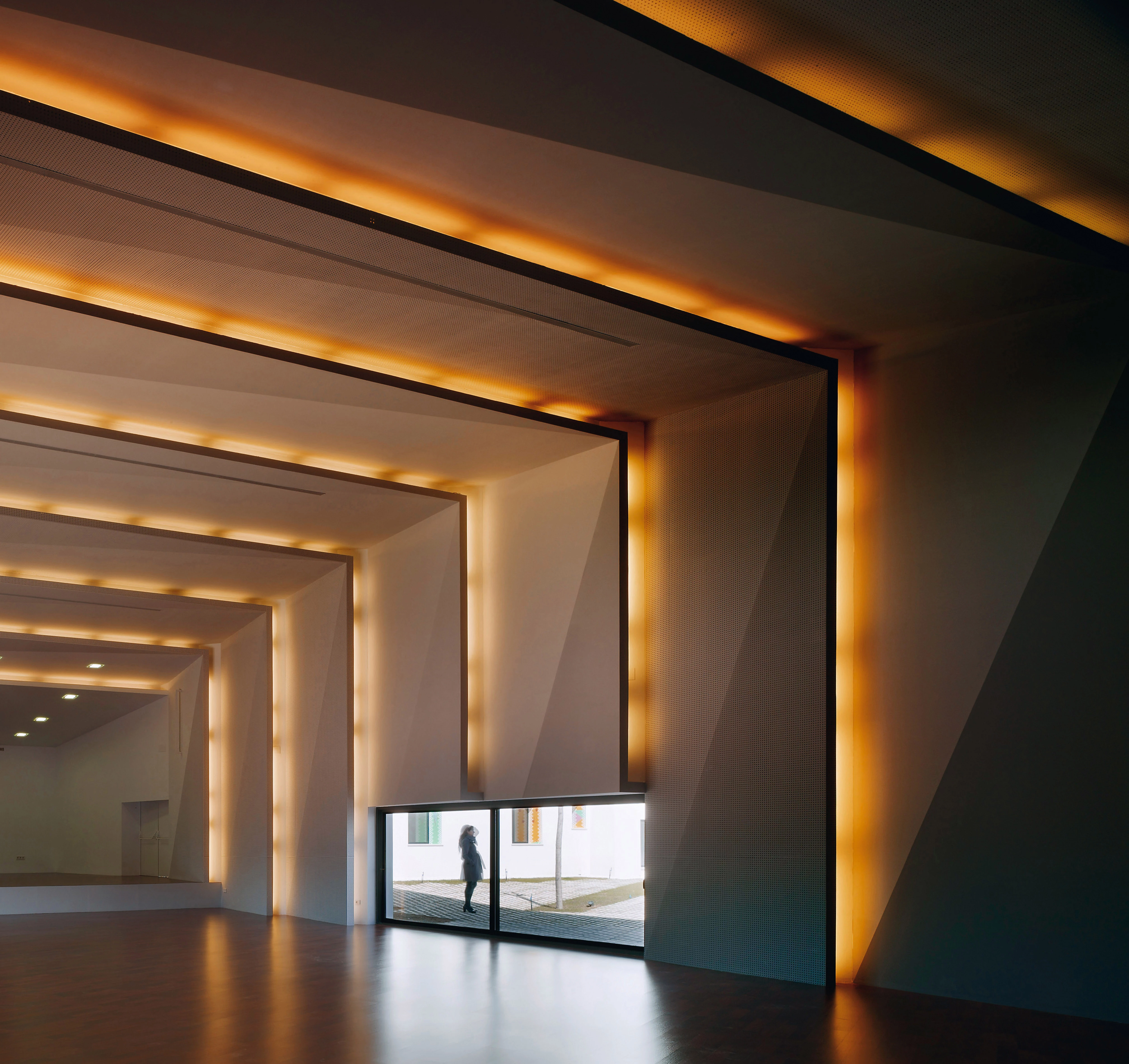 Para acondicionar acústica y estéticamente el interior de un volumen regular y carente de singularidad espacial se ha optado por usar una sección de piezas escalonadas y por colocar las luminarias ocultas entre las distintas piezas.