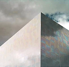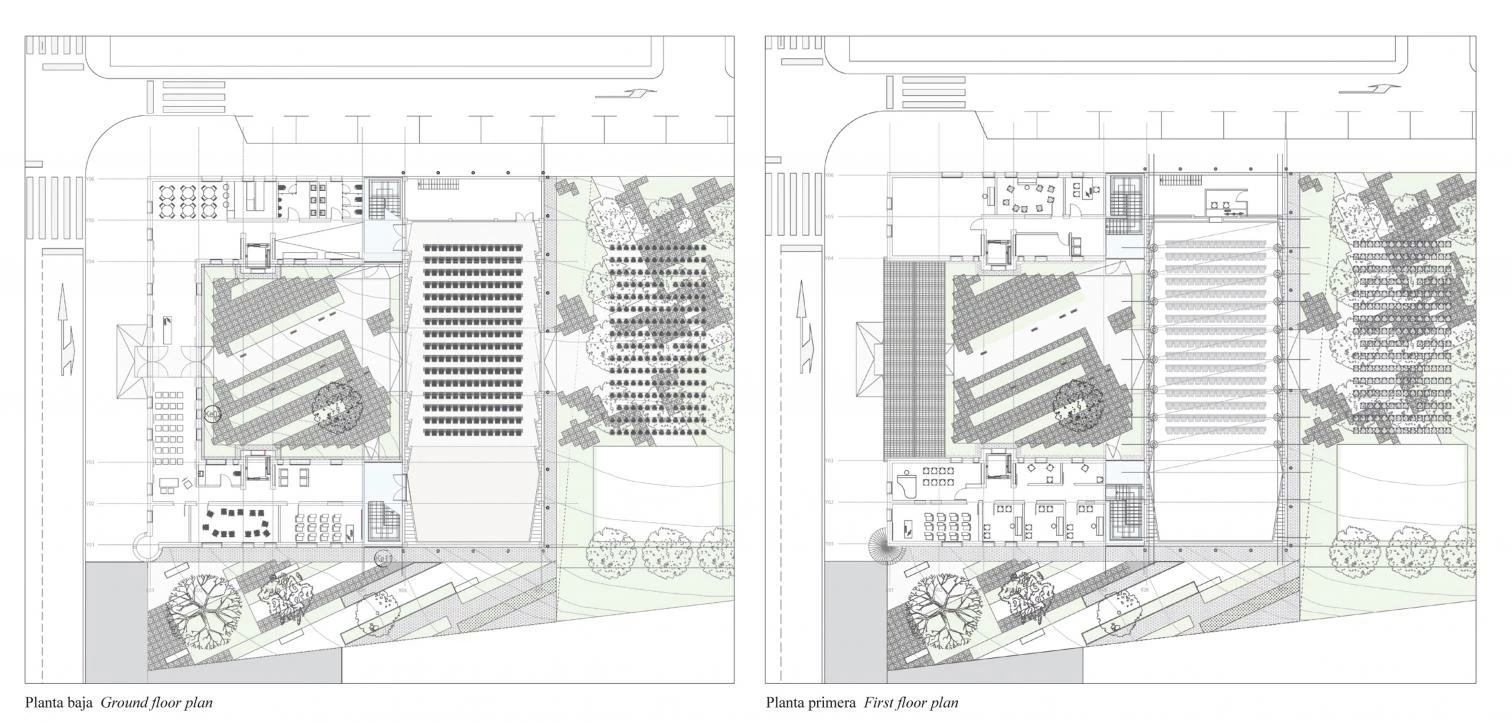Por su parte, la construcción nueva cierra el perímetro separándose de la antigua mediante dos cuerpos de escaleras delimitados por dos urnas de vidrio. En su interior, la sala cuenta con butacas móviles y con instalaciones capaces de ofrecer diferentes tipos de actos, para lo cual es preciso contar con un almacén. Constituida como una caja ciega, a excepción de las dos aberturas que la atraviesan en su eje transversal, se muestra como un elemento extraño en su contexto por su hermetismo y por el protagonismo del material del cerramiento.La utilización de un recubrimiento cerámico con un acabado nacarado crea un volumen vibrante y en constante cambio, ya sea este producido por las variaciones lumínicas o por el movimiento del observador. Este material se creó específicamente para esta obra, utilizando técnicas de cocción, vitrificado y deposición de metales.