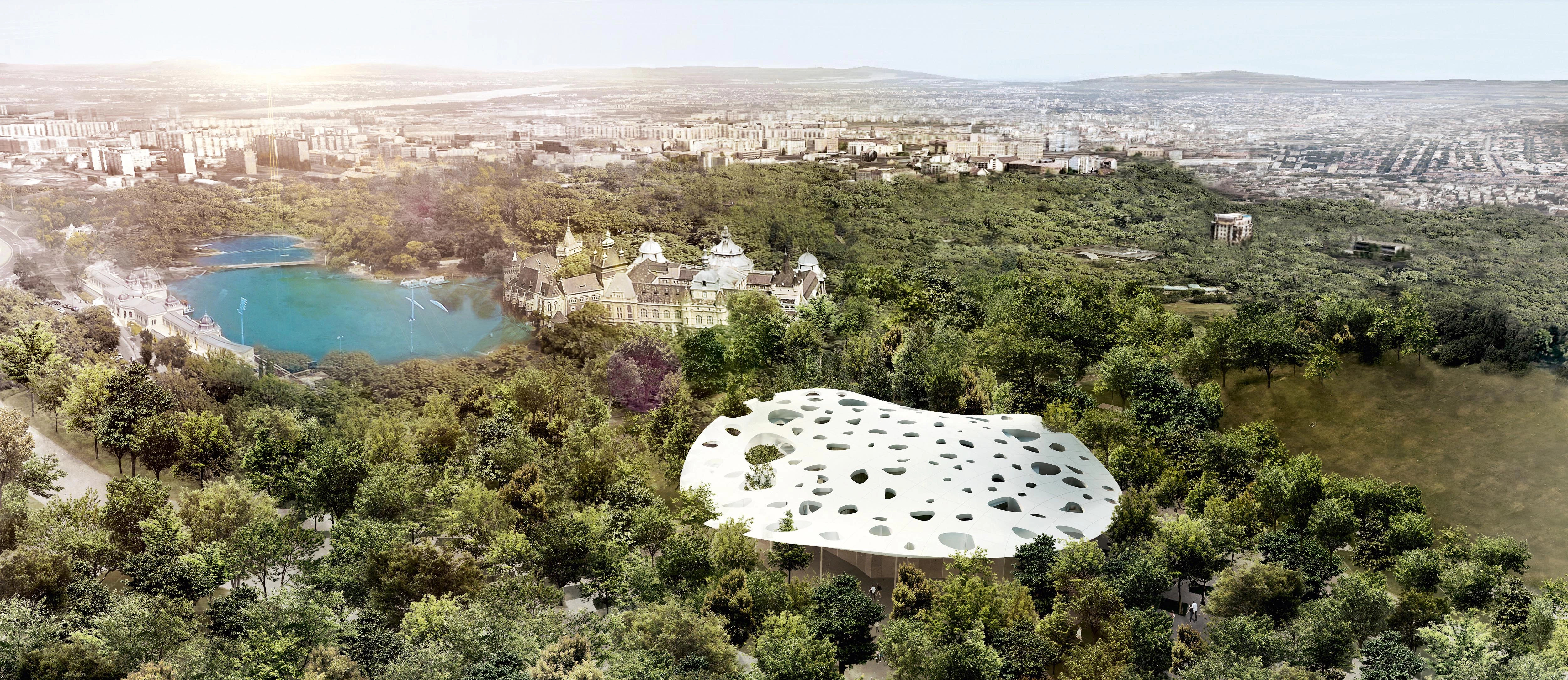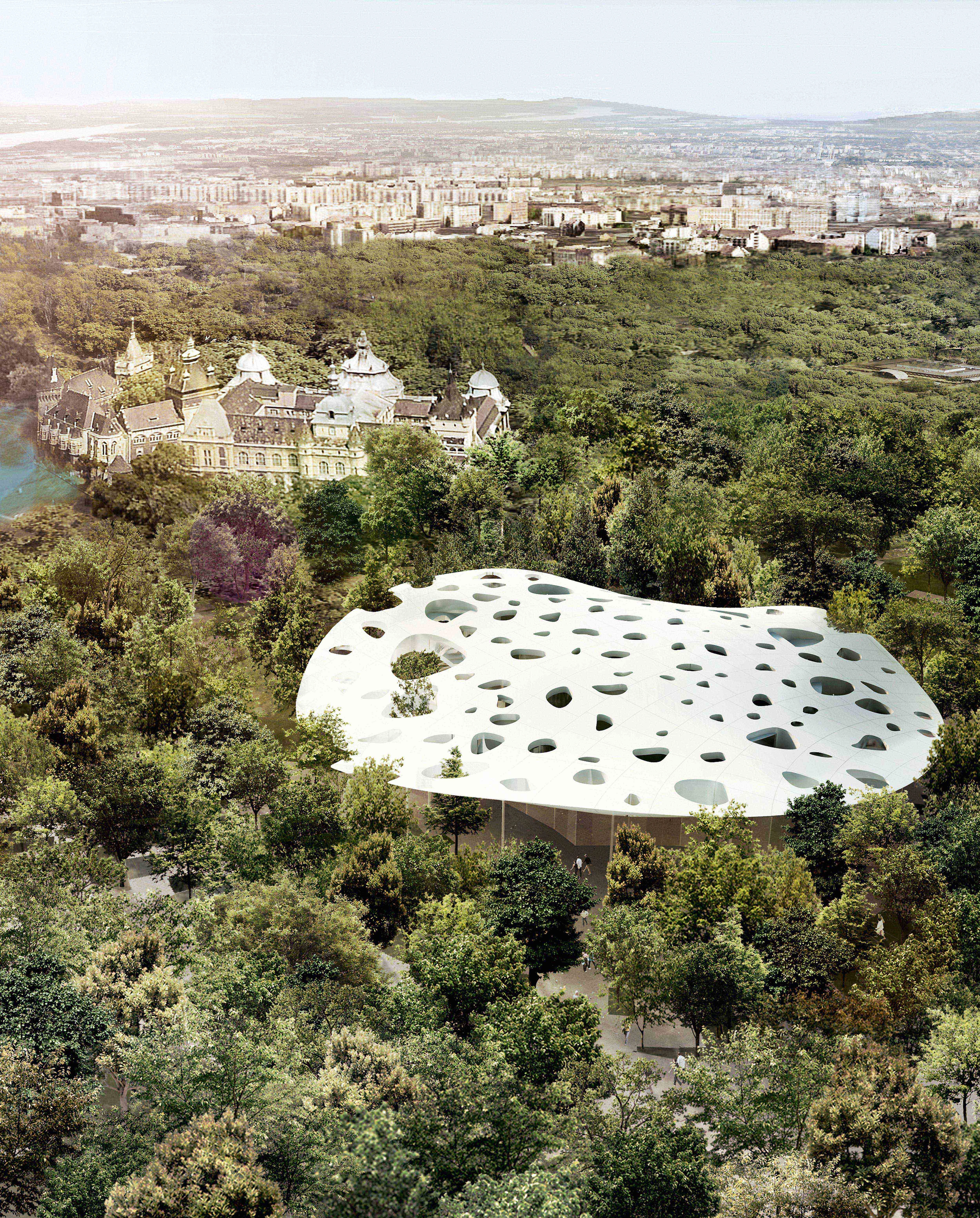El proyecto consiste en una colosal cubierta circular ondulada elevada a la altura de las copas de los árboles que rodean el edificio; una serie de perforaciones permite el paso de la luz cenital como lo hace el denso follaje natural del parque.