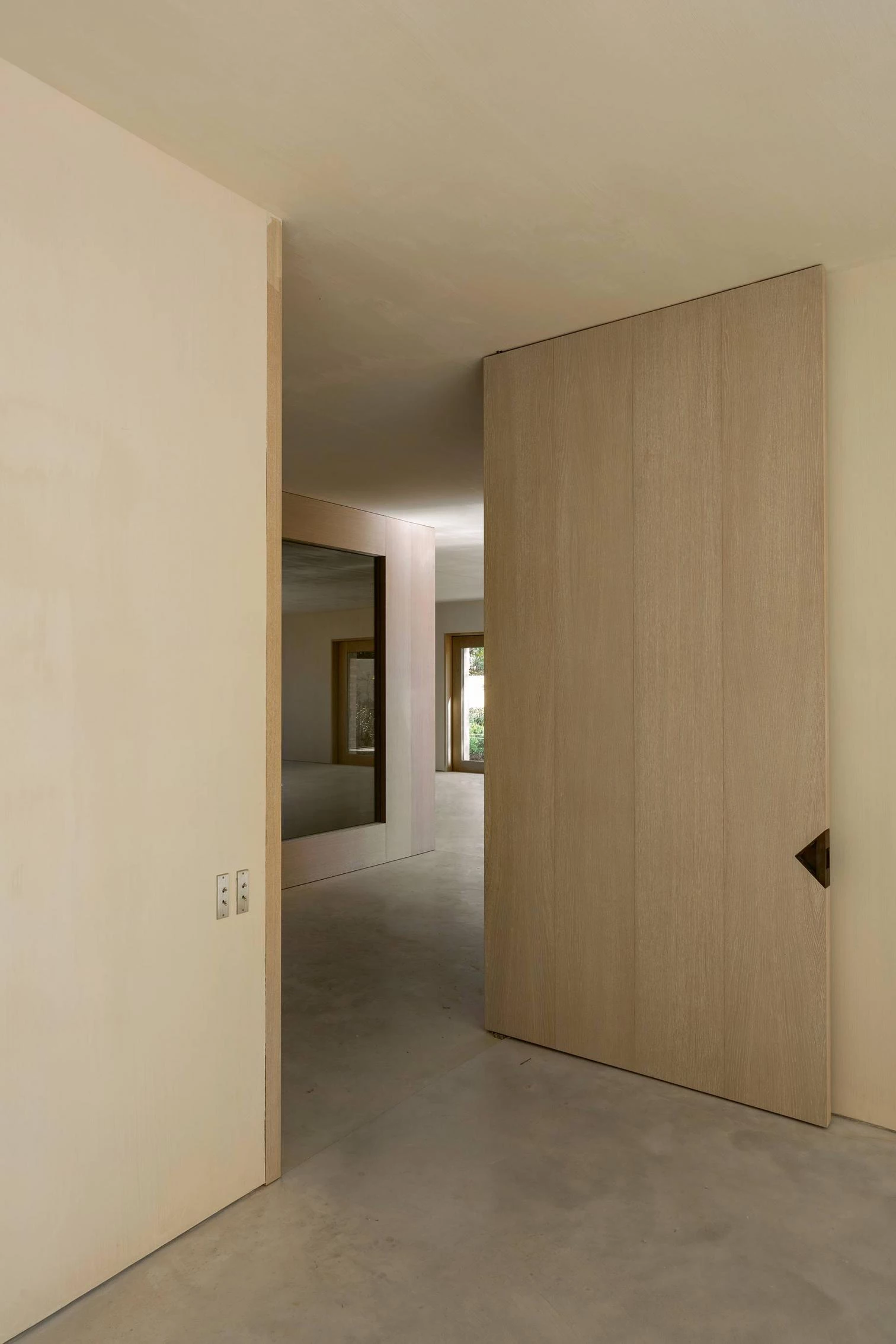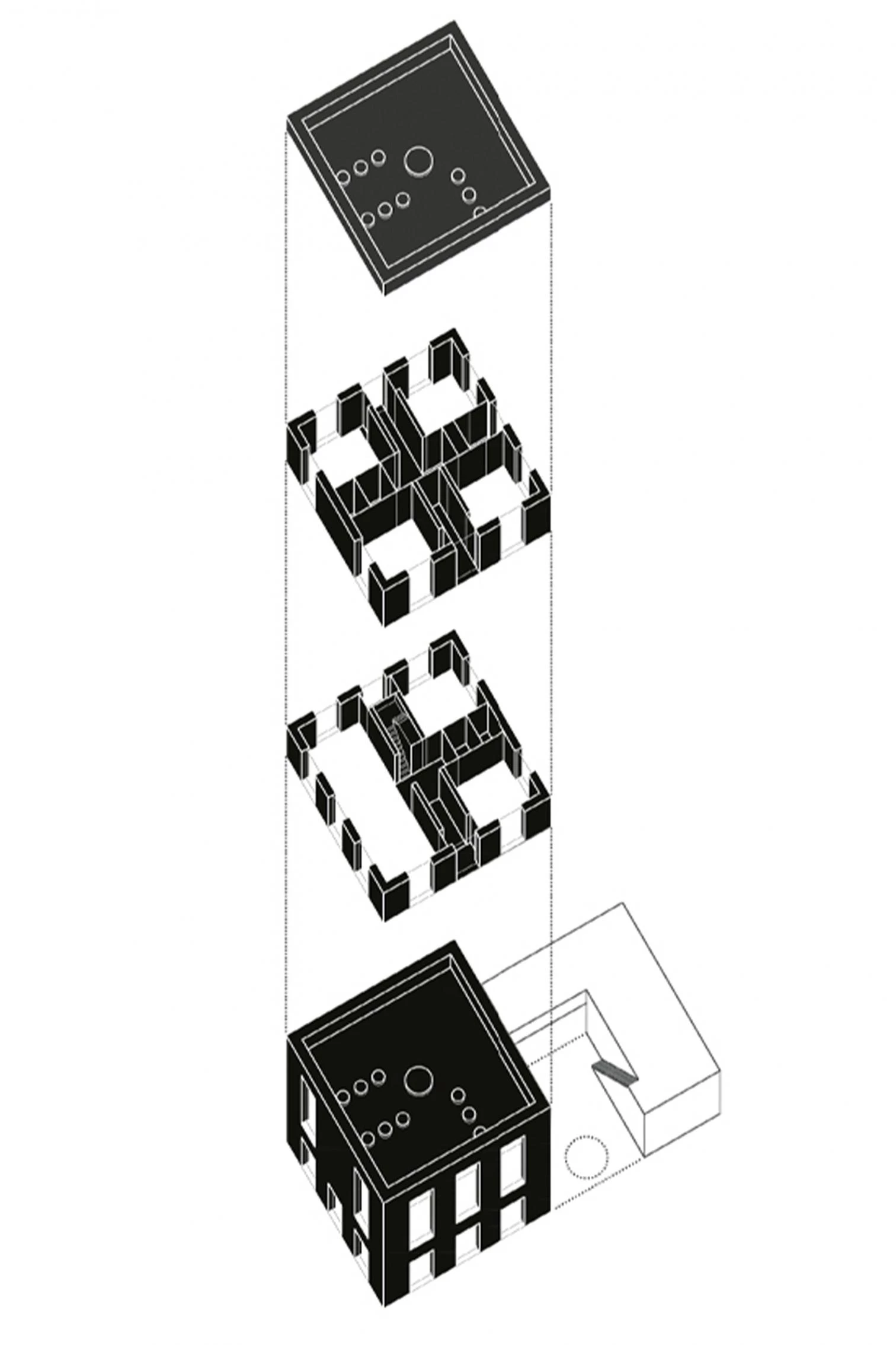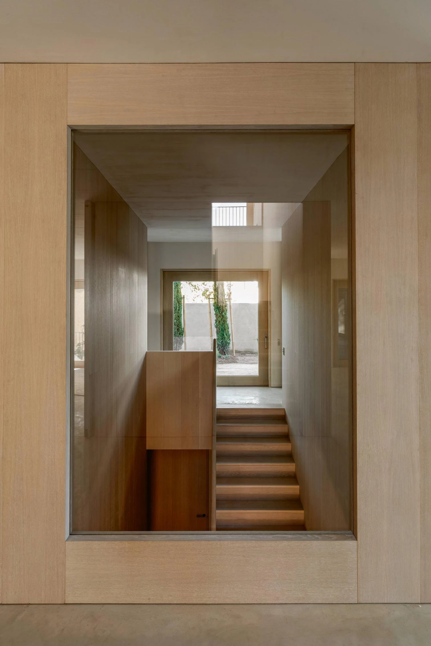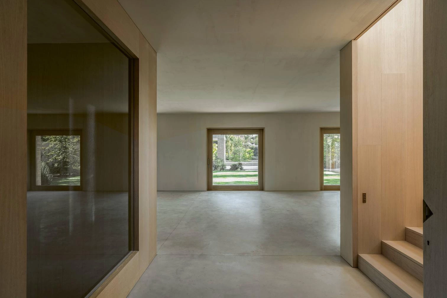 El volumen cúbico, organizado con un sistema de tres grandes huecos por planta, se despliega en tres niveles: el primero acoge los dormitorios de la familia, la planta baja las zonas comunes, y el sótano, con un amplio patio inglés arbolado, las dependencias auxiliares. La planta cuadrada se estructura a partir de una forma en cruz, que acoge las comunicaciones verticales y horizontales, mientras las habitaciones se ubican en los cuatro cuadrados de las esquinas.