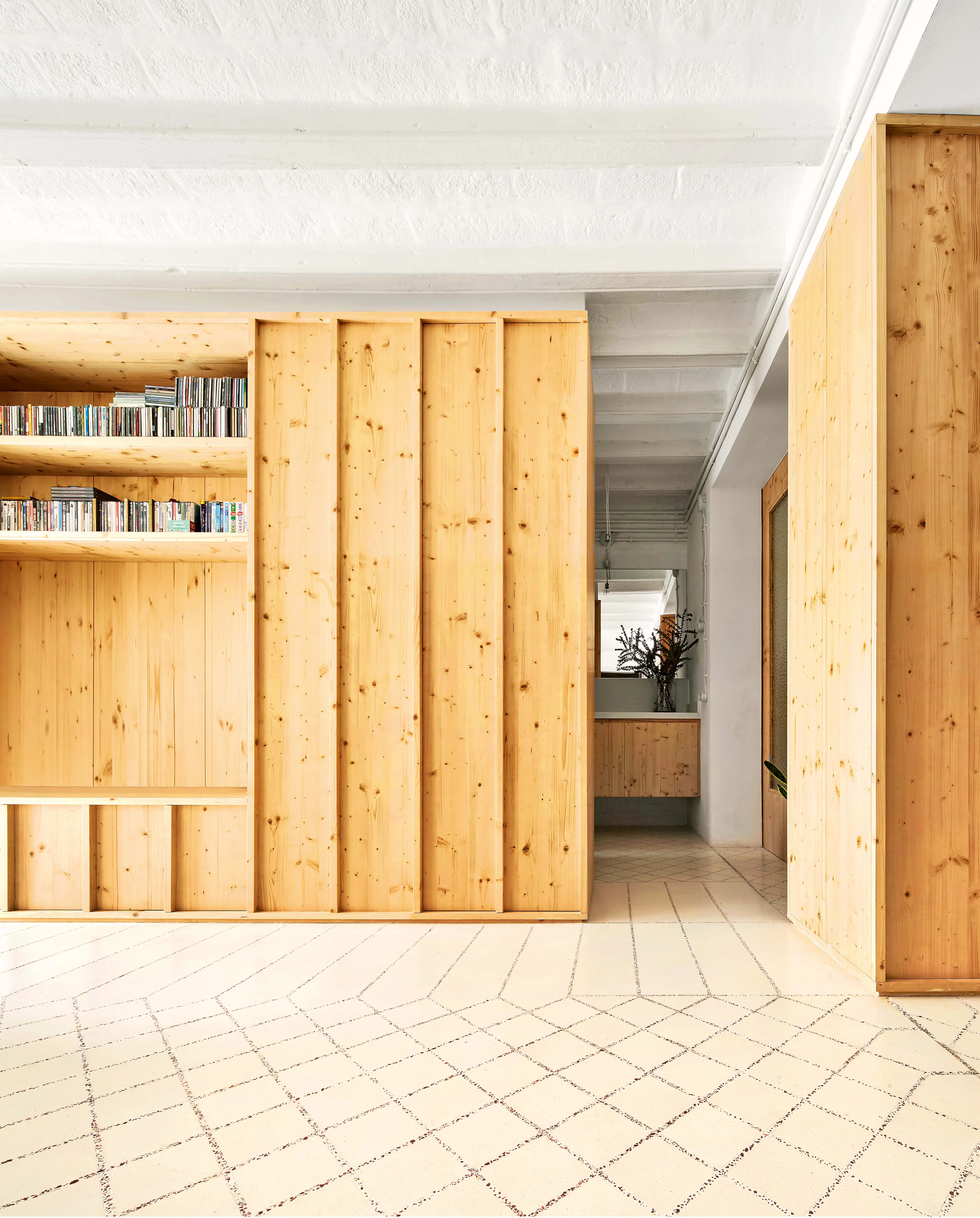 El proyecto consiste en la renovación de un apartamento pasante situado en el barcelonés paseo de Gracia, que se divide en tres cuerpos diferentes, dos de ellos con fachada y otro completamente interior. La intervención concentra todos los esfuerzos en un único gesto: abrir longitudinalmente la vivienda para conectar la calle con el patio de manzana. Con este fin, los tabiques preexistentes se eliminan y se introduce un armario corrido de madera que cruza la vivienda de un extremo a otro, y cuyo tono contrasta con la rigurosa paleta de blancos que caracteriza el interior de la vivienda. Por su parte, el nuevo pavimento, concebido como un palimpsesto, es el resultado de un proceso que consistió, primero, en retirar las piezas del solado preexistente y triturarlas, después, para obtener un agregado rojizo que se añadió a las juntas de un centímetro del nuevo pavimento, hecho con baldosas hidráulicas del mismo tamaño que las originales (13x13 centímetros).