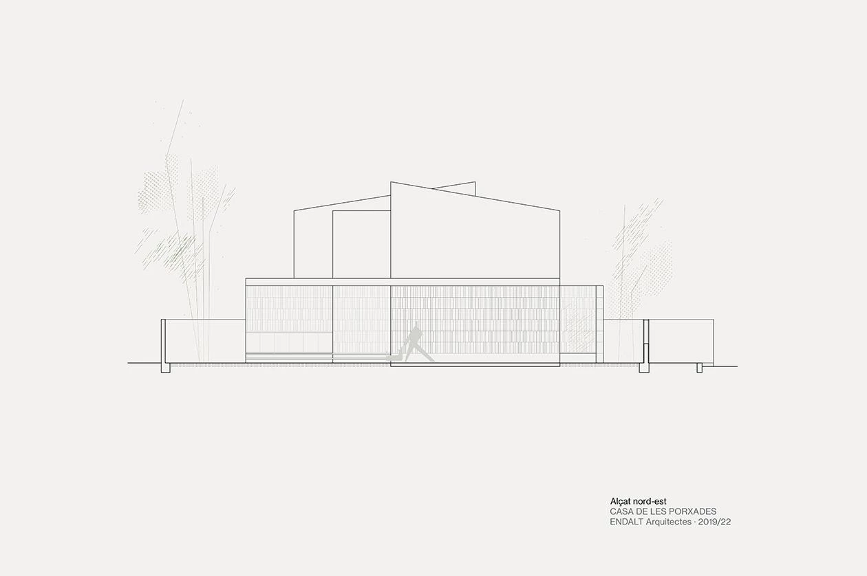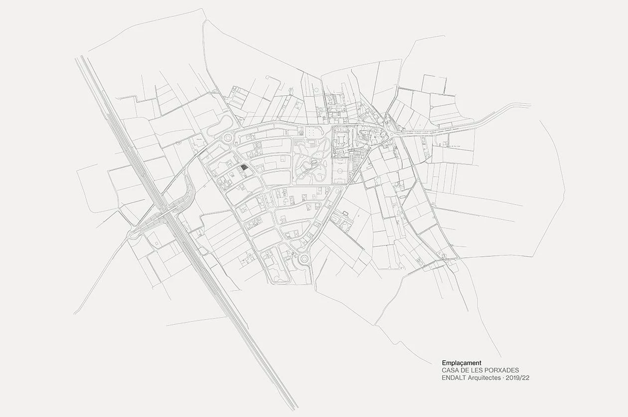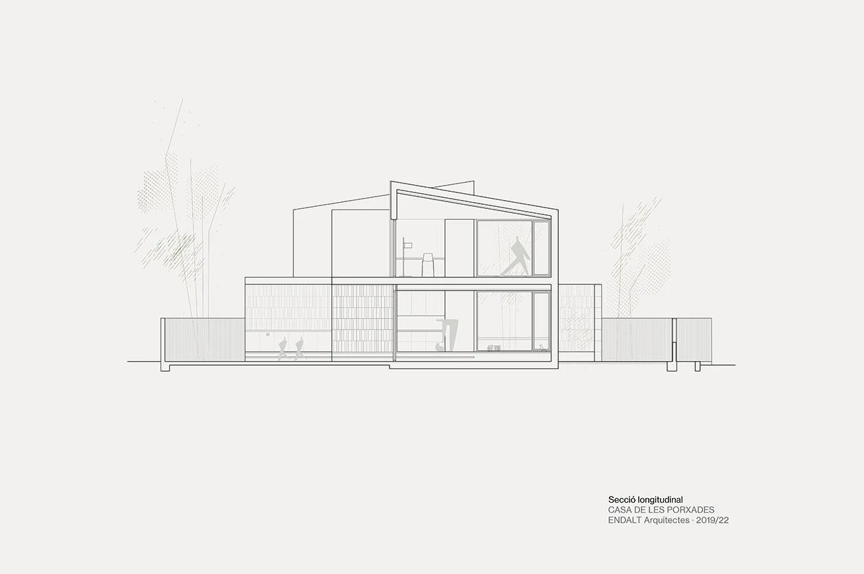 Con una superficie construida de 232 metros cuadrados, esta vivienda está inspirada formalmente en las alquerías situadas a escasos metros de distancia: casas de campo con tierras de labor, compuestas por un volumen principal a dos aguas al cual se le adosan otras construcciones de geometrías diversas. Organizada alrededor de un pequeño patio, la casa toma el nombre por sus porches en voladizo, un elemento de tradición mediterránea que aquí se generan al prolongar los forjados de la vivienda hacia el exterior. Sus dimensiones y disposición, orientados a sureste, ayudan a proteger el interior de la excesiva radiación solar en verano, pero permiten su acceso a la vivienda en invierno. La cerámica envuelve el conjunto con piezas de diferentes colores y formatos.