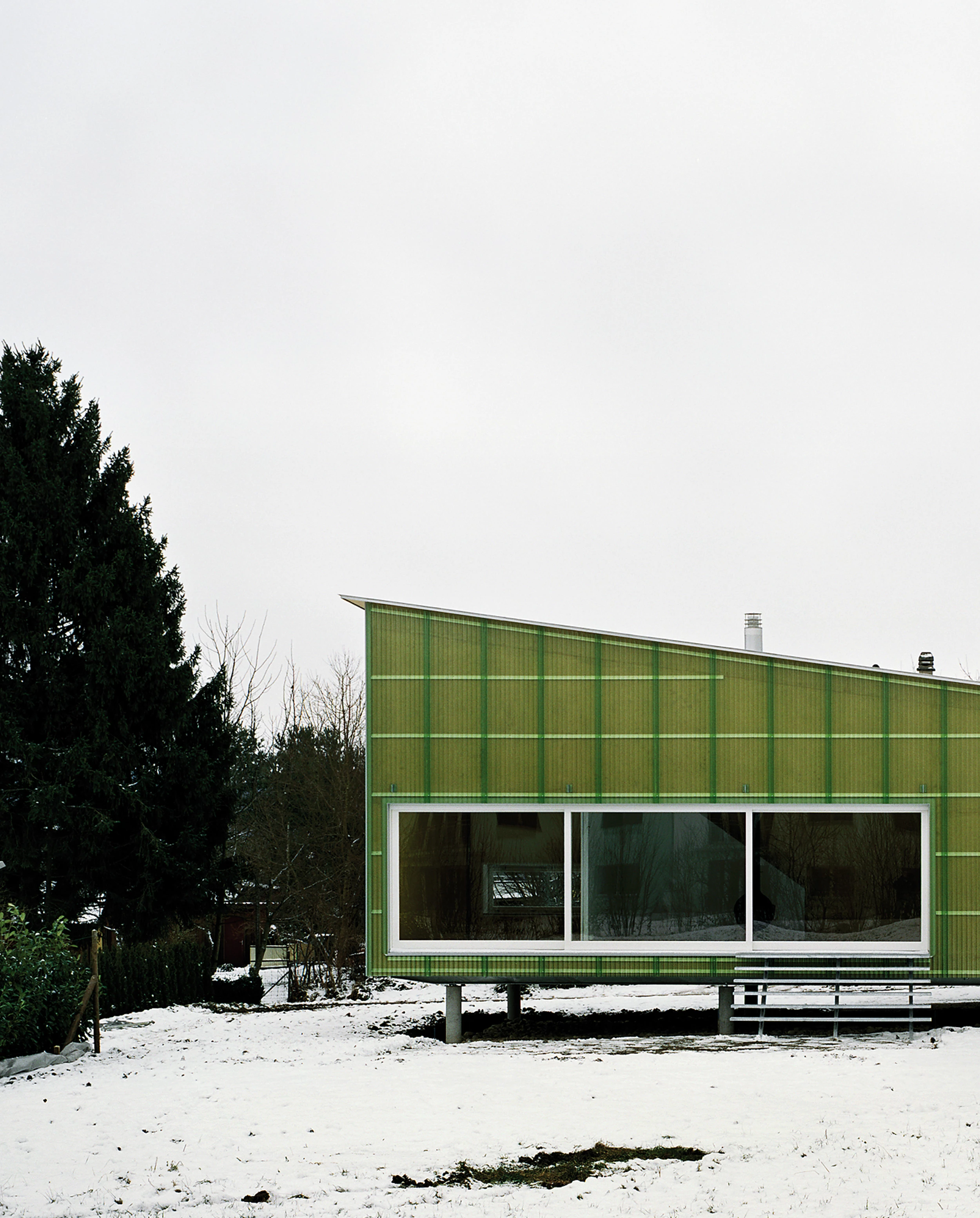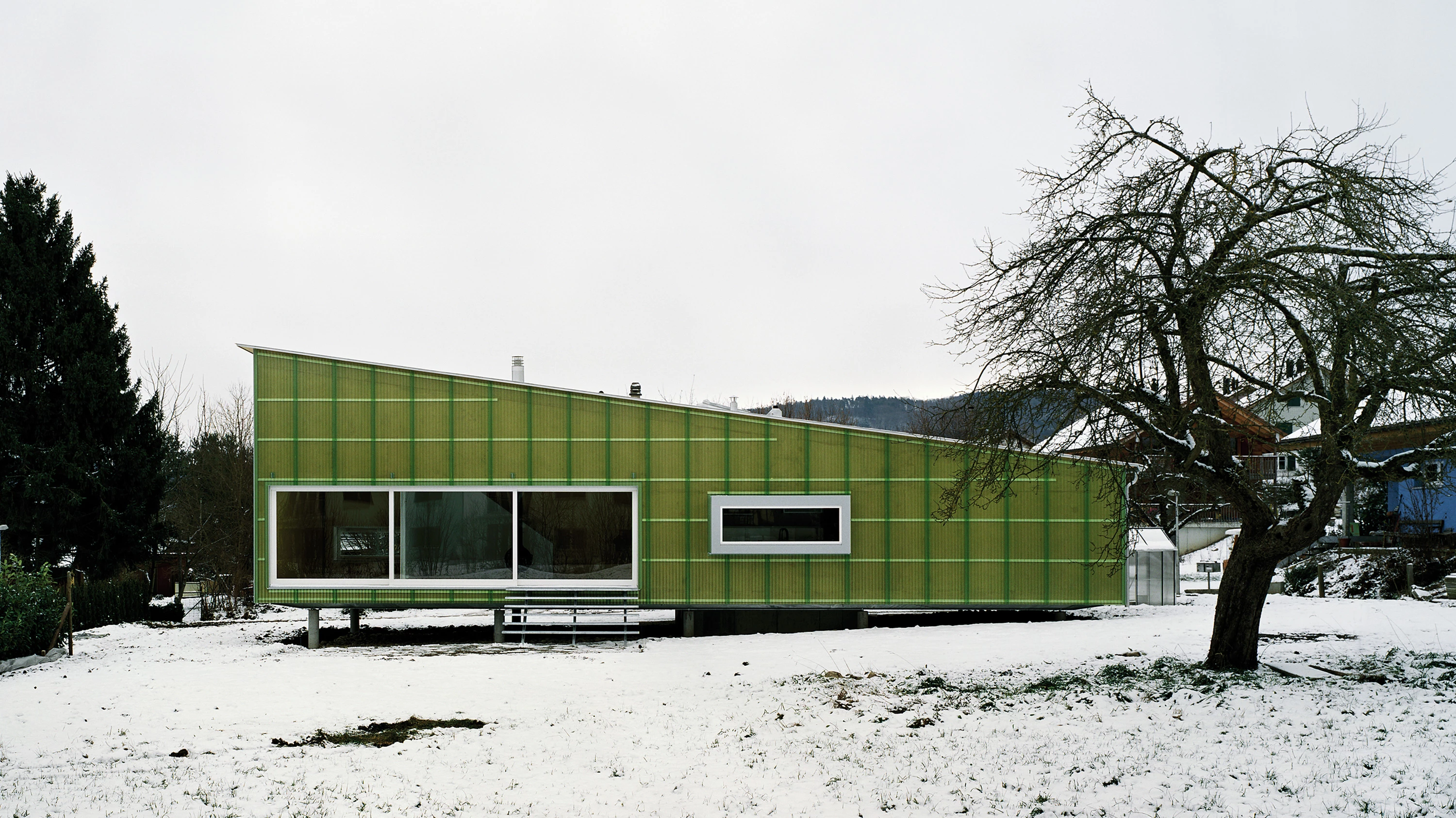 En el exterior, la casa se reviste con paneles de policarbonato que, además de evocar la superficie ondulante, verdosa y transparente del río Rin, ayuda a la generación de una fachada ventilada que prolonga la vida del cerramiento. La vivienda se asienta sobre unas antiguas ruinas romanas por lo que se eleva sobre unos pilotes metálicos que también protegen la vivienda de la humedad del terreno.