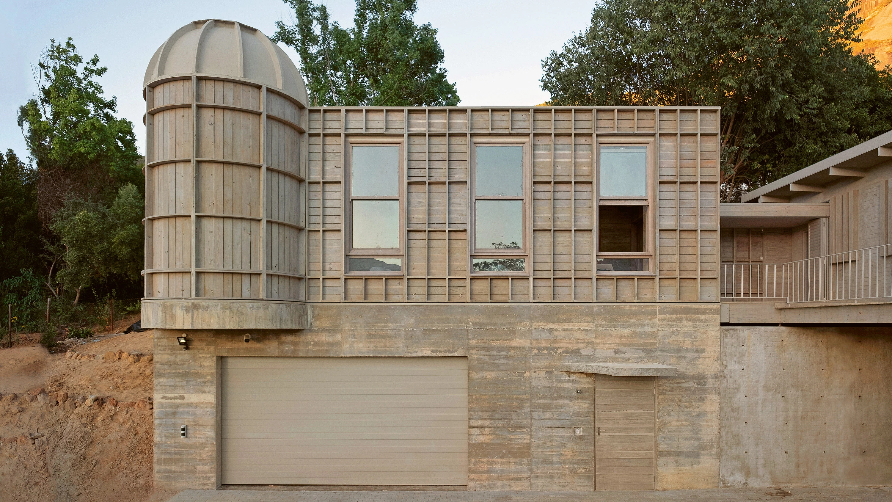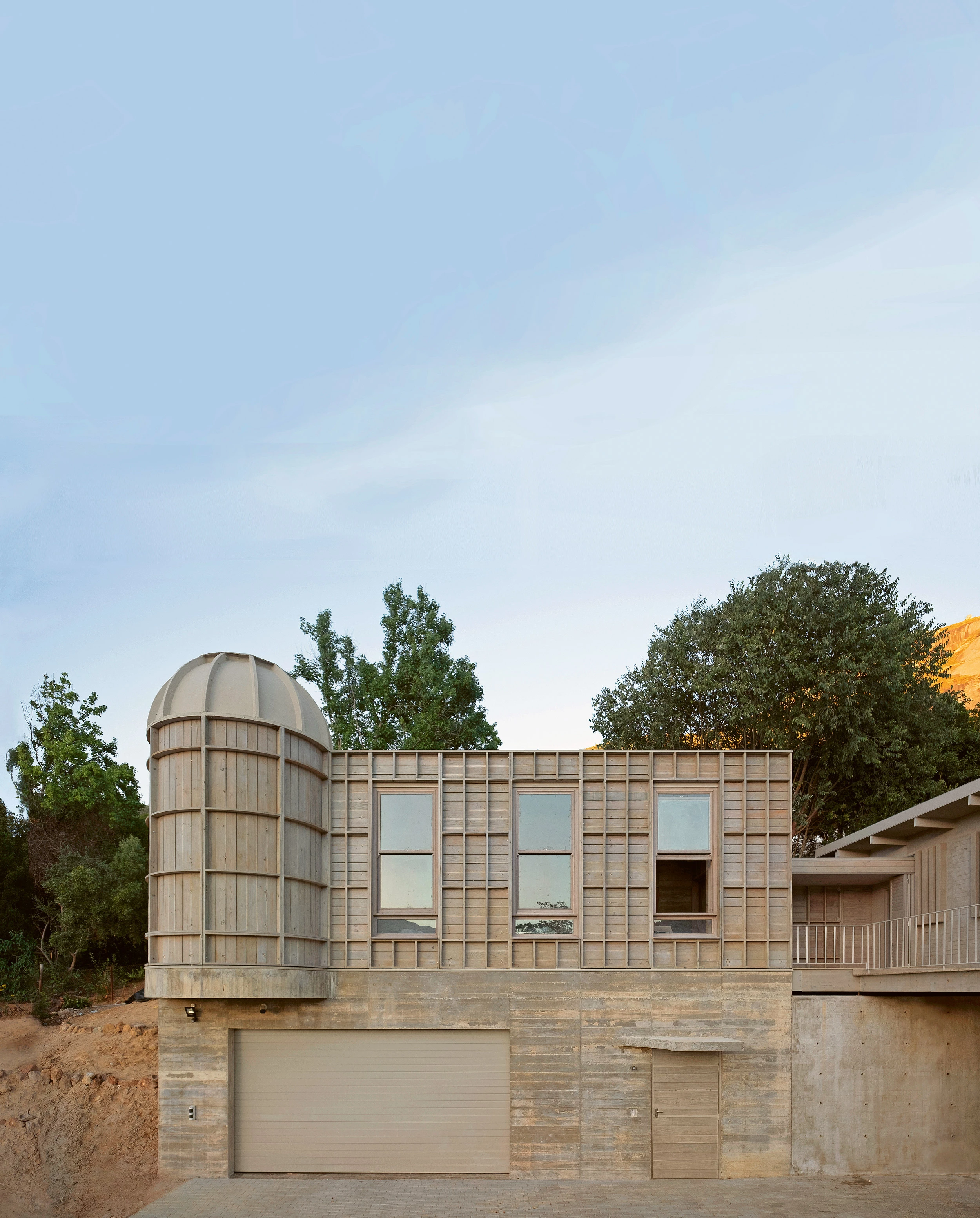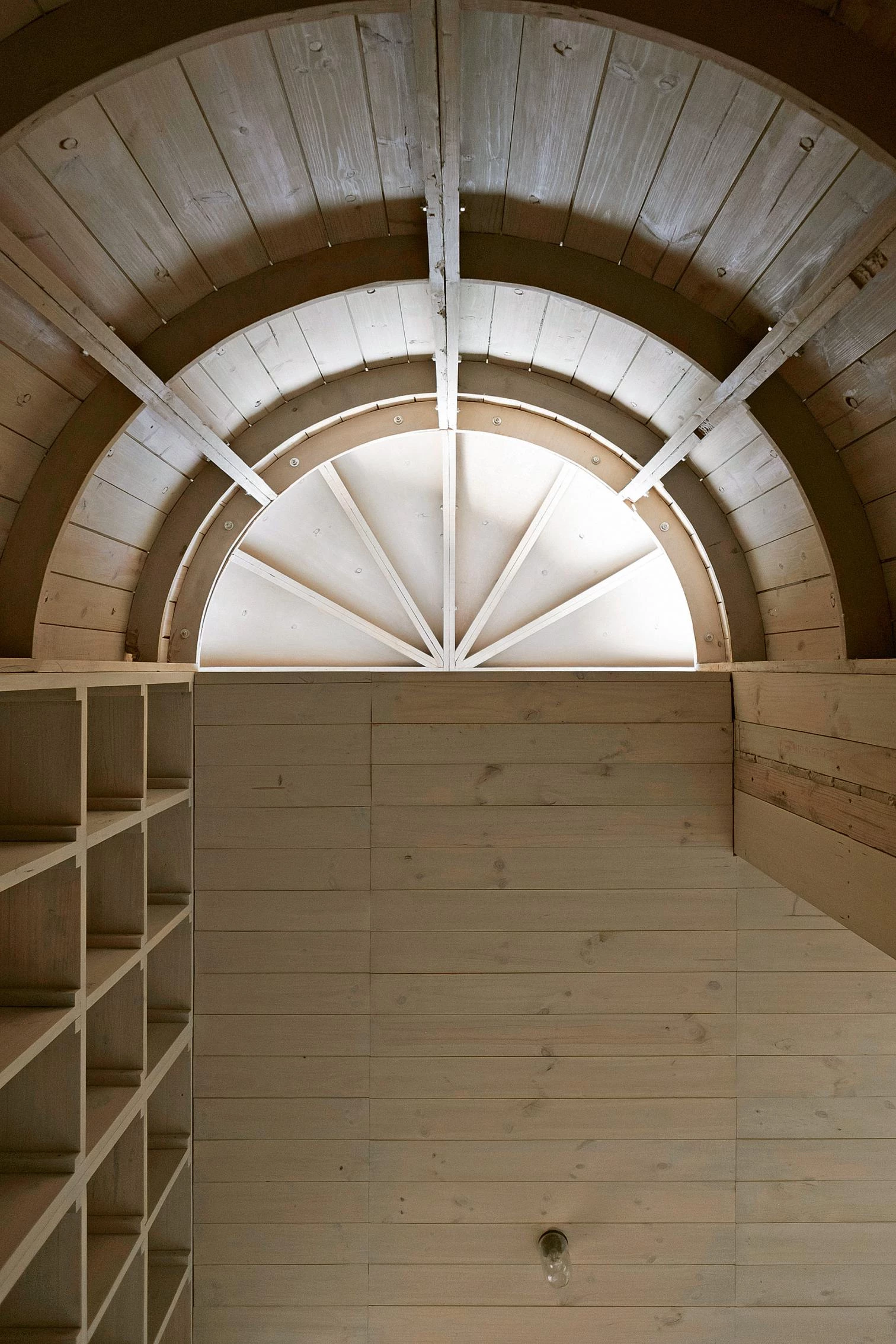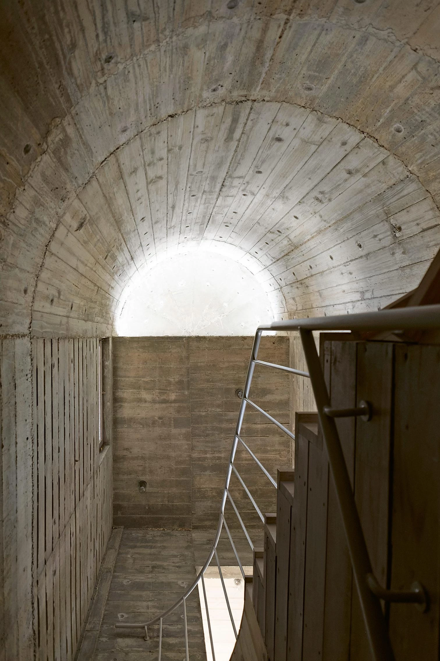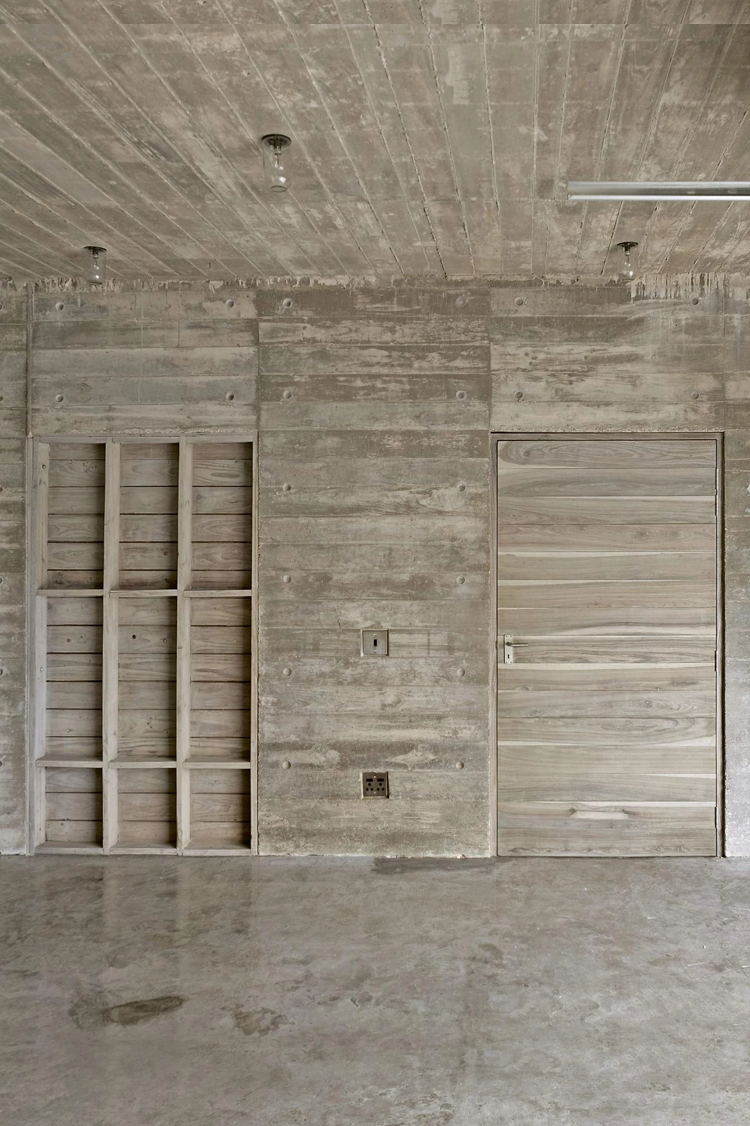 El nicho de madera curvo, coronado por una claraboya que introduce luz natural, procede del encofrado empleado para moldear el hueco de la escalera de hormigón —curvado a fin de permitir una silla salvaescaleras—. El dosel de hormigón sobre la entrada principal, por su parte, proviene de la reutilización del rellano de madera de la escalera como encofrado. Los huecos abiertos en los muros interiores de hormigón se rellenan con paneles de encofrado, como expresión del proceso constructivo. De esta manera, el edificio es la encarnación de cómo llegó a ser: su imagen revela su propia historia.