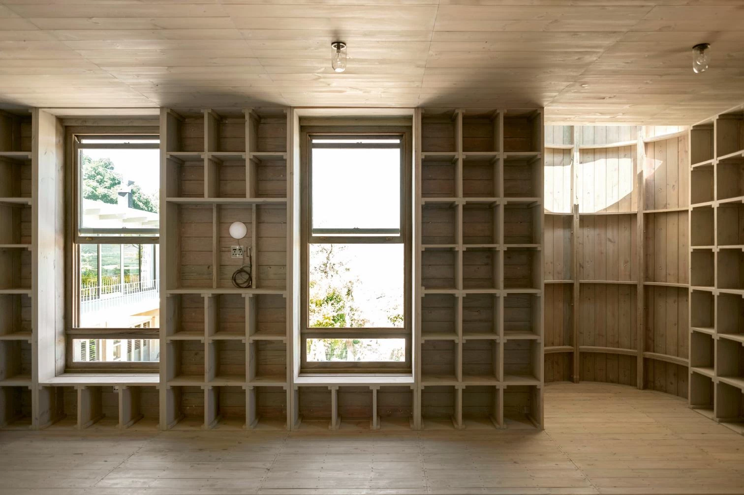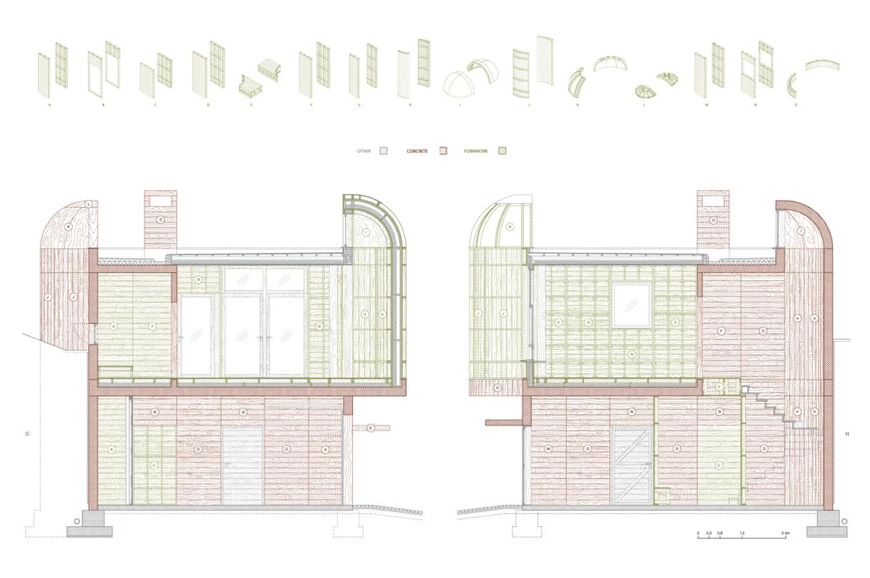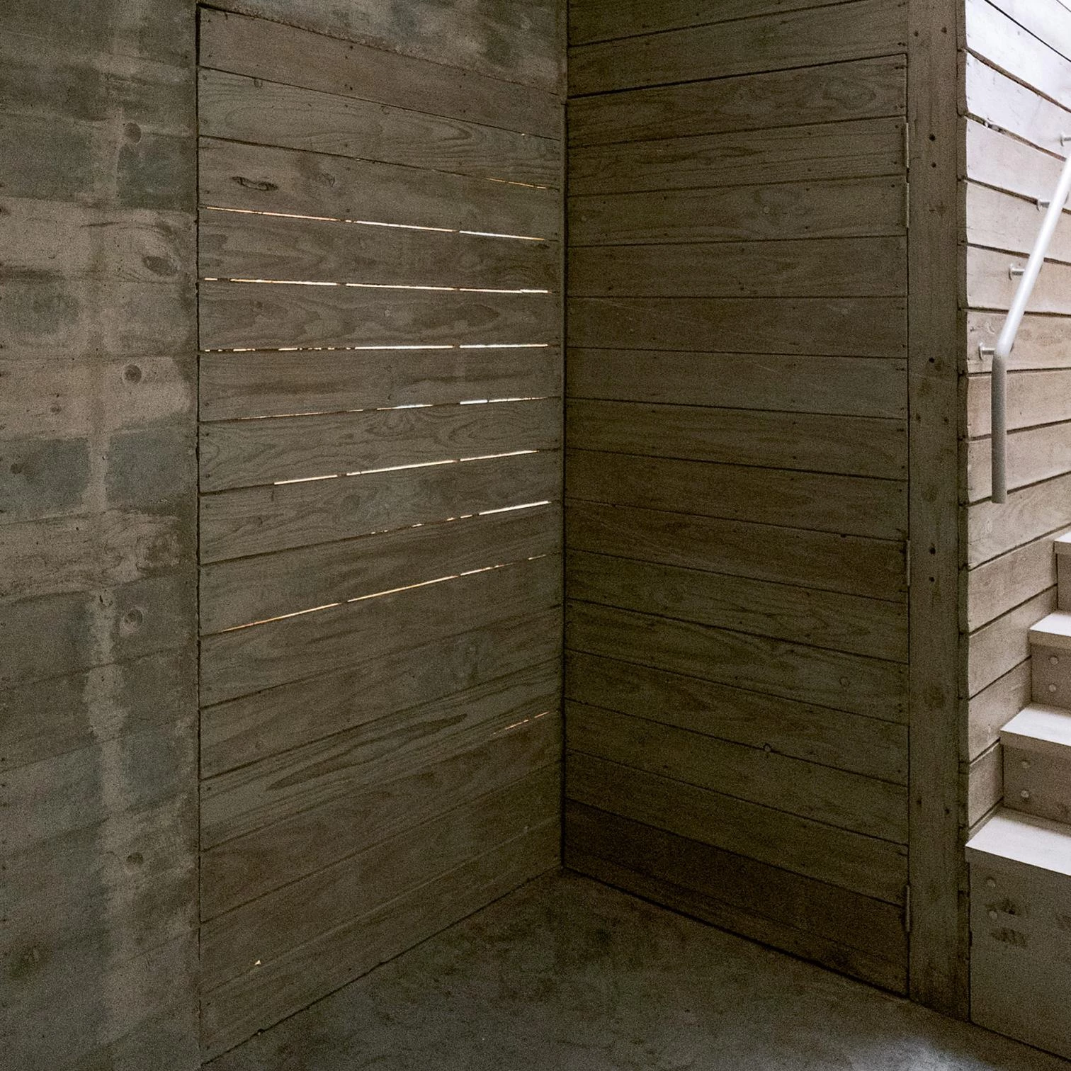 Las partes del edificio que están en contacto con el suelo se construyen con hormigón; para las que no lo están se reutilizan, inalterados, los paneles de madera de encofrado utilizados para verter el hormigón. Así, el encofrado de madera da textura al hormigón visto, y el hormigón visto da pátina al encofrado de madera. Los paneles de encofrado configuran los espacios y usos de hormigón visto, y viceversa. Esta interrelación da expresión al edificio.