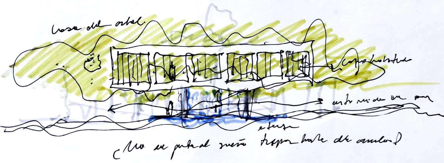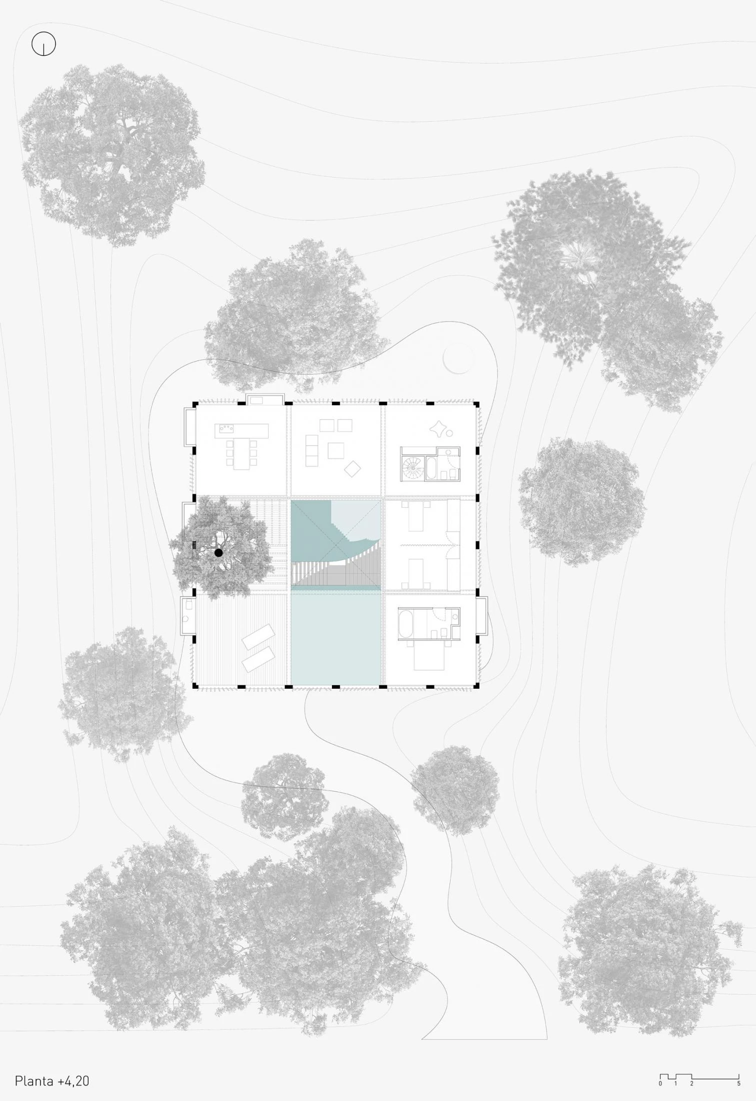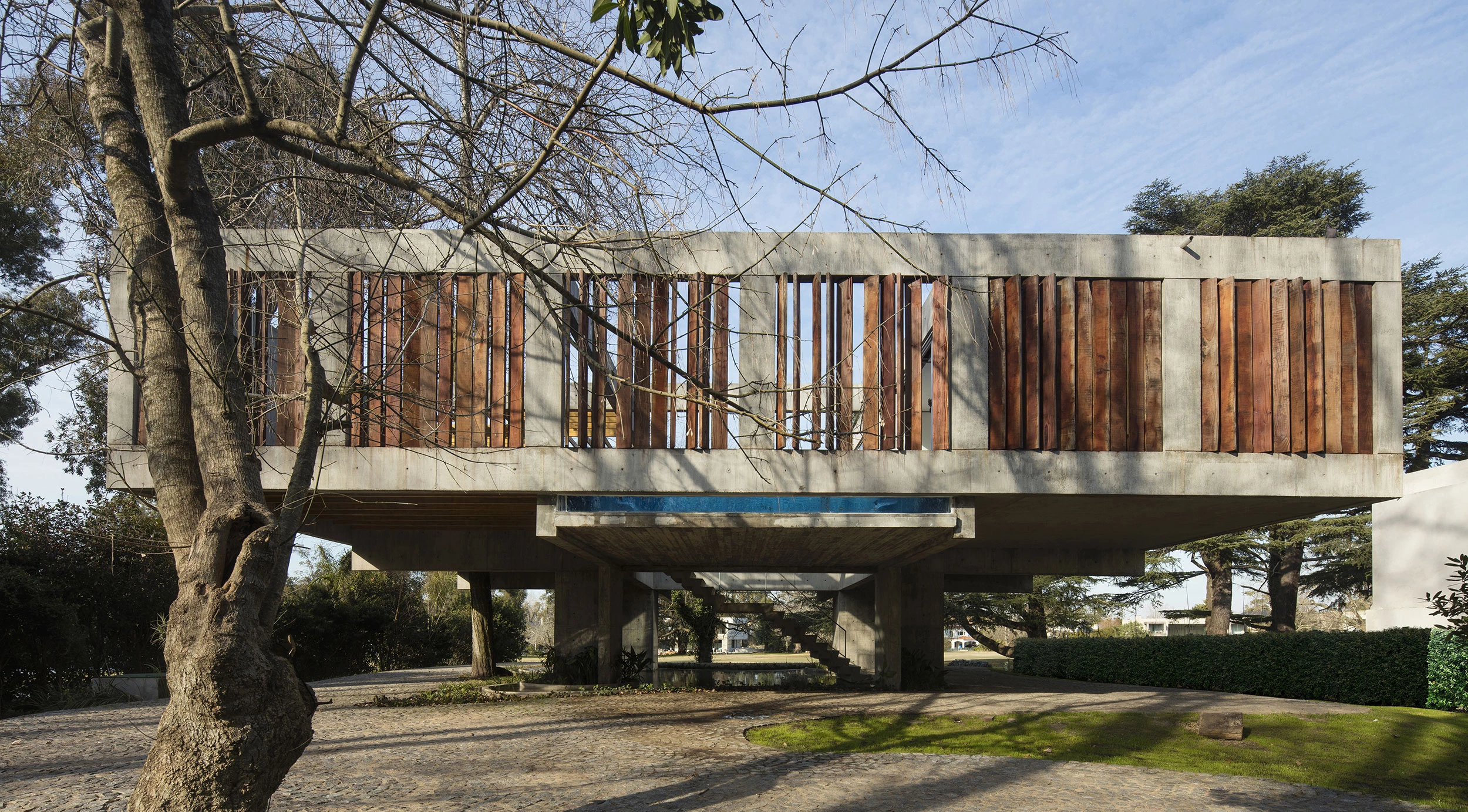 El estudio argentino liderado por Sofía Botteri y Patricio Connell proyecta esta casa para una familia joven con dos niños, situada en un club de campo de la provincia de Buenos Aires. Rodeada de árboles, la estructura modular que ocupa 180 metros cuadrados está definida por una composición de vigas Vierendeel de hormigón, apoyadas sobre ménsulas. En el corazón del volumen, un vacío actúa como regulador ambiental y suprime la idea de estratos separados. El cerramiento quebrado con tablones de madera móviles actúa como protector del sol y de la intimidad.