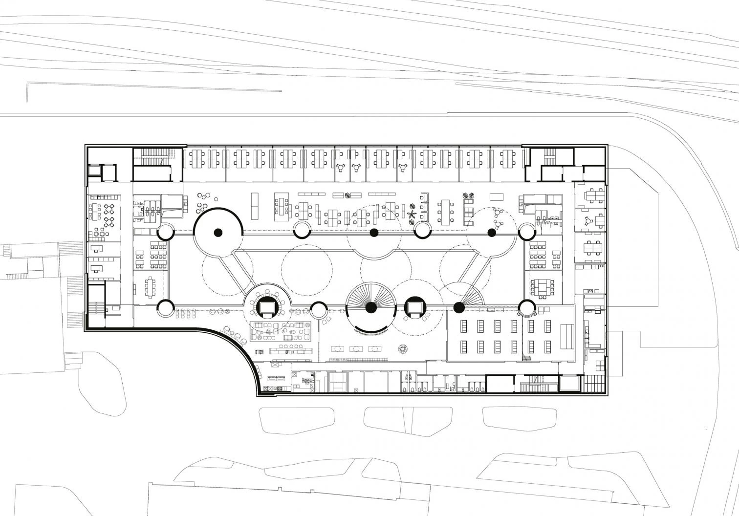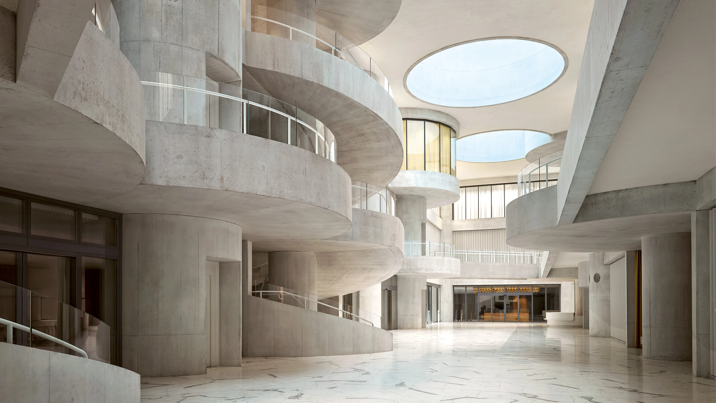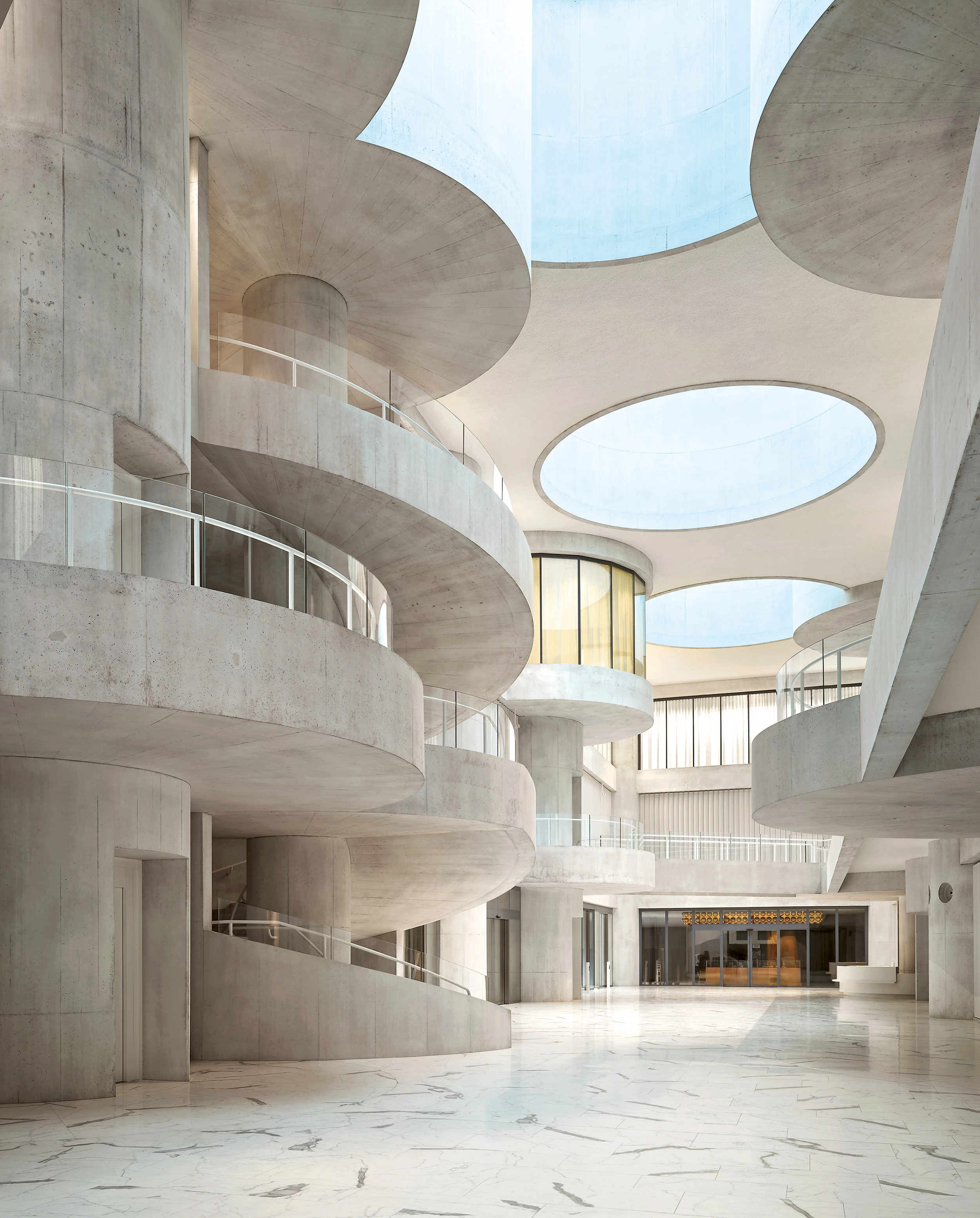 Los diferentes programas de difusión e investigación se organizan en torno a un vacío central de ondulantes formas en el que la gran escala y la desnudez marmórea confieren al ambiente comercial un carácter cívico clásico.