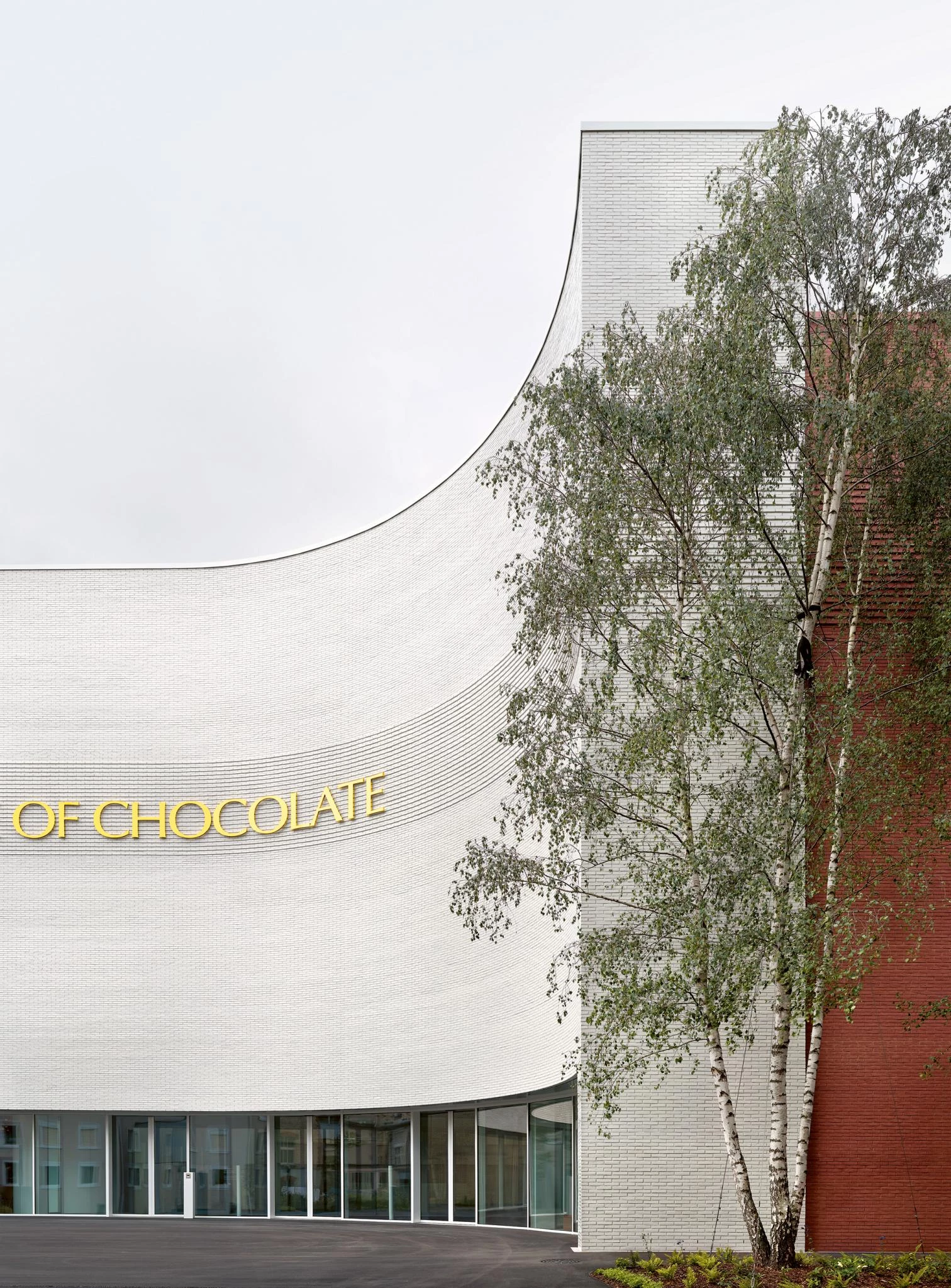 El nuevo buque insignia ocupa un volumen rectangular de ladrillo que reformula la apariencia del complejo industrial chocolatero y se repliega en una esquina para generar una plaza y recibir a los visitantes.