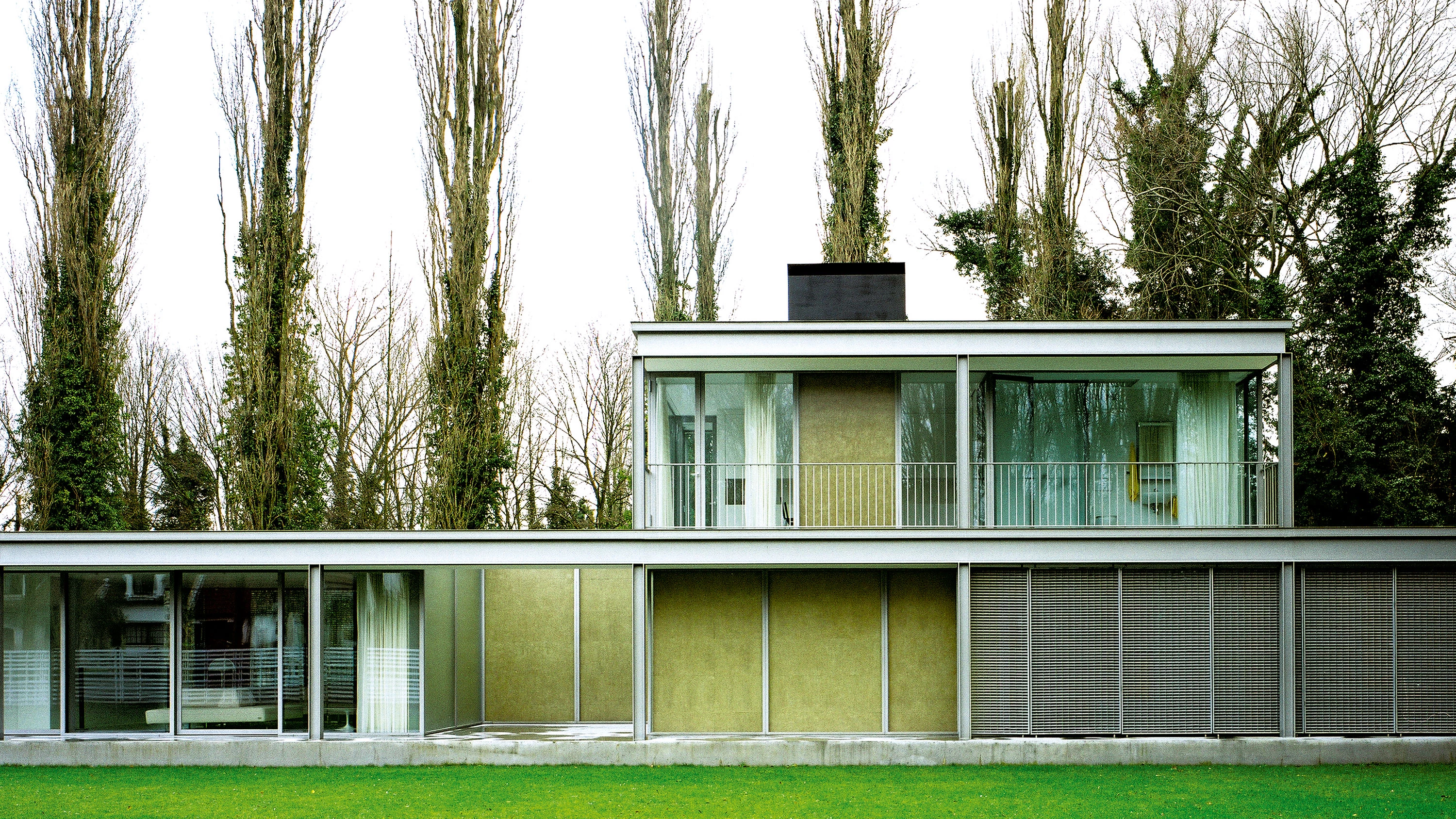 El número limitado de materiales que se han empleado refuerza la unidad del proyecto: el mismo hormigón del basamento continúa en los suelos, todos los elementos portantes son de acero y todos los cerramientos de vidrio. La isotropía de esta piel homogénea queda perturbada por algunos elementos que singularizan determinadas partes, protegiendo su intimidad: desde las pesadas cortinas de distintos colores hasta el entramado metálico que envuelve la parte más privada de la casa y se superpone al frente de vidrio proporcionando un filtro que no dificulta el paso de la luz pero impide la visión desde el exterior... [+]