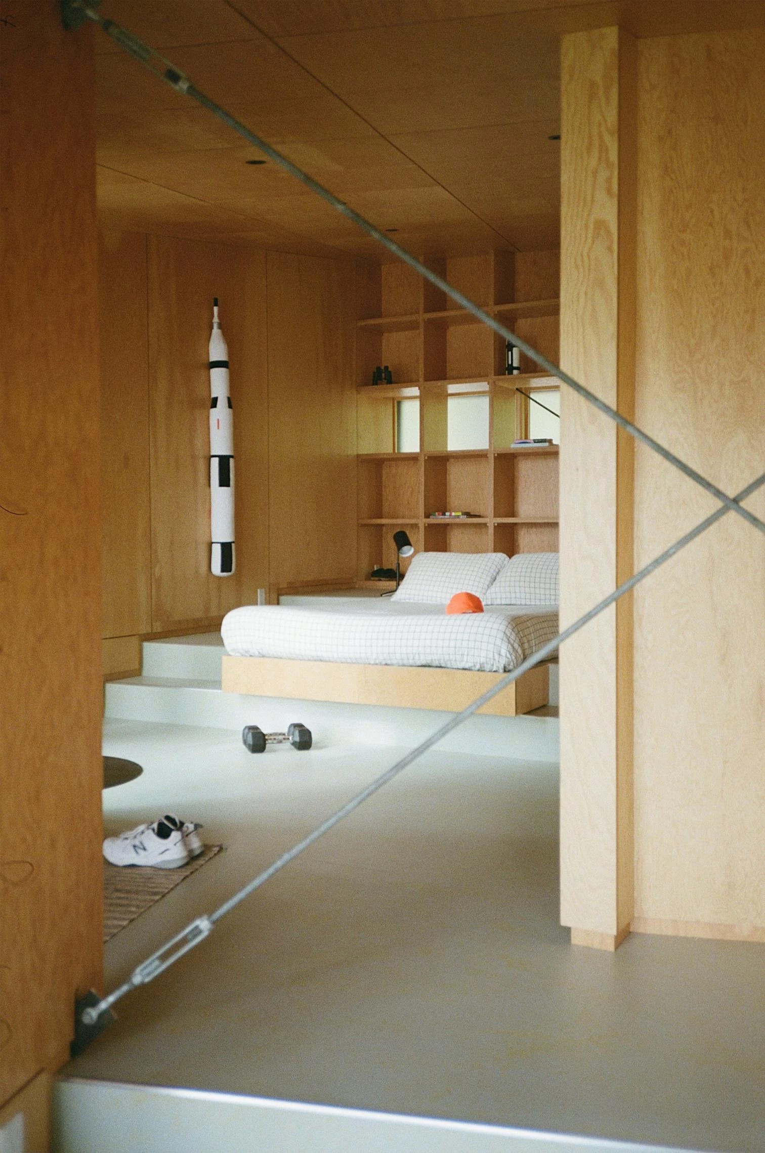 Las planchas de acero y el estampado militar de la envoltura sugieren un hermetismo en contraste con la concatenación de plataformas y cálidos acabados que animan a la exhibición del cuerpo y el disfrute ante el paisaje.