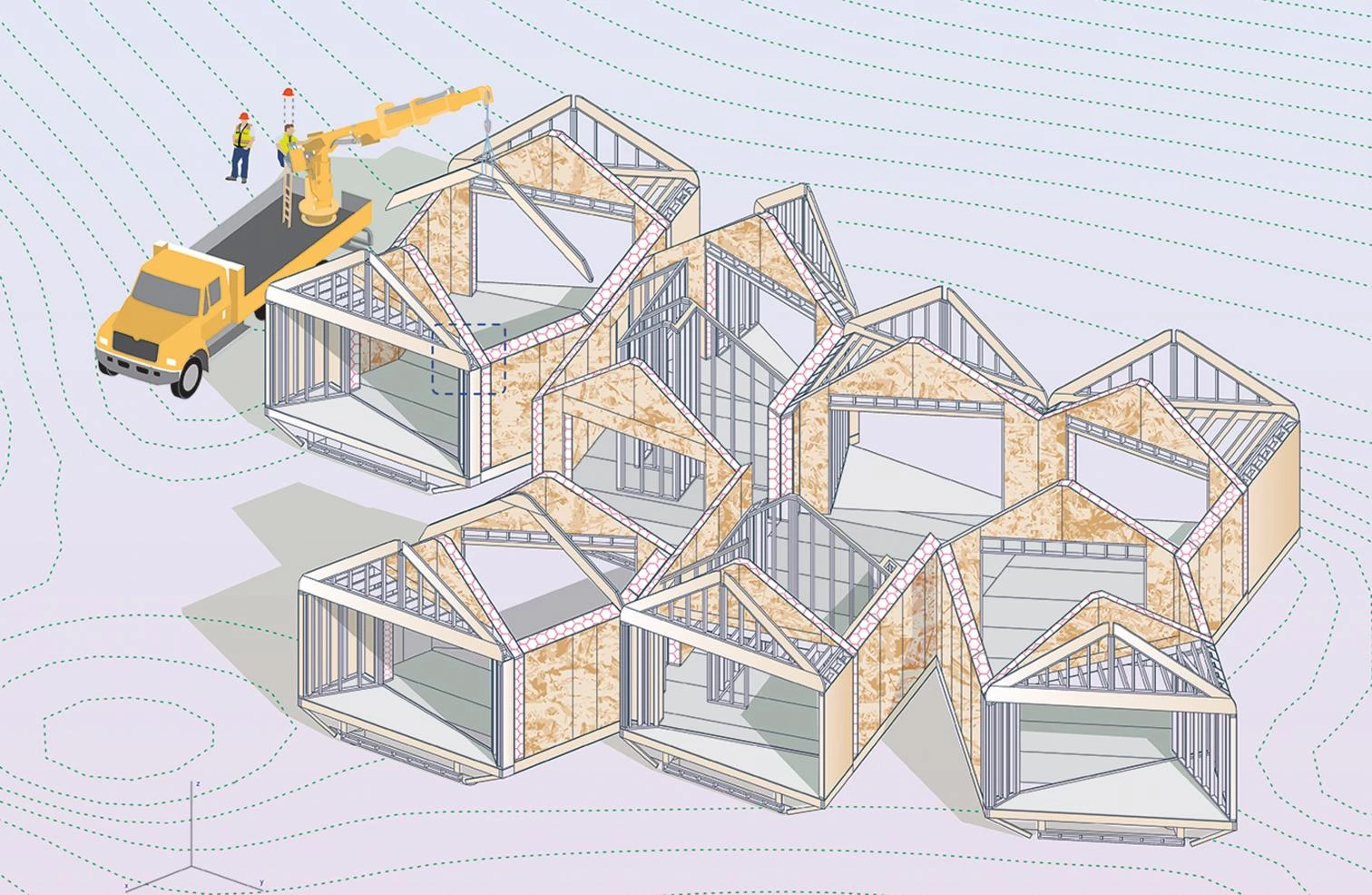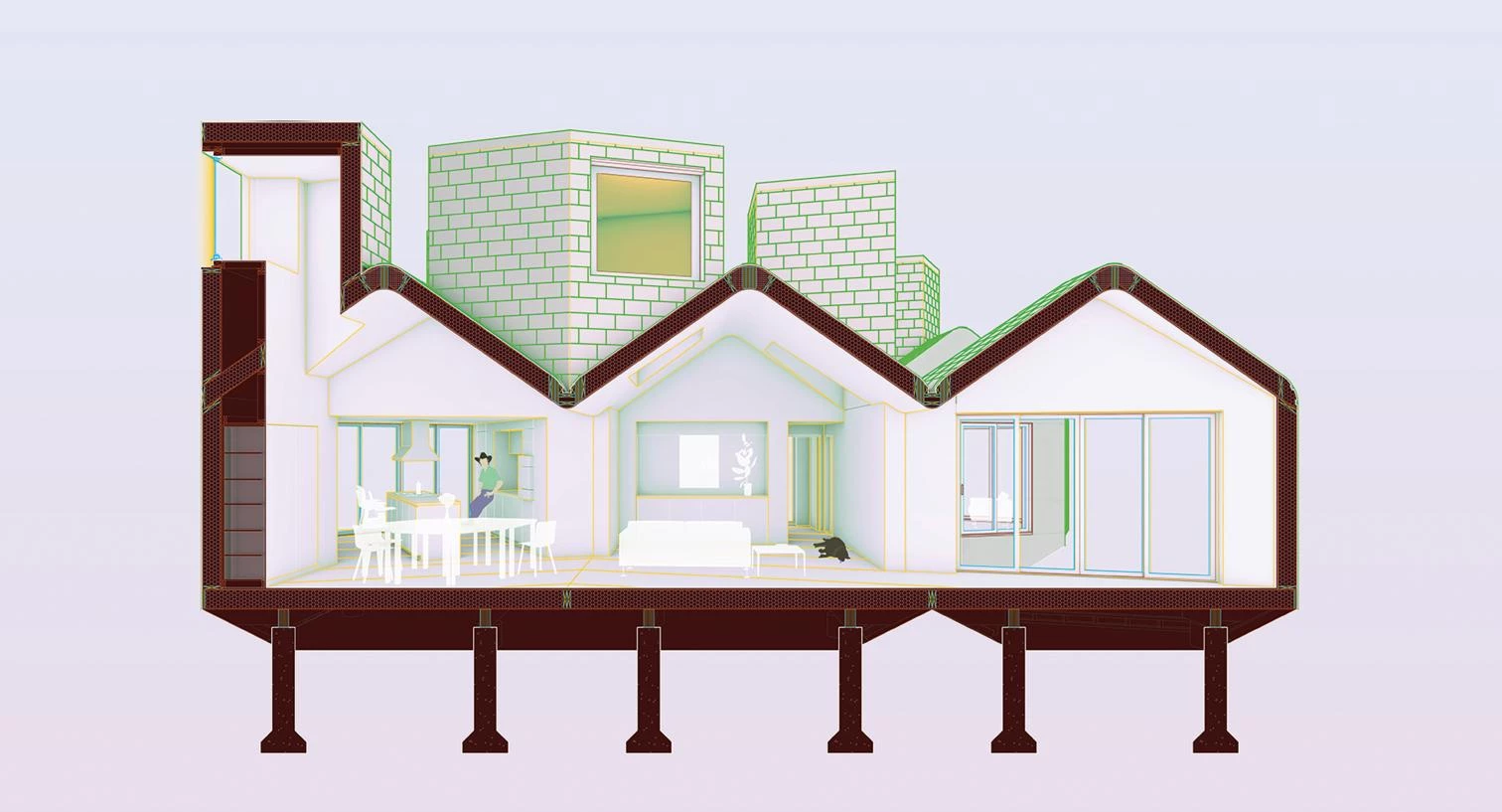El kit de unidades mínimas se basa en la reinterpretación de los elementos de las casas tradicionales estadounidenses, en especial la chimenea, que aquí deja de ser un elemento macizo situado en el corazón del conjunto para convertirse en un gran chimenea solar que, dispuesta en un lateral de la planta, permite la ventilación y deja pasar abundante luz natural al interior, emergiendo de cada uno de los módulos para convertirse en la protagonista formal del conjunto.