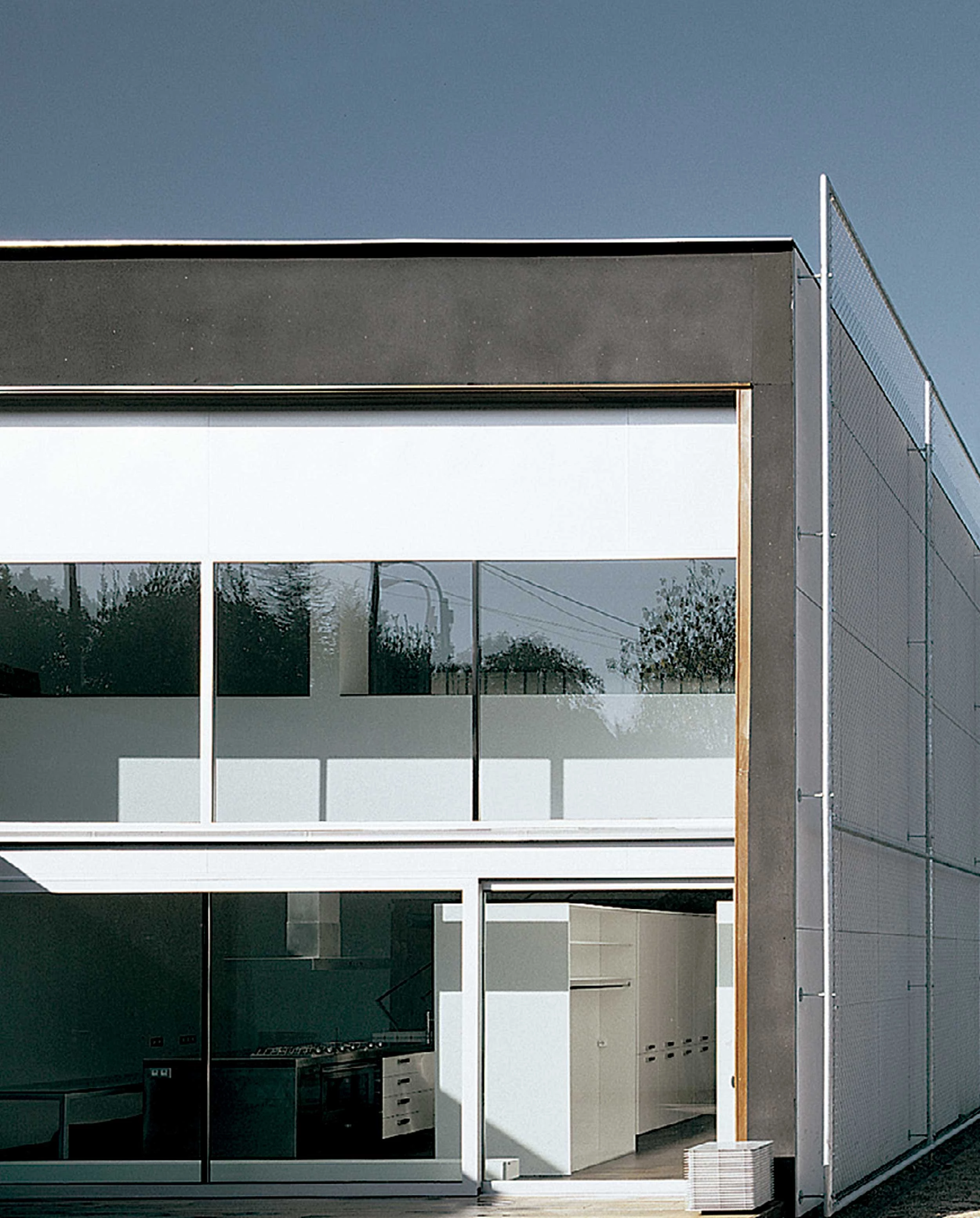 En una parcela trapezoidal, encajado longitudinalmente en el terreno, se plantea un volumen prismático de 25 metros de longitud por 8 de anchura y 5,5 metros de altura, que se relaciona con el exterior a través de dos ‘espacios intercambiadores’ excavados respectivamente en los dos frentes largos del cajón. El primero, que funciona como intercambiador infraestructural entre el viario y el espacio doméstico, consiste en un vestíbulo con paredes de vidrio (U-glass) al que se accede directamente en coche. Un quitamiedos de autopista pone el punto final a la secuencia rodada, y el vehículo ocupa de esta manera un lugar central en la casa. El portón deslizante de vidrio translúcido que cierra este espacio, así como su visión desde las principales estancias vivideras refuerzan su carácter de ‘garaje domesticado’. El segundo ‘intercambiador’, un porche alargado con revestimiento de madera, se abre frontalmente hacia el paisaje del Vallés, con el Montseny al fondo, relacionándolo con el espacio habitado. Los lados cortos del prisma están completamente acristalados, prolongando lateralmente el cuerpo de la casa hacia el jardín, en el que se coloca una piscina protegida por el terreno. Exteriormente, por delante de la piel de fibrocemento que conforma las caras ciegas del cajón, sin llegar a tocarla, se ha dispuesto un bastidor metálico cubierto de malla de acero, por donde ya crece la vegetación que va a dotar al edificio de un aspecto cambiante según las estaciones del año: un interfaz vivo para esta casa-intercambiador...[+]