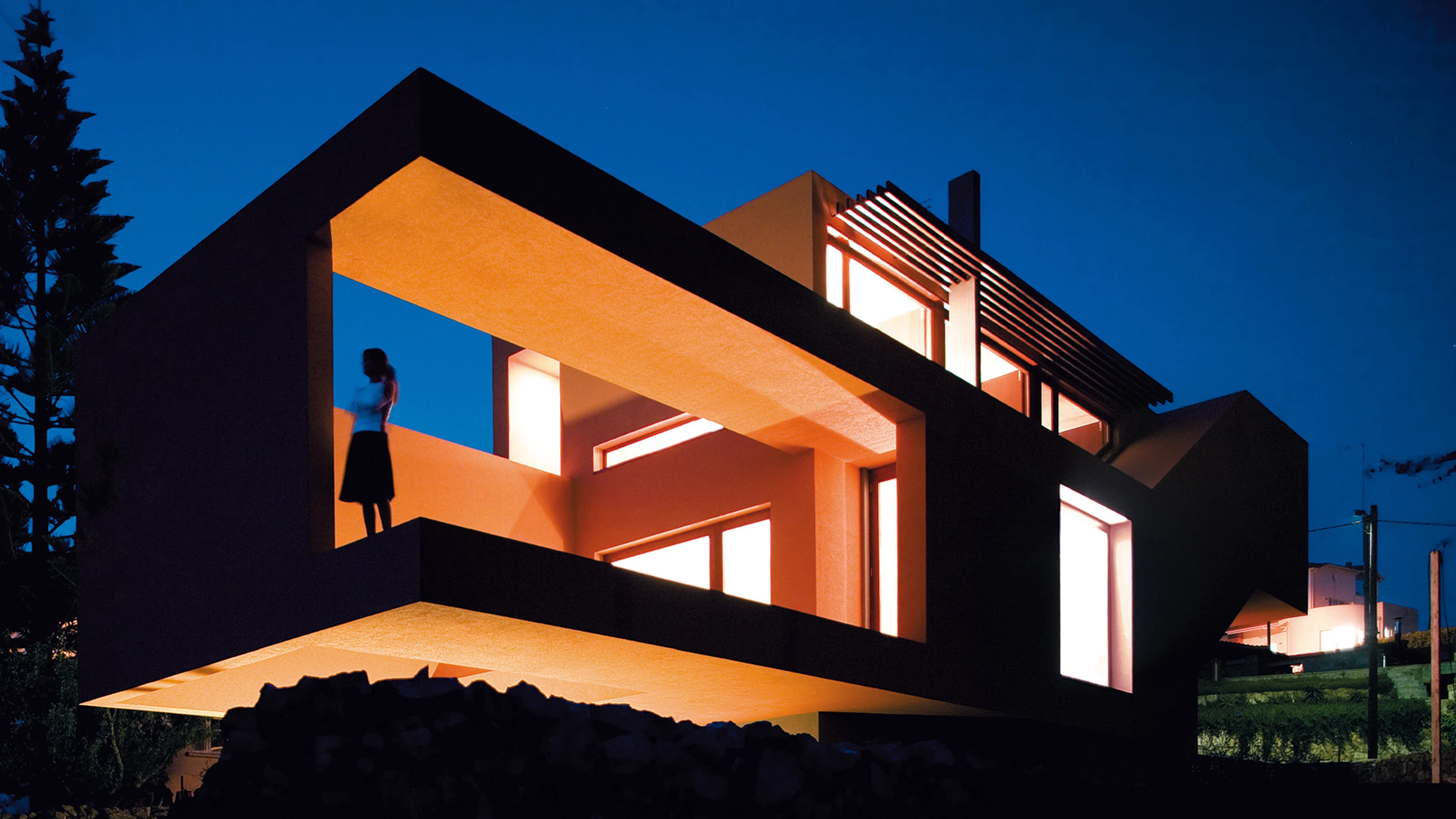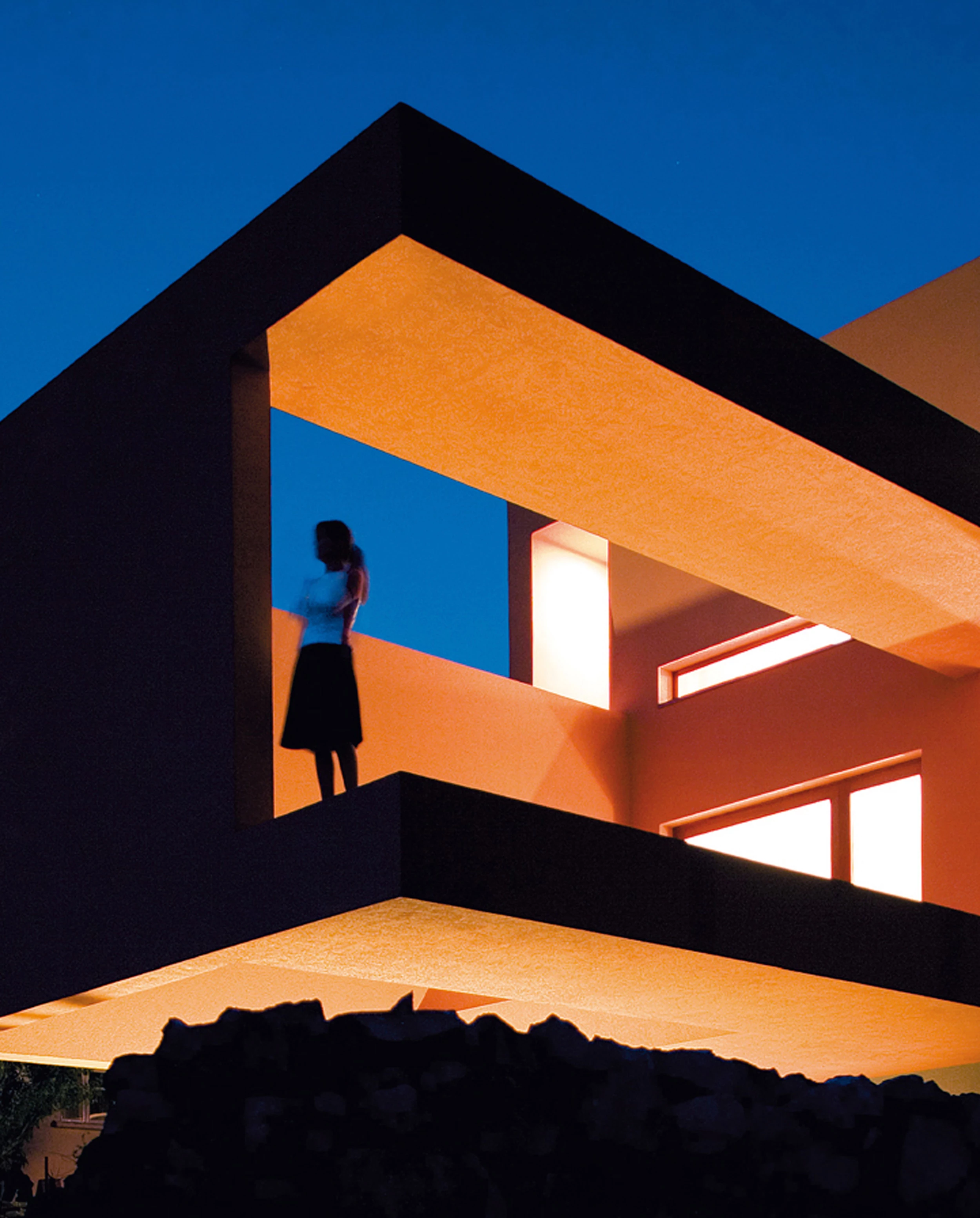 La complicada geometría surgió del deseo de adaptar el edificio a la topografía, minimizando el impacto sobre el paisaje. Para ello se deformó el cubo de dos alturas sobre rasante permitido por la normativa, desplazando horizontalmente las dos plantas superiores: el piso situado más arriba se deslizó hacia el este, proyectándose sobre la puerta de acceso con un volumen opaco en el que sólo se abre un óculo que parece vigilar el vecindario; mientras tanto, el primer nivel se desplaza en dirección oeste, lanzándose al mar por medio de un arriesgado voladizo de ocho metros que se recorta para configurar una terraza balcón suspendida y abierta sobre el jardín, consiguiendo así la desmaterialización vertical de la pieza. Las comunicaciones y los servicios reciben un papel protagonista en la definición formal del edificio al trasladarse al perímetro y configurar un anillo que abraza el núcleo central estructural en el que se ubican los demás espacios de la residencia. Finalmente sobre este introvertido cuerpo escultórico se recortan ventanas con la misma abstracción con la que se diseña la pieza. Estudiados huecos rodeados con marcos de madera encuadran vistas y mantienen en todo momento presente el mar, mientras que dos lucernarios introducen luz natural al corazón de la vivienda.