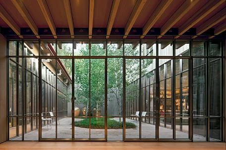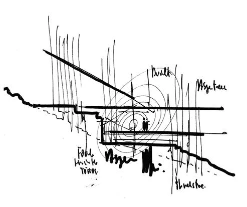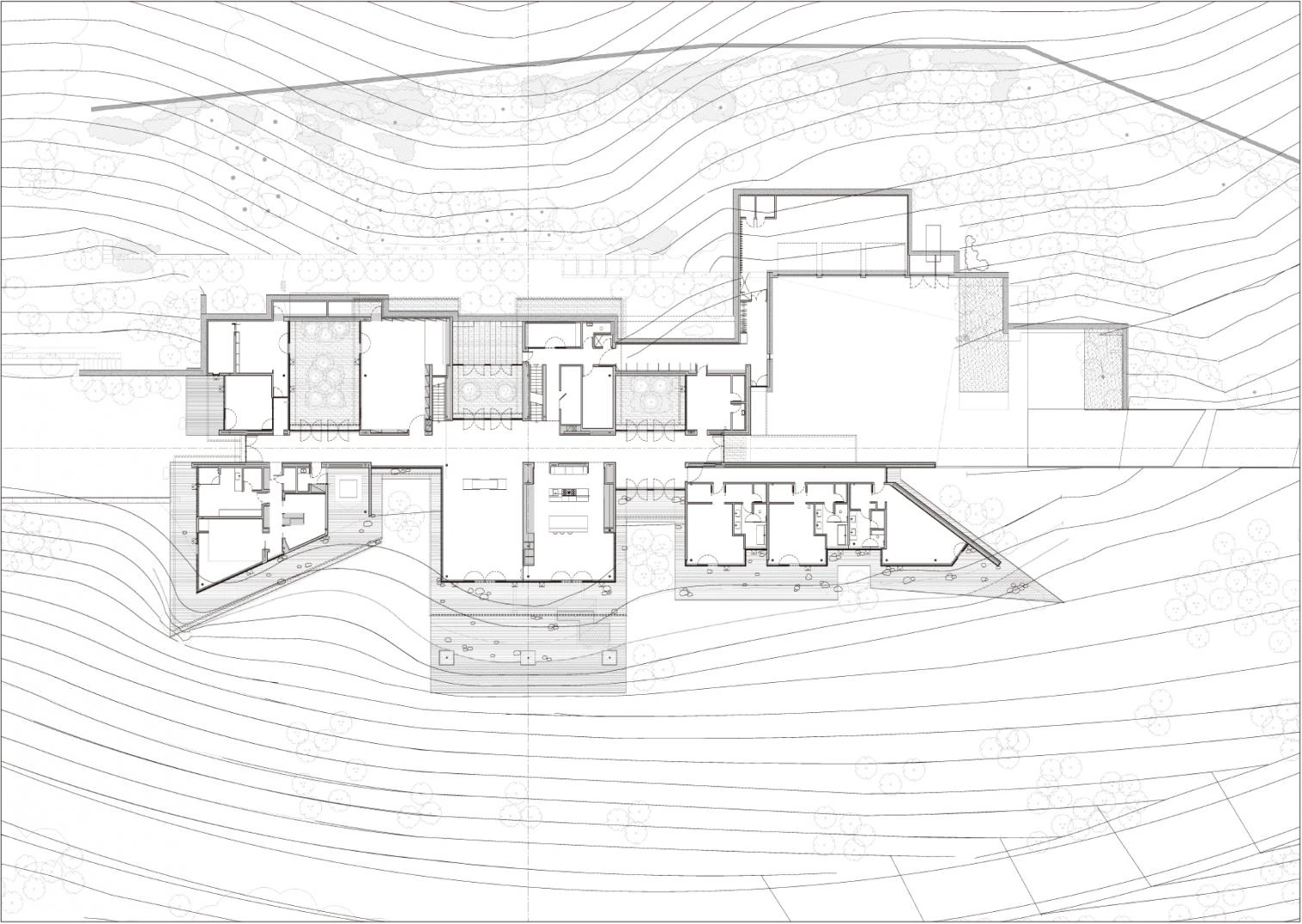 Todos los espacios se conectan a un eje central de 40 metros de longitud: algunos orientándose a las vistas sobre la montaña; la mayoría mirando al valle. Se produce así un recorrido definido por la variedad de las vistas a lo largo del eje: unas, más amplias, hacia el paisaje; otras, más domésticas, hacia patios y jardines interiores. En el centro de la casa, el eje de conexión se ensancha para dar cabida a la sala de estar principal. Desde aquí se accede a dos habitaciones superiores con techos inclinados cuyas ventanas enmarcan el paisaje de la montaña.