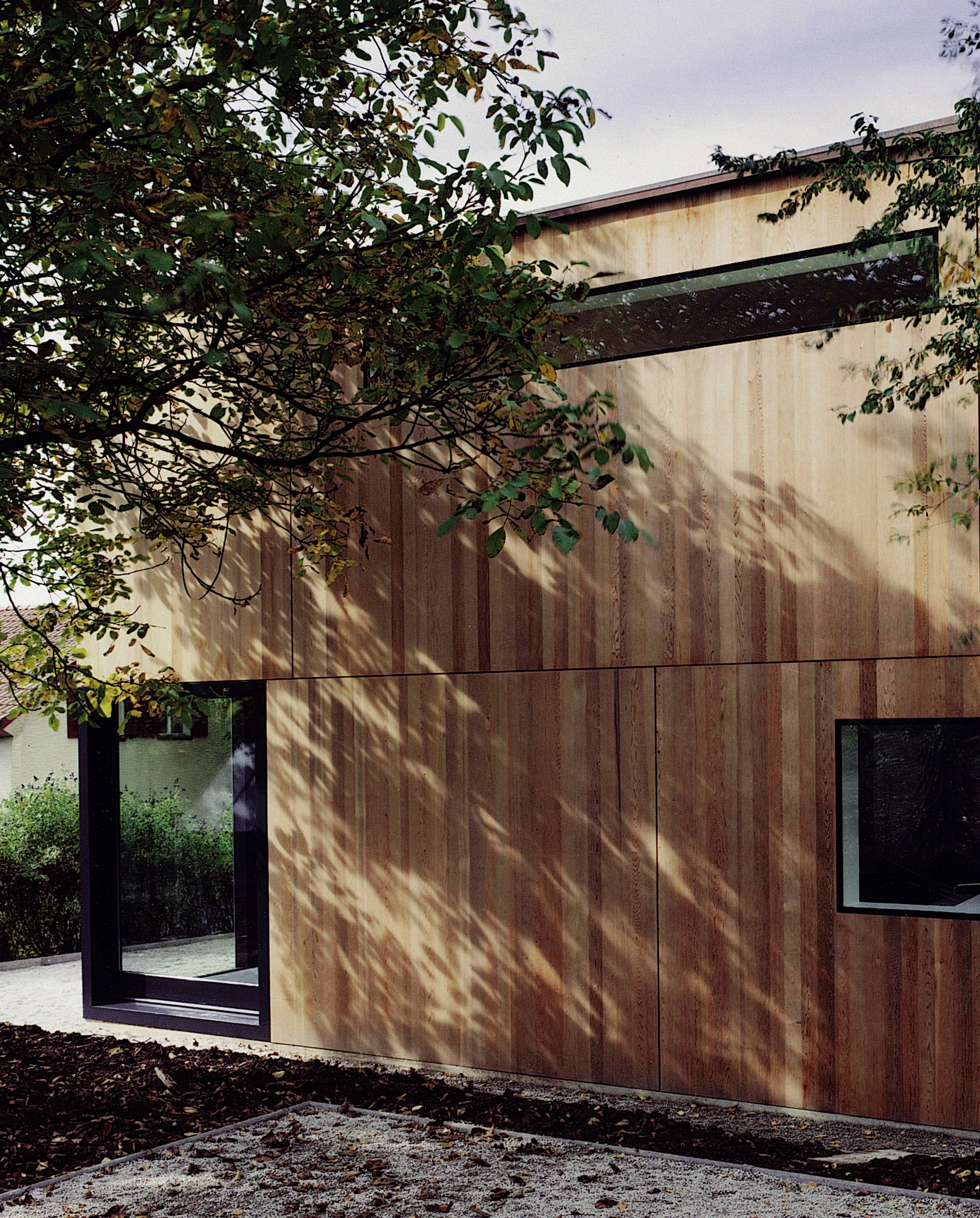 El sistema de construcción por medio de gruesas escuadrías verticales y entramados horizontales de madera permite una distribución libre, puesto que los elementos portantes se disponen en su perímetro para dejar el interior diáfano. Idéntica libertad gozan sus fachadas, en la medida que las carpinterías asumen también una función de soporte, como un montante más de los que componen el esqueleto estructural. Este entramado se reviste con una serie de paneles de cedro, creando un volumen elemental. La voluntad de abstracción queda demostrada también en el modo en que los huecos exteriores se manifiestan como simples planos. Así, la puerta principal no es sino uno más de los paneles de cedro, y las ventanas se componen de partes fijas formadas por simples vidrios aislantes a hueso con el revestimiento exterior de cedro —cuya coincidencia en espesor y planeidad hace que vidrio y madera se fundan en la fachada— y de piezas practicables enmarcadas por carpinterías azul oscuro.