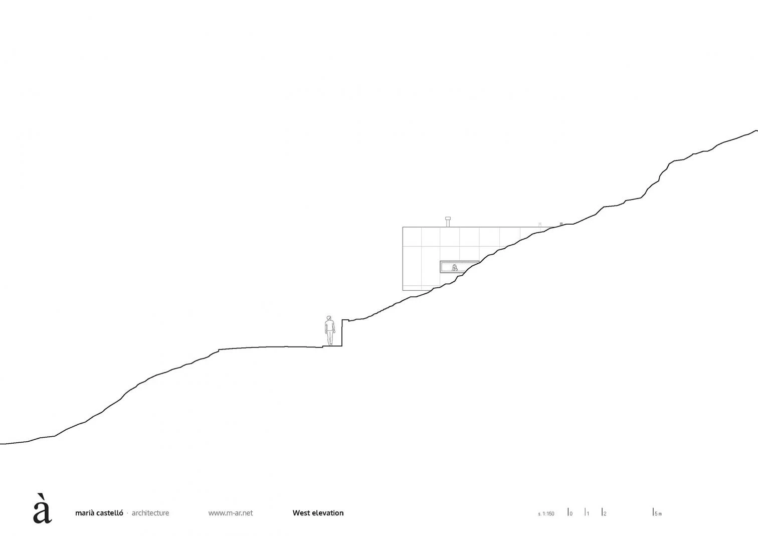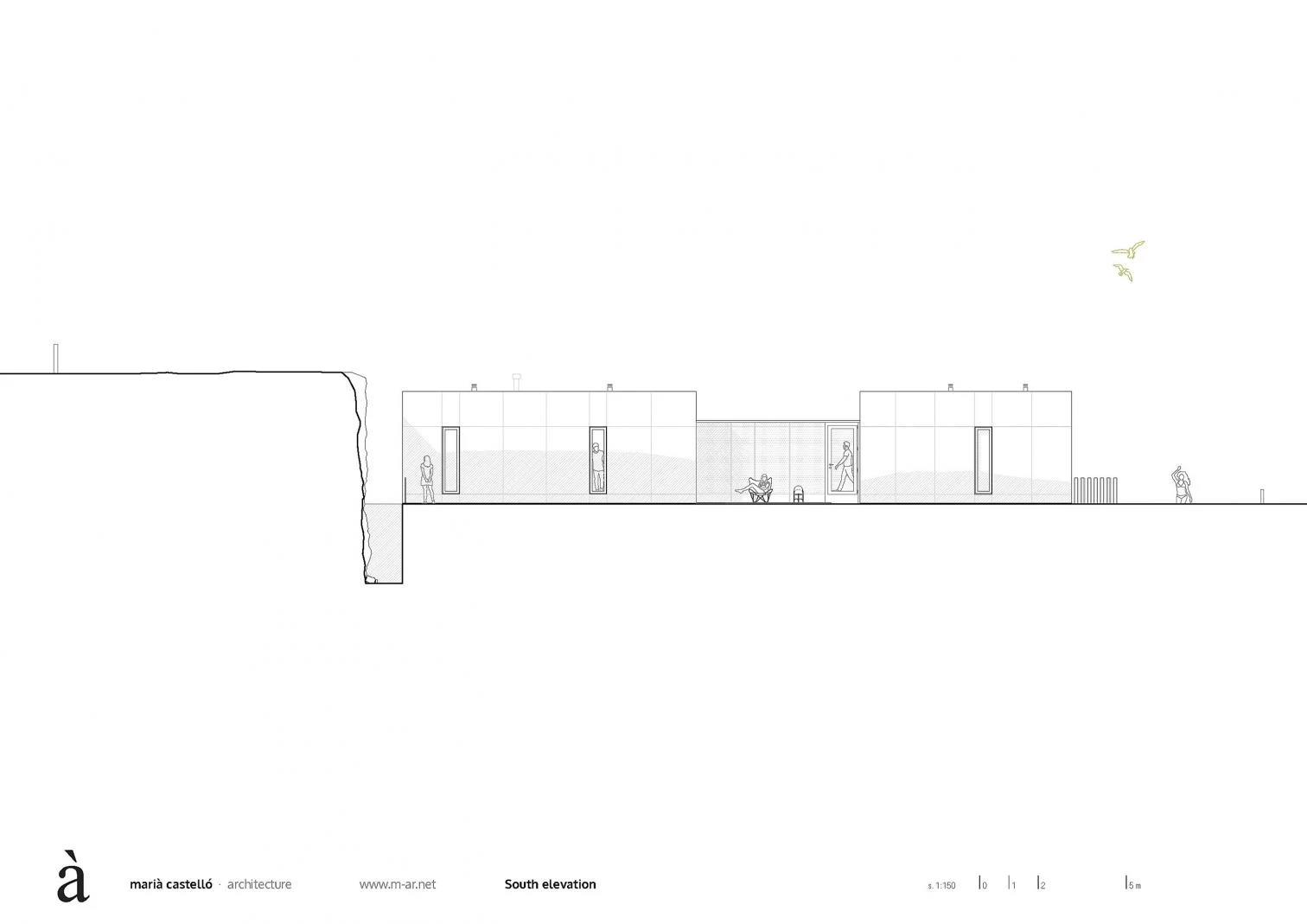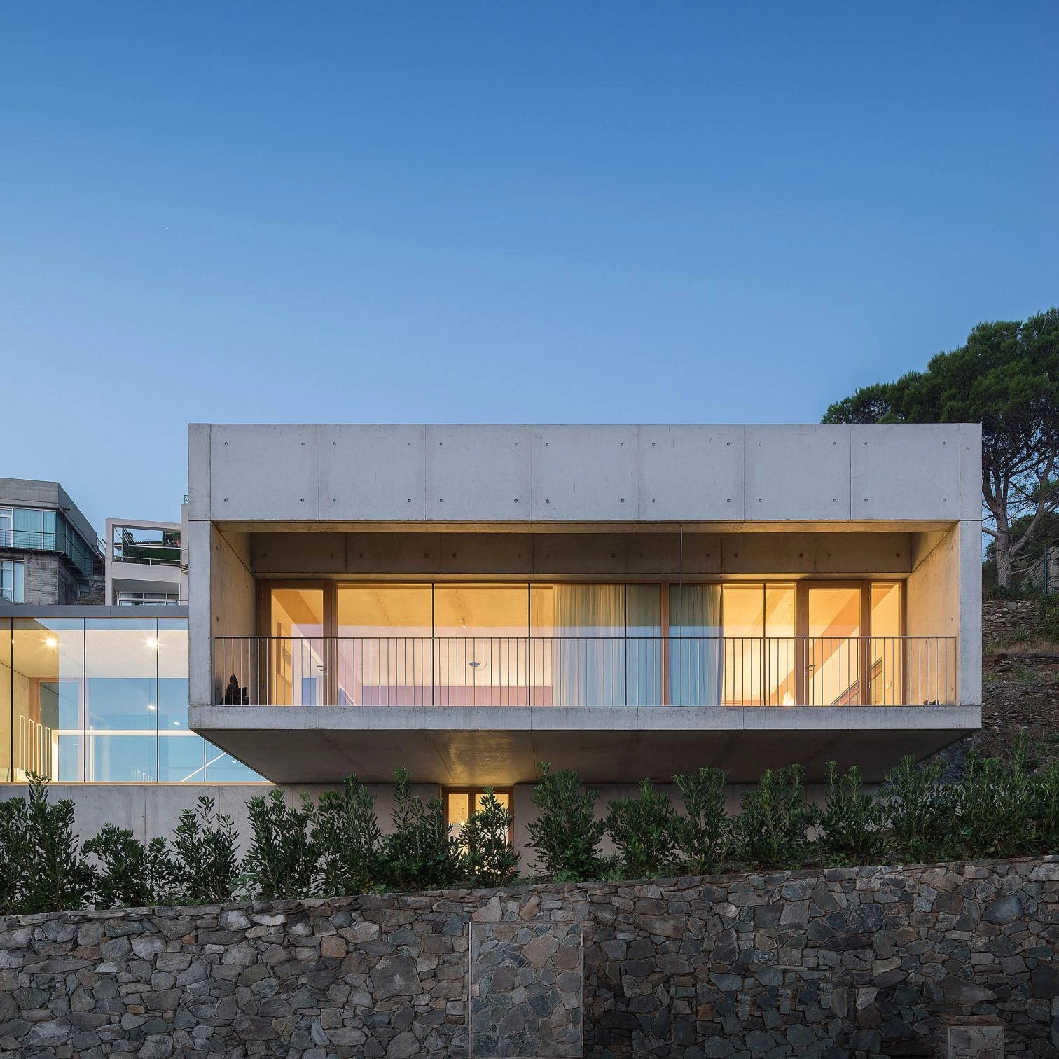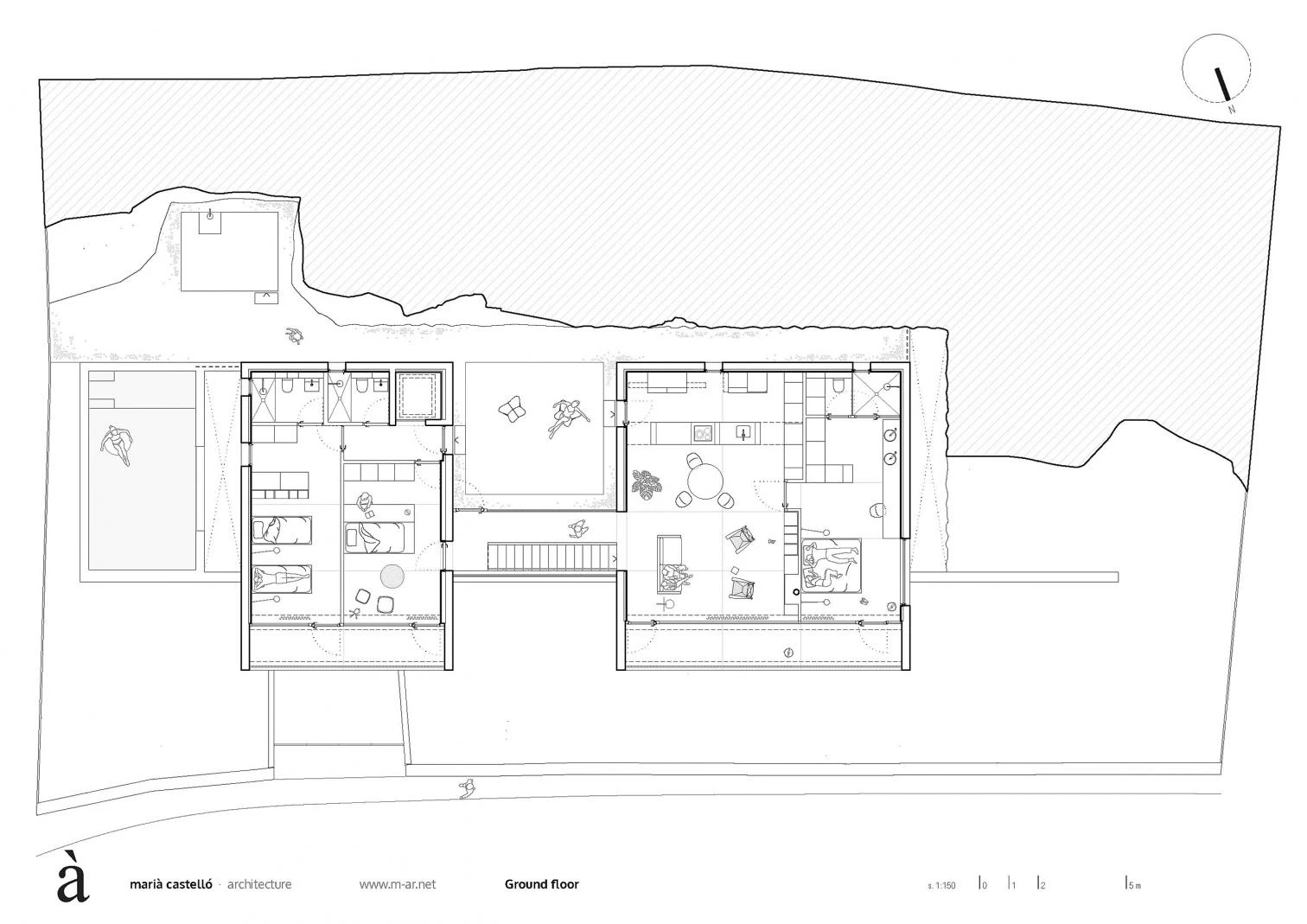 Incrustada en el pórfido oscuro y sobre una pendiente acusada, esta vivienda emerge en la ladera norte del Puig Gros, un pequeño promontorio que protege el puerto del pueblo gerundense de Port de la Selva, en la Costa Brava. Optimizando la orientación solar y las vistas al horizonte marino, la construcción de hormigón y dos alturas fragmenta su nivel superior en dos volúmenes, conectados por un nexo vidriado que actúa como pantalla contra la Tramontana. El nivel inferior establece relaciones más íntimas con el exterior mediante patios.