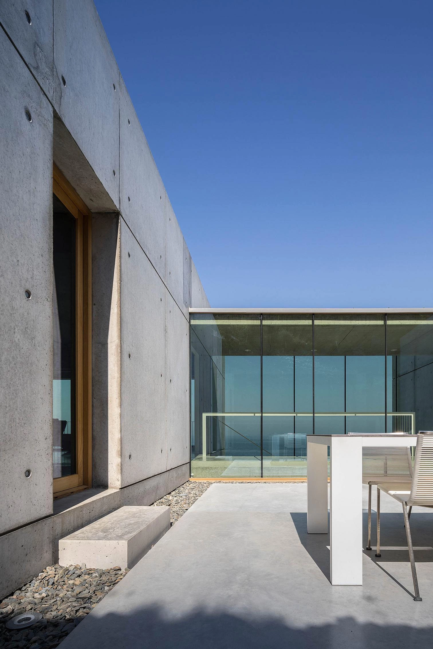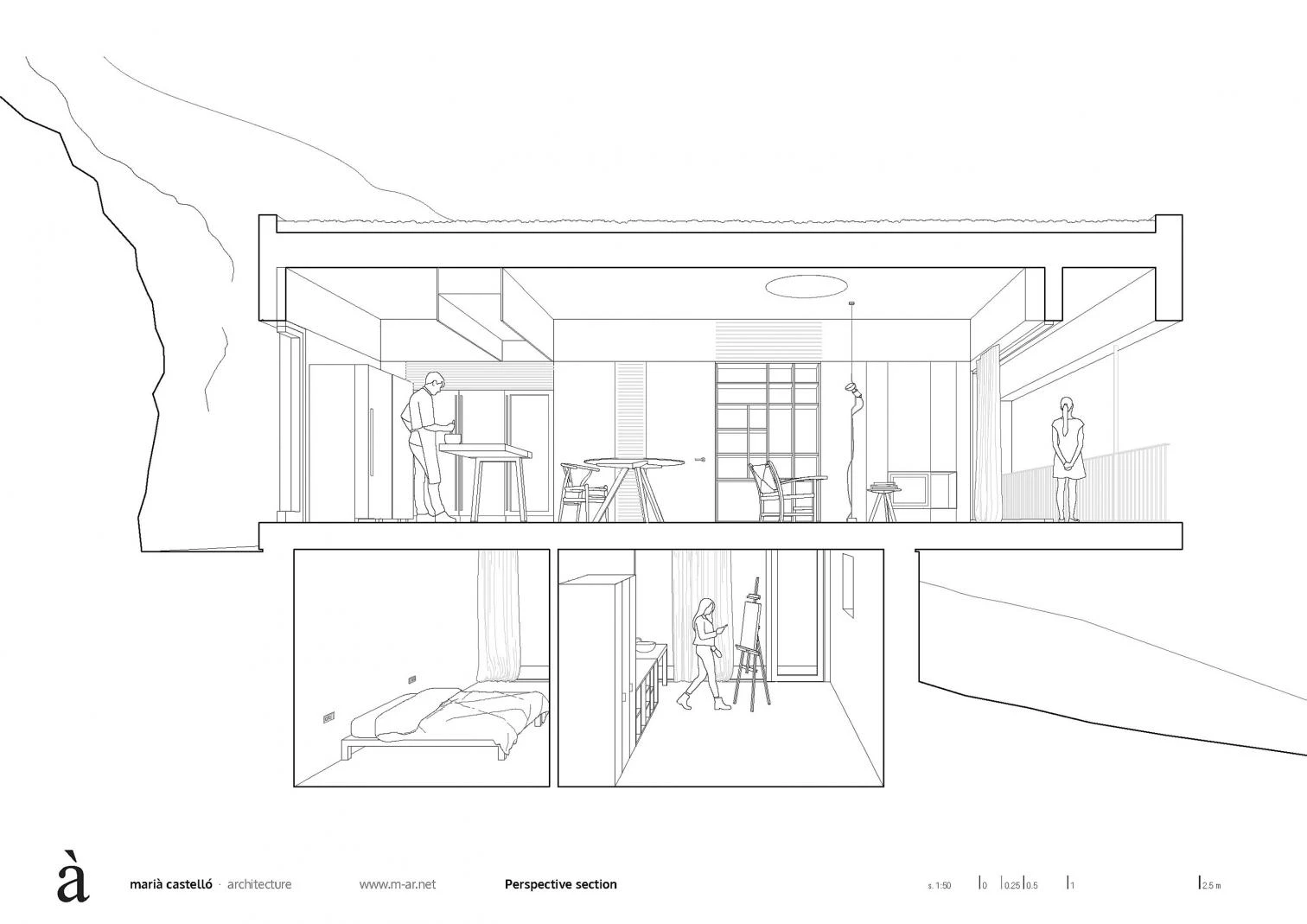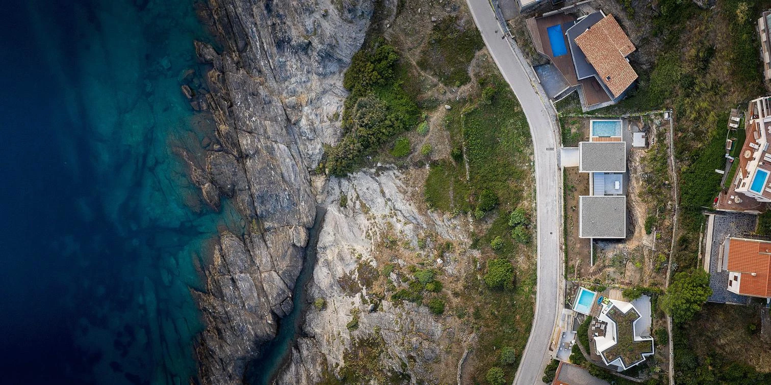 Incrustada en el pórfido oscuro y sobre una pendiente acusada, esta vivienda emerge en la ladera norte del Puig Gros, un pequeño promontorio que protege el puerto del pueblo gerundense de Port de la Selva, en la Costa Brava. Optimizando la orientación solar y las vistas al horizonte marino, la construcción de hormigón y dos alturas fragmenta su nivel superior en dos volúmenes, conectados por un nexo vidriado que actúa como pantalla contra la Tramontana. El nivel inferior establece relaciones más íntimas con el exterior mediante patios.