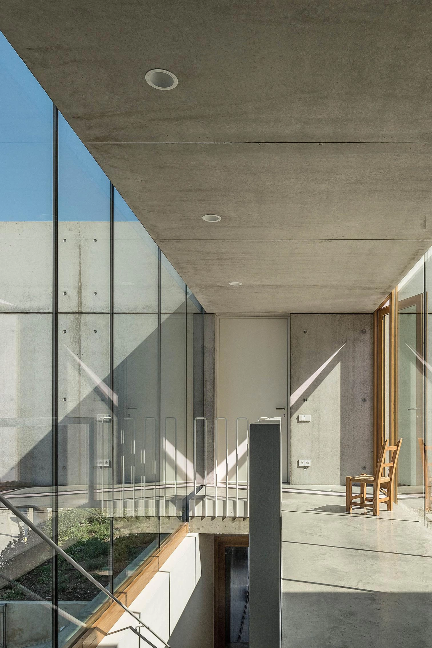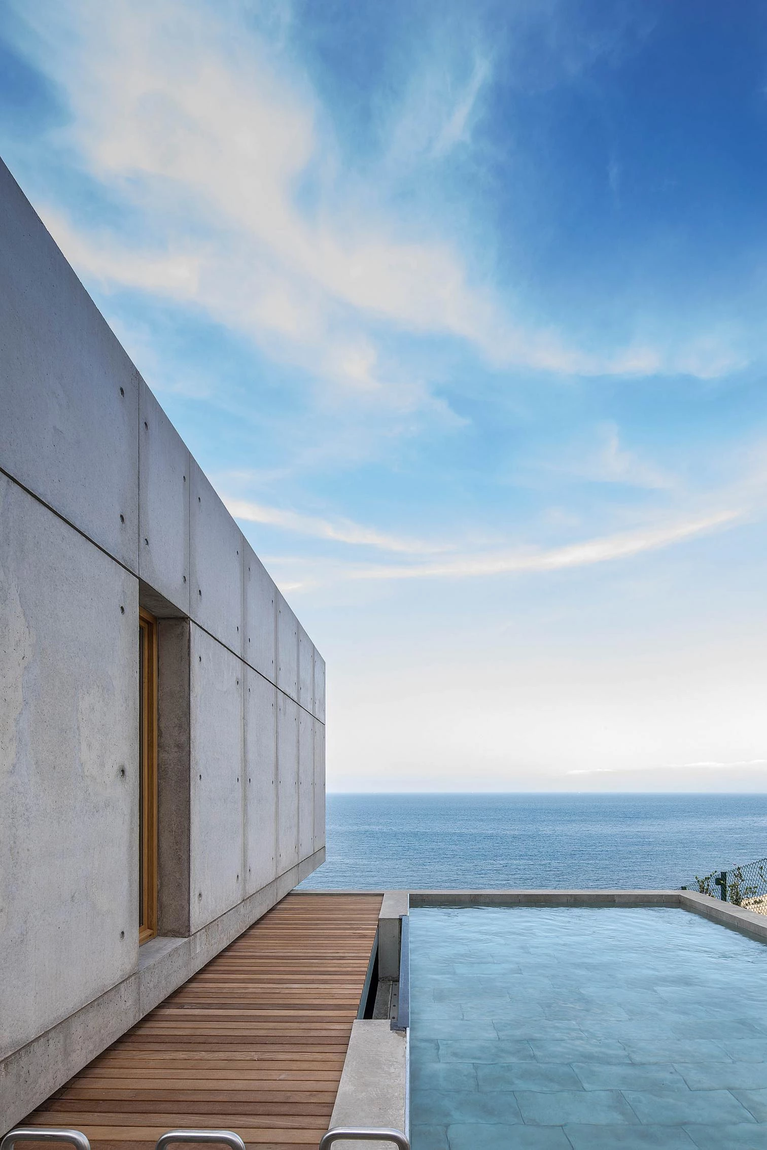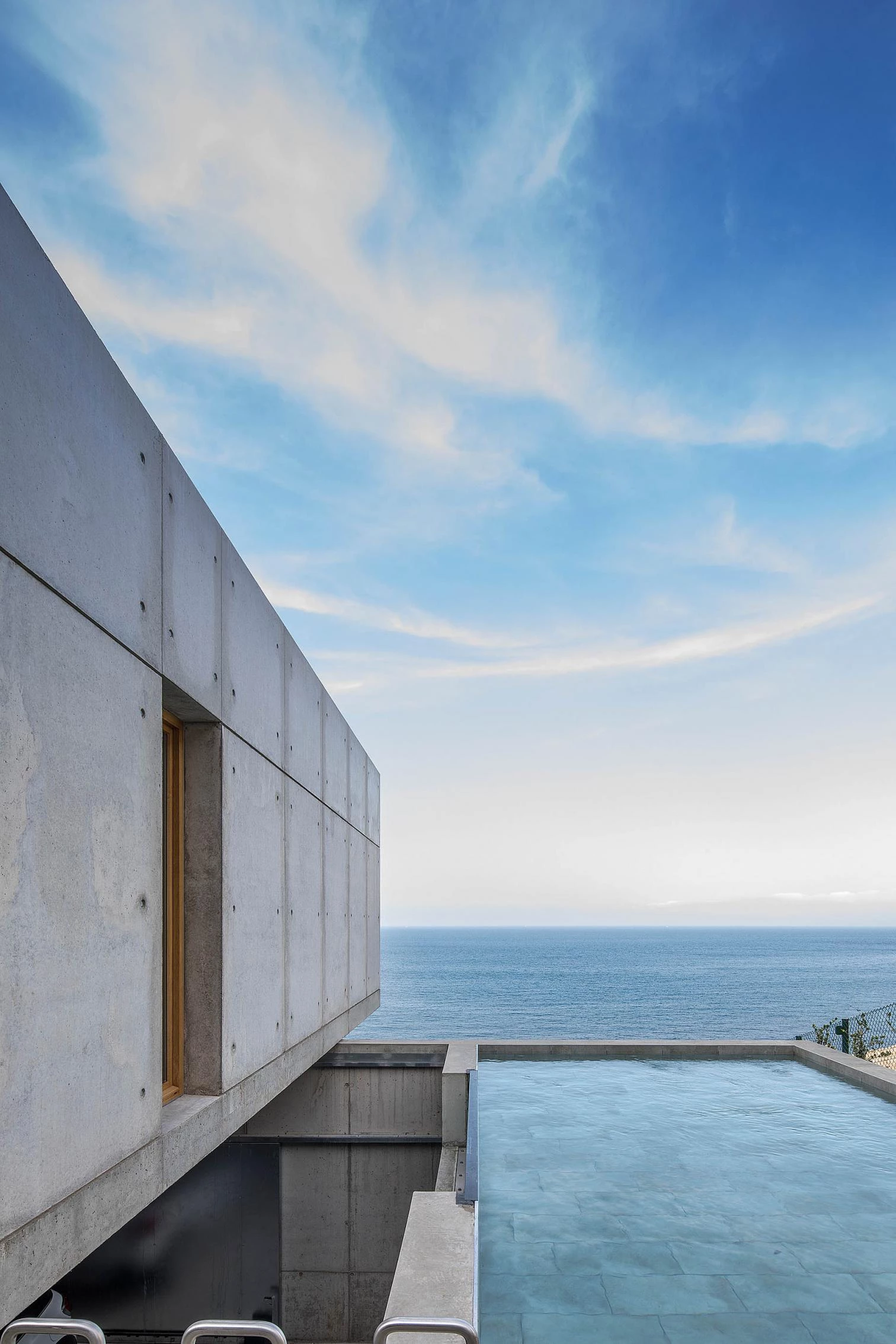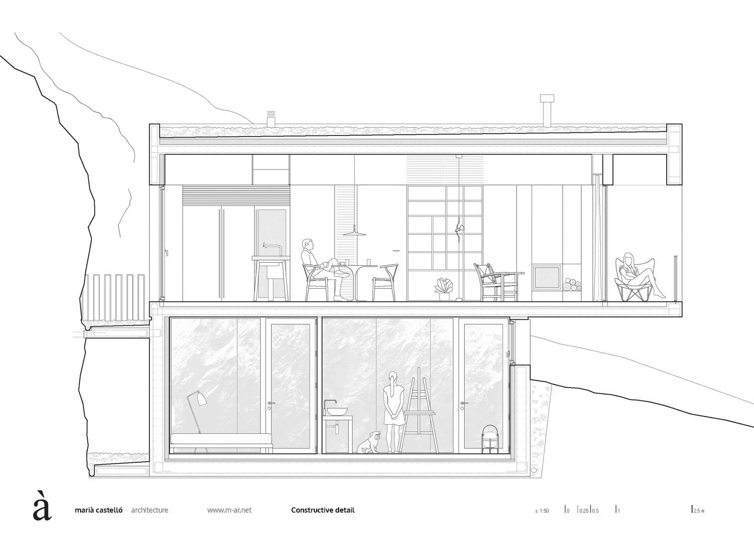 Incrustada en el pórfido oscuro y sobre una pendiente acusada, esta vivienda emerge en la ladera norte del Puig Gros, un pequeño promontorio que protege el puerto del pueblo gerundense de Port de la Selva, en la Costa Brava. Optimizando la orientación solar y las vistas al horizonte marino, la construcción de hormigón y dos alturas fragmenta su nivel superior en dos volúmenes, conectados por un nexo vidriado que actúa como pantalla contra la Tramontana. El nivel inferior establece relaciones más íntimas con el exterior mediante patios.