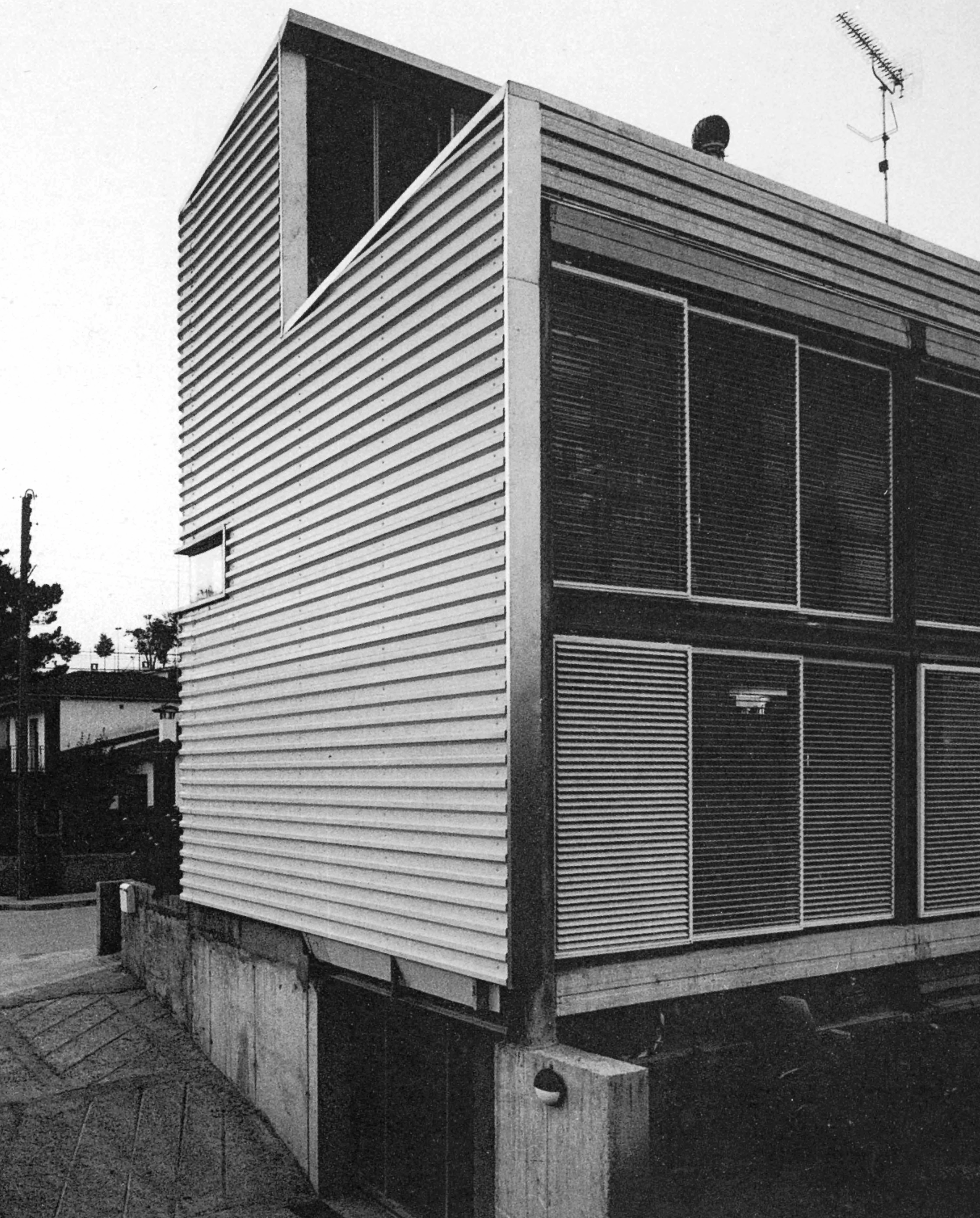 La vivienda se presenta como un volumen abierto por completo a las vistas del sur y aparentemente cerrado a las demás orientaciones. Para conseguir esta apariencia de superficie cerrada, se ha recurrido a cubrir los huecos con chapa perforada del mismo perfil y color que la de cerramiento, transparente desde el interior pero opaca al exterior durante el día. Por la noche, la iluminación interior hace que la piel se vuelva traslúcida en las áreas de los huecos. En contraste con esta aparente opacidad, la fachada sur está formada por grandes cristaleras fijas con portillas de ventilación, frente a las cuales se han dispuesto persianas móviles de aluminio, creando un plano continuo separado 50 centímetros del vidrio. Este espacio intermedio transitable constituye una cámara abierta que actúa como cojín térmico y estimula la ventilación cruzada en verano.