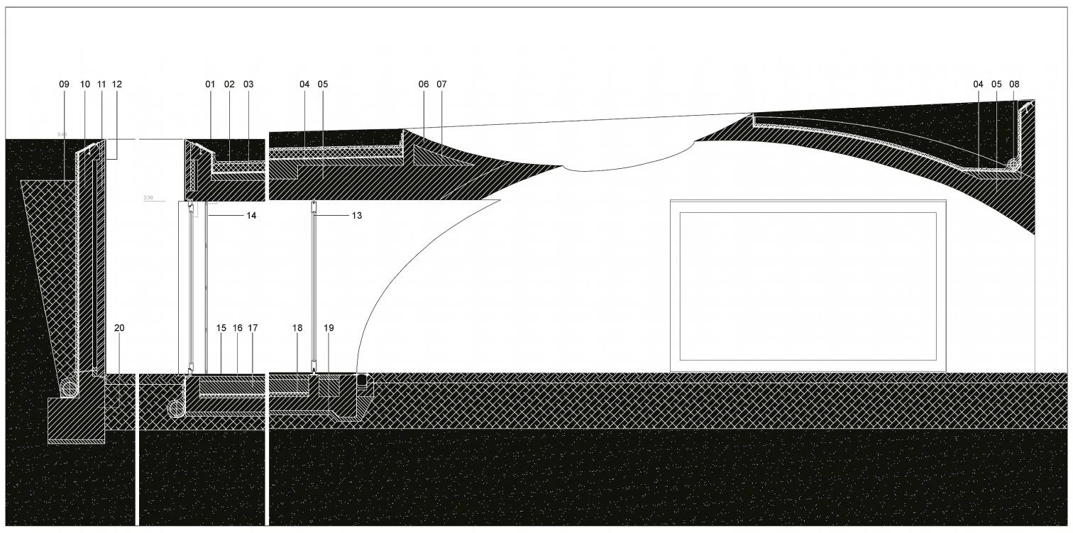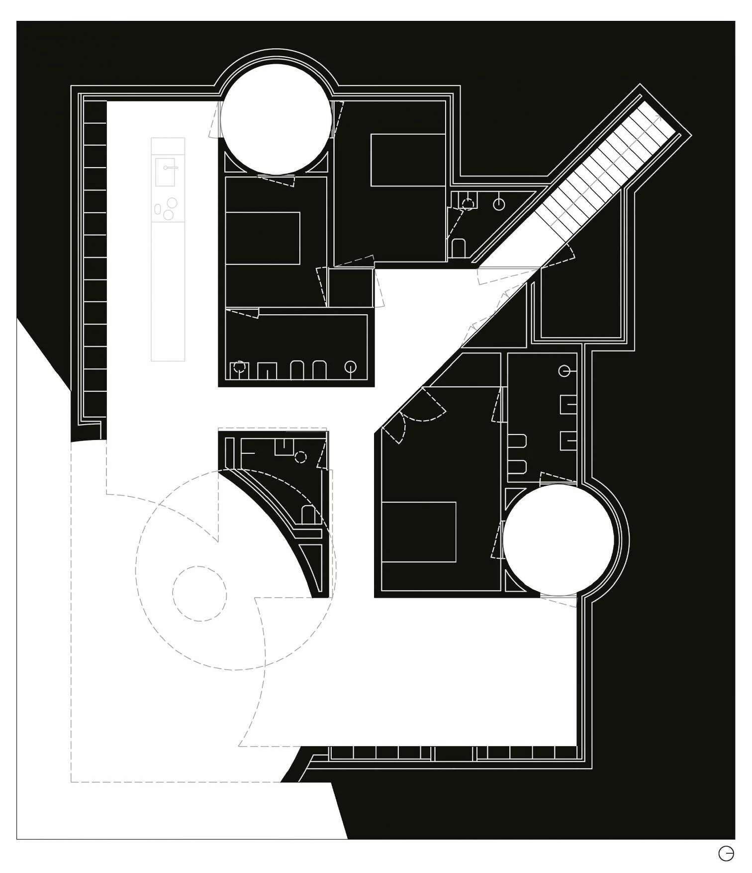 En medio de este paraje apenas se vislumbra esta casa de vacaciones que se encastra en el terreno aprovechando la pendiente de la colina. Se trata de una construcción que busca pasar desapercibida y, al mismo tiempo, hacer frente a la inmensidad del lago. El primer objetivo se alcanza gracias a implantación de una cubierta vegetal que desdibuja los límites del edificio, tan sólo las escaleras y los patios insinúan su presencia. Por otro lado, frente a la escala del paisaje el proyecto requiere un lugar de recogimiento de escala doméstica. Para ello aprovecha la pendiente del solar y proyecta una cúpula que cubre el centro de la vida de la casa: un espacio sombreado y abierto a las vistas del lago, alrededor del cual se disponen las zonas más públicas de la vivienda; mientras que los dormitorios, más introvertidos, se abren a patios circulares revestidos de piezas cerámicas blancas.